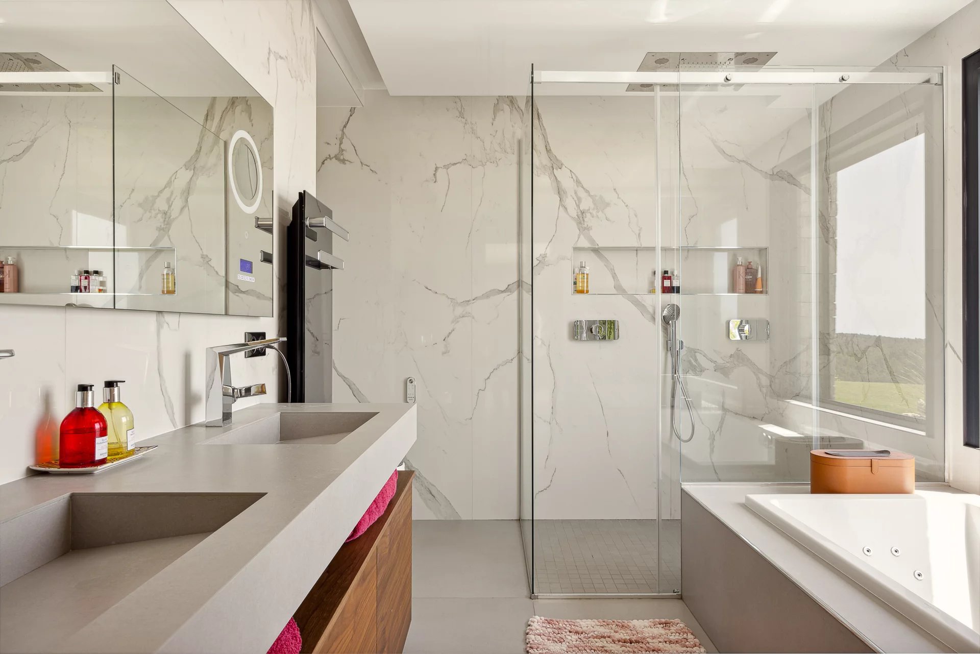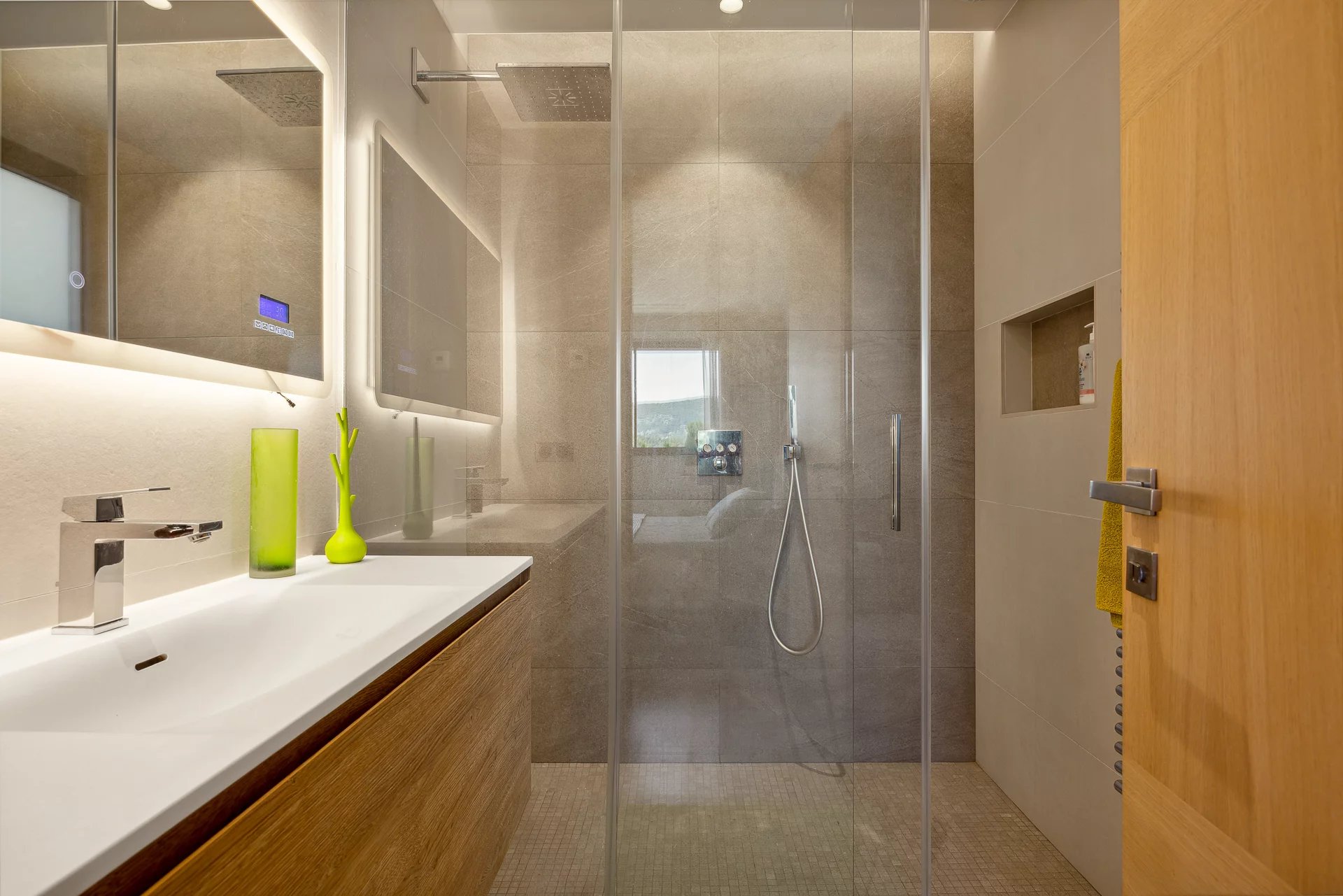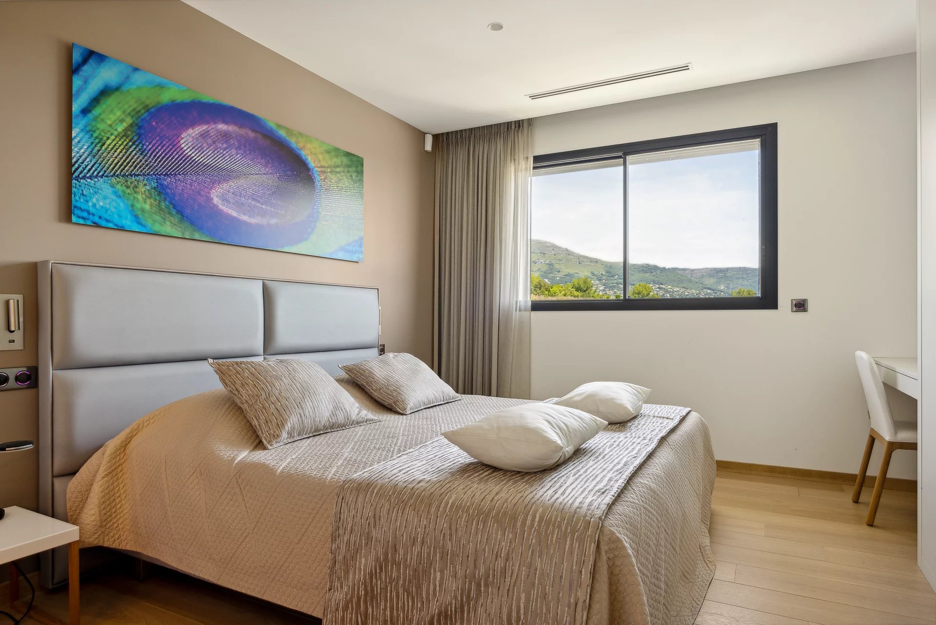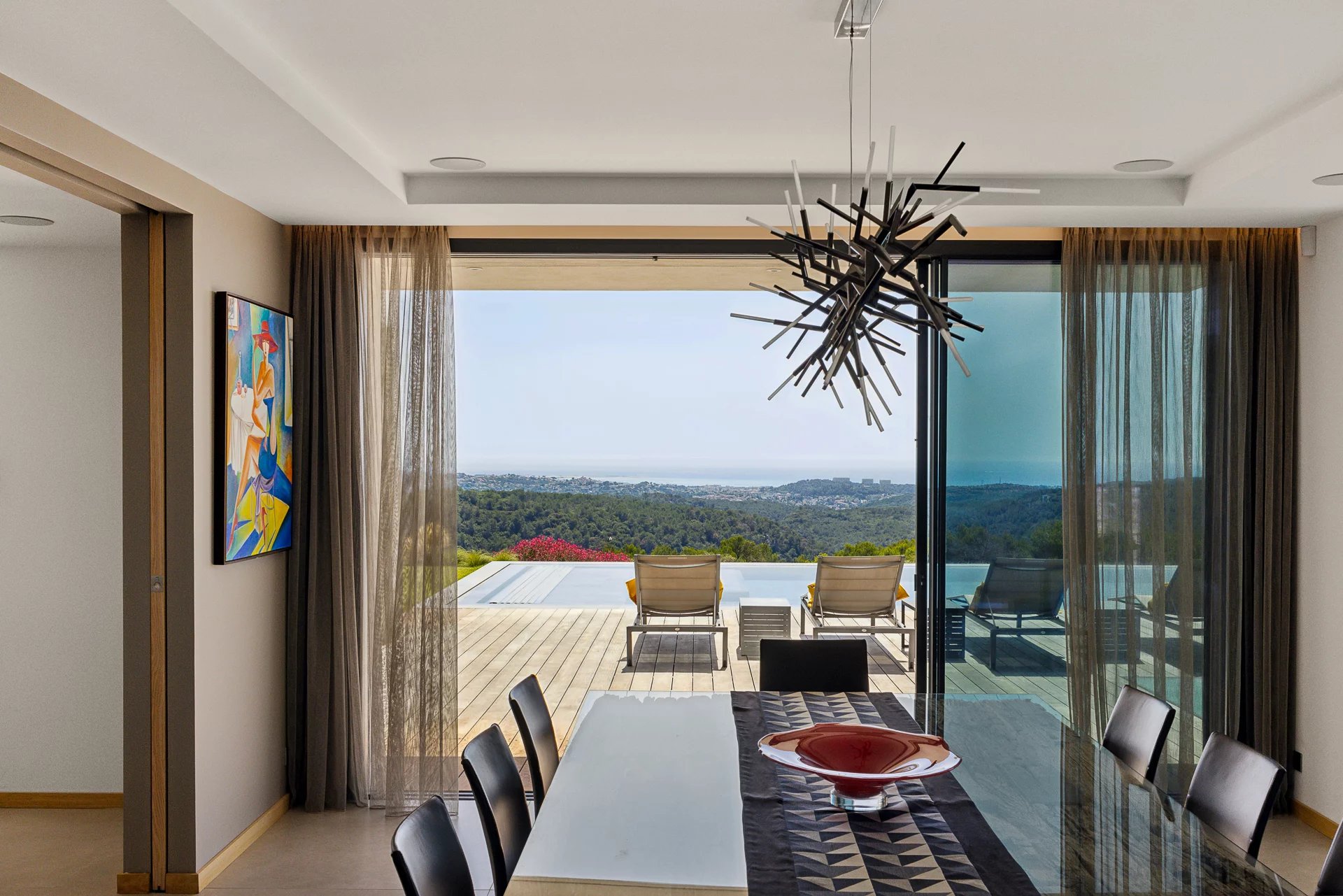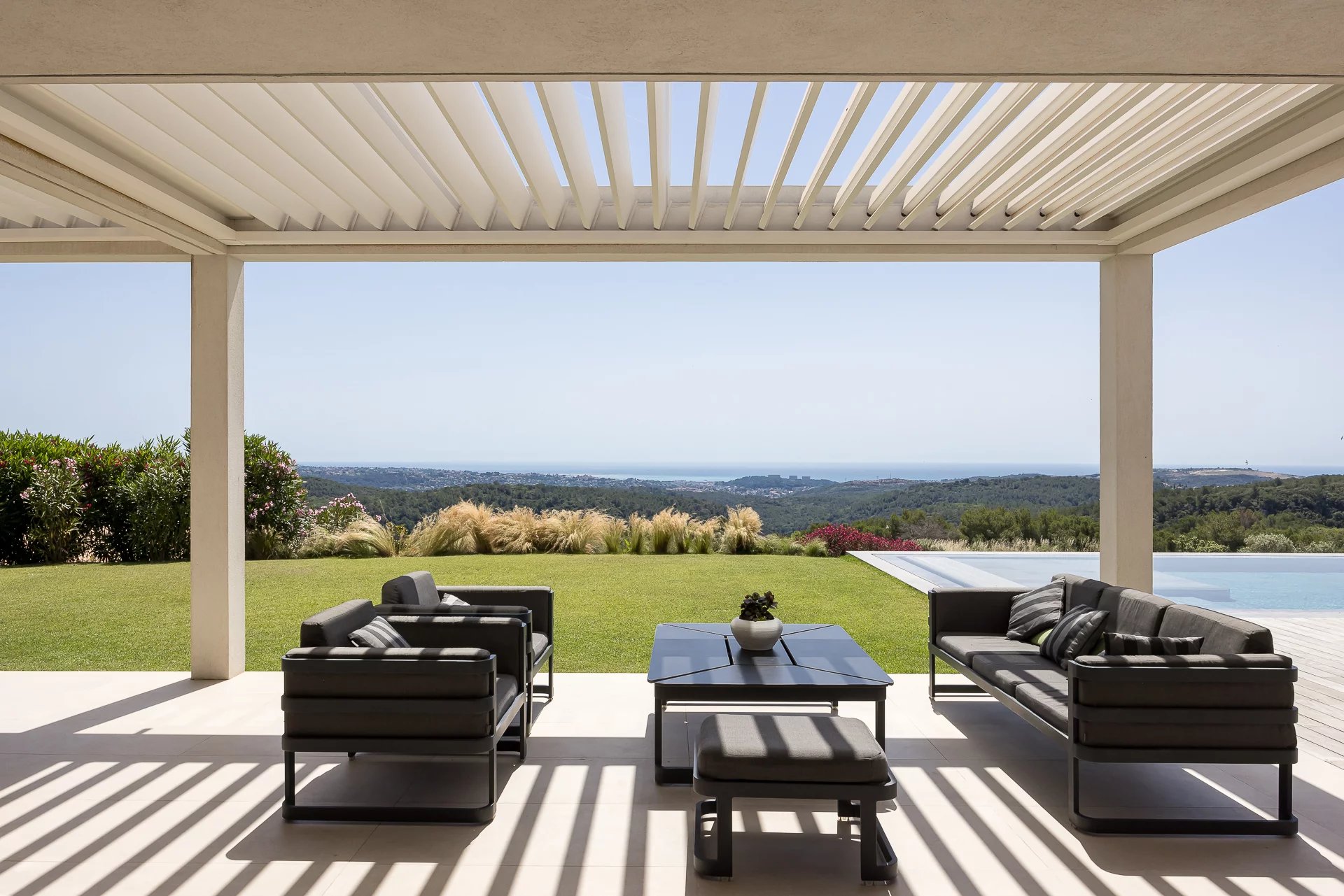 Diese moderne Villa liegt nur 25 Minuten vom internationalen Flughafen Nizza entfernt und bietet einen atemberaubenden Blick auf das Meer und die Hügel.