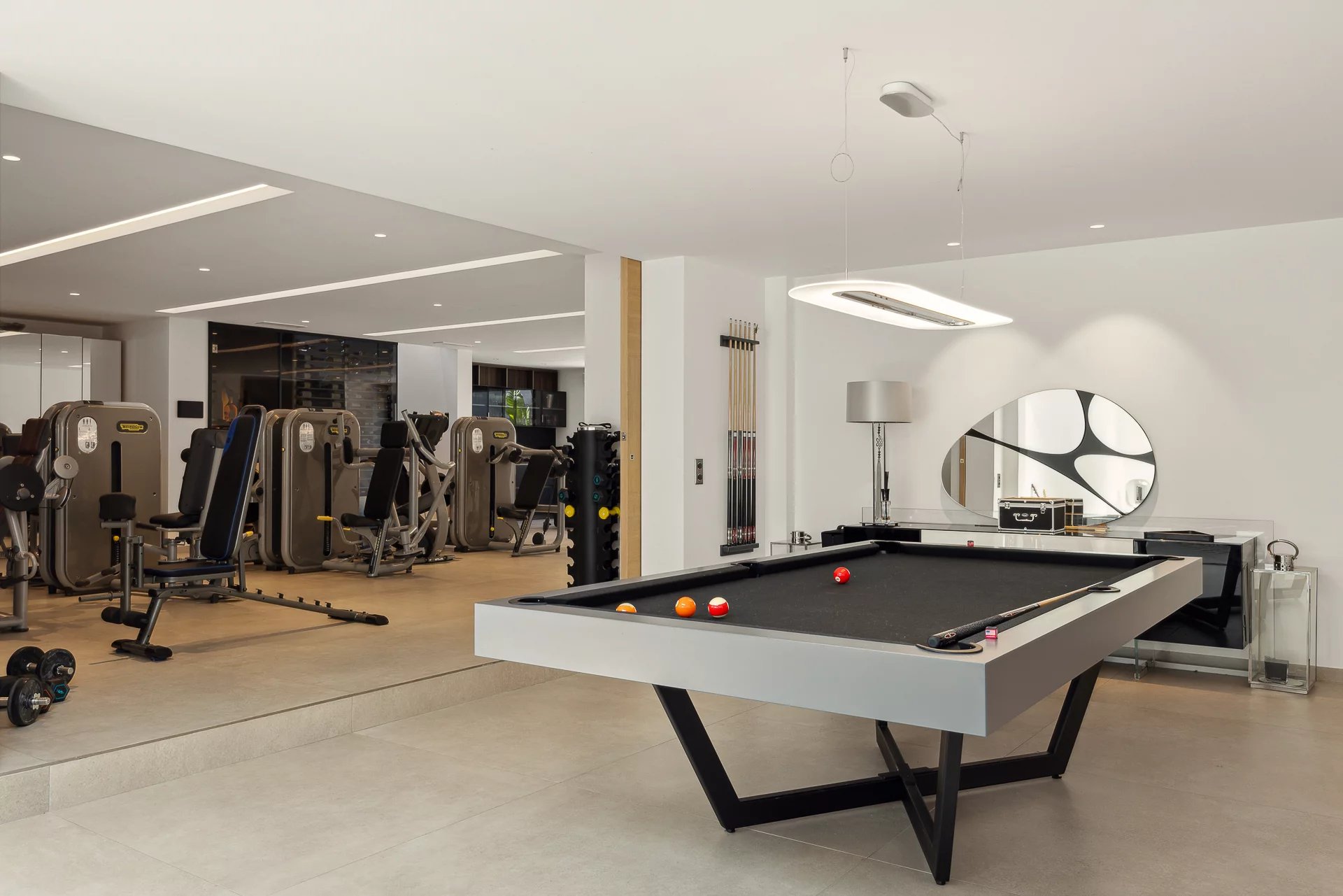 Überdachte Terrasse mit Sommerküche, Spiegelpool (14x4,5m), Parkplätze und große Garage, Fitnessraum, Klimaanlage.