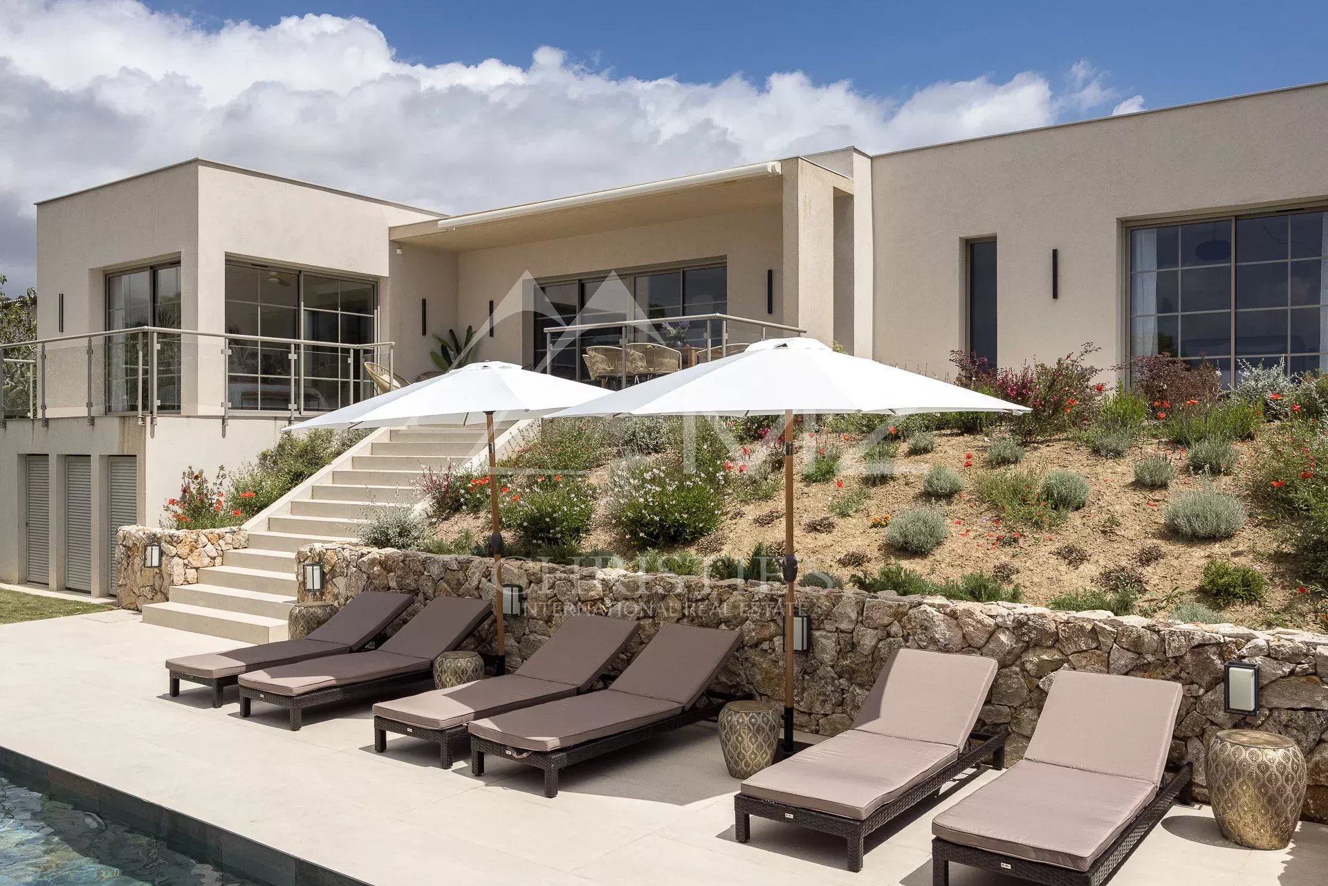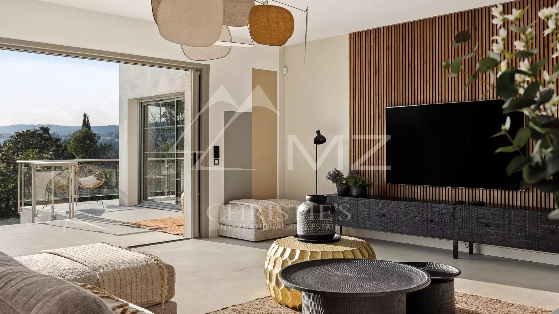 In dominanter Lage, nur wenige Minuten vom Dorf Saint-Paul-de-Vence entfernt, befindet sich dieses neue Anwesen mit Blick auf die umliegenden Hügel.