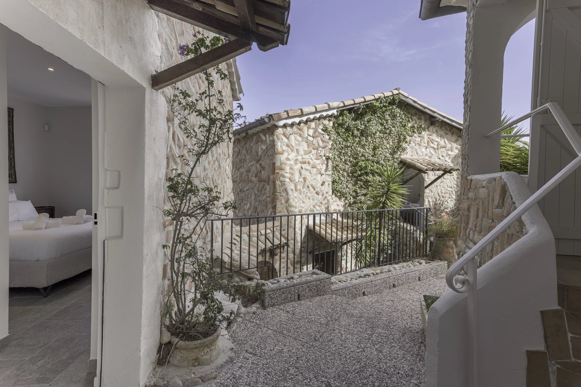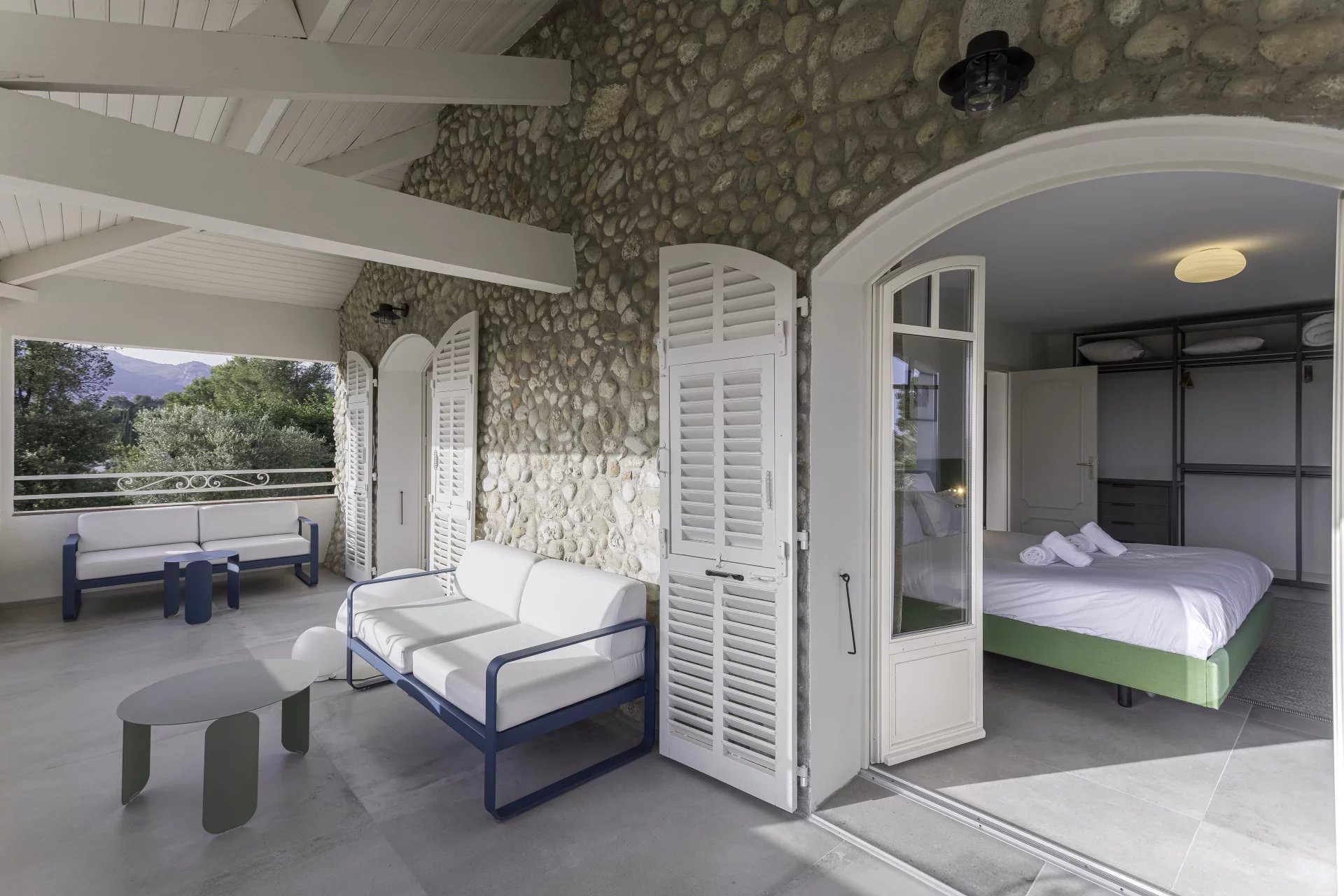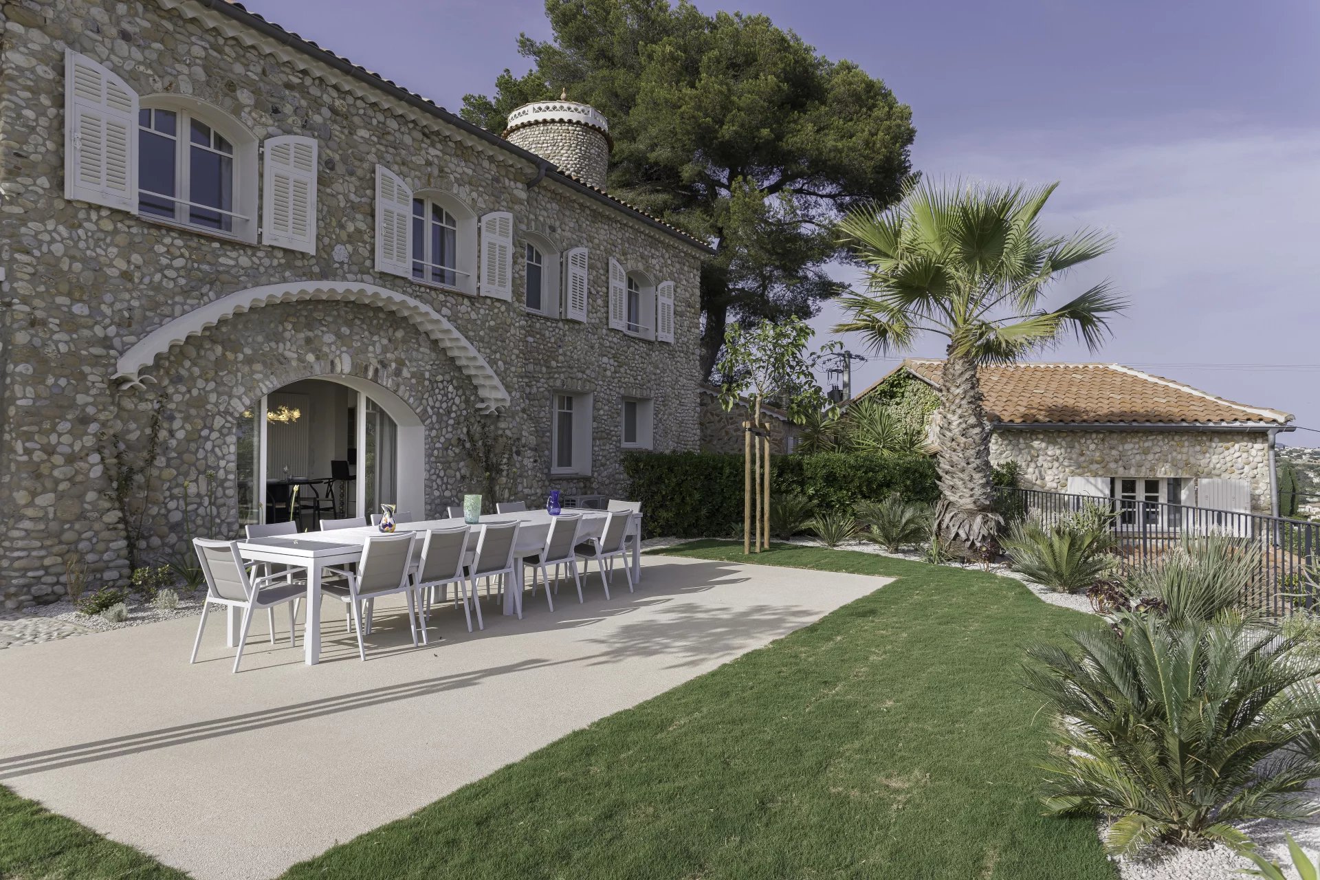 Auf einem Grundstück von etwa einem Hektar mit einem 16,5x6,5 m großen Pool, einem Karpfenteich, einem Bouleplatz und Parkplätzen bietet diese kürzlich renovierte Steinvilla einen herrlichen Panoramablick auf das Dorf Saint-Paul-de-Vence, das Meer und die Berge.
