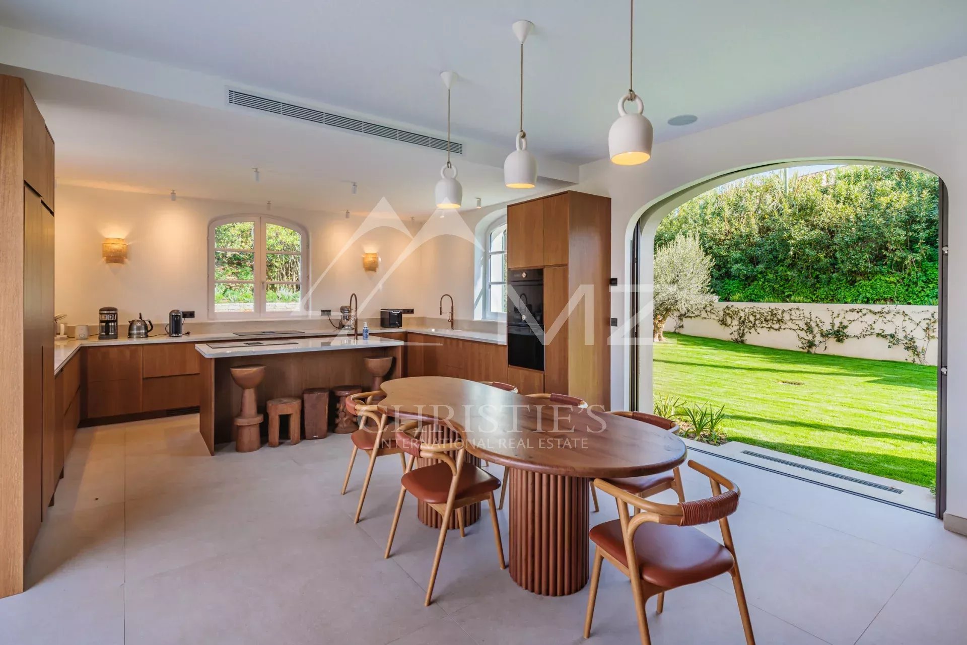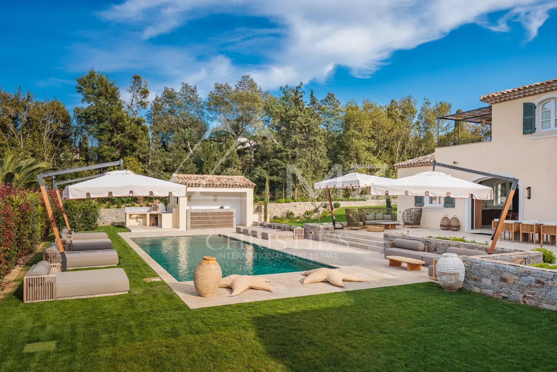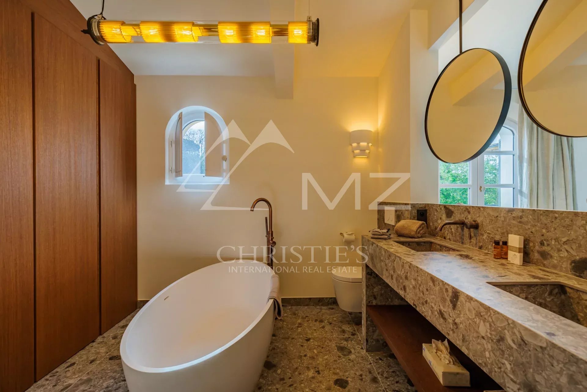 Es verfügt über ein Wohnzimmer, das sich zu einem Garten mit Bäumen und einem schönen Pool hin öffnet, eine Küche, ein Esszimmer, 6 Schlafzimmer en suite, einen Fitnessraum, einen Kinosaal, ein Dampfbad, einen Massageraum und 2 Garagen.