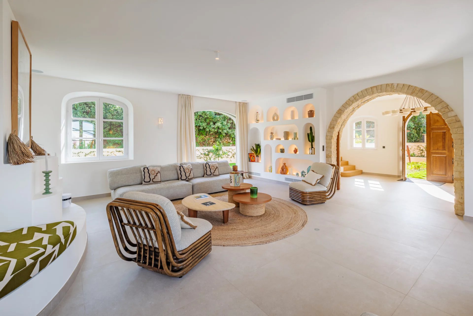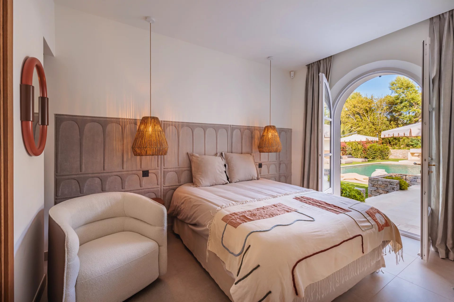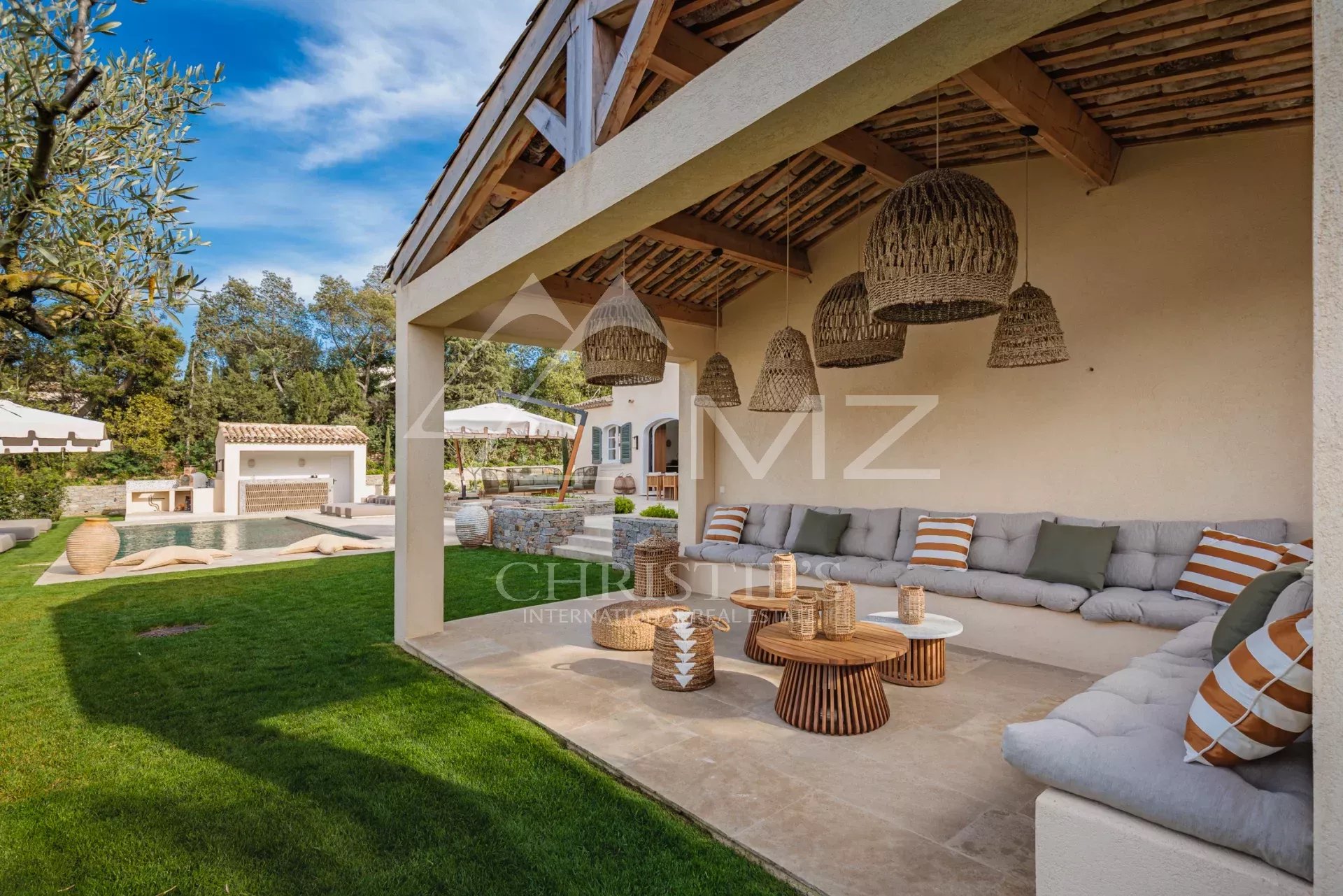 Es verfügt über ein Wohnzimmer, das sich zu einem Garten mit Bäumen und einem schönen Pool hin öffnet, eine Küche, ein Esszimmer, 6 Schlafzimmer en suite, einen Fitnessraum, einen Kinosaal, ein Dampfbad, einen Massageraum und 2 Garagen.