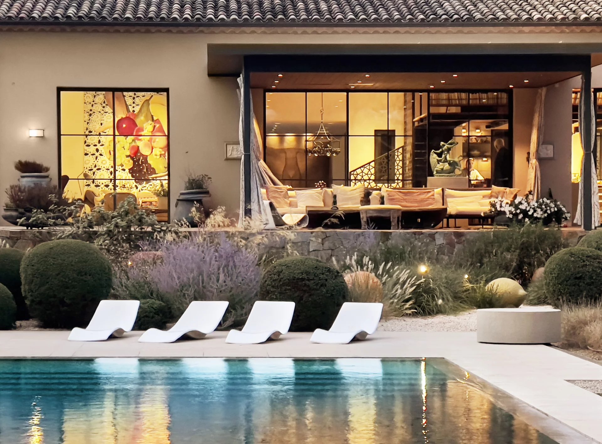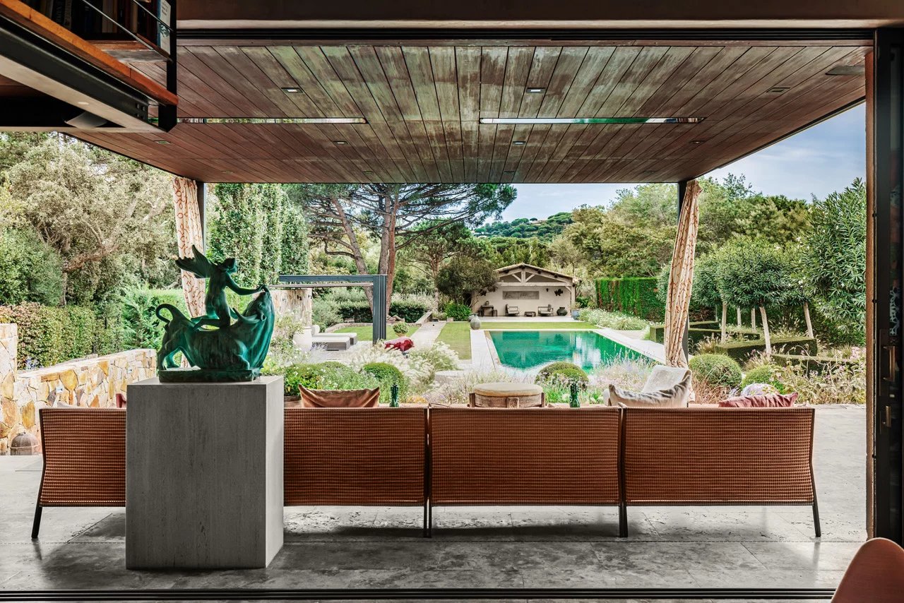 Die großzügigen Wohnbereiche öffnen sich zu einem beeindruckenden Pool, der von einem angelegten Garten umgeben ist, und schaffen so eine idyllische Kulisse, um sonnige Tage zu genießen.