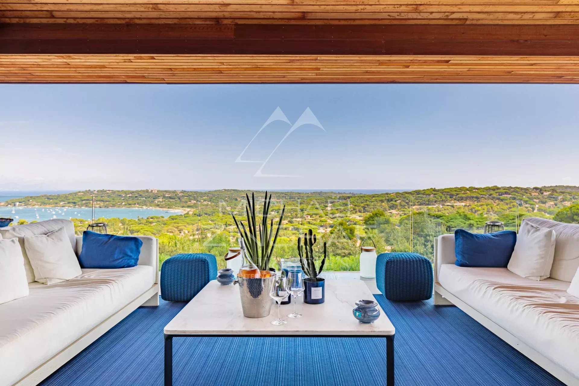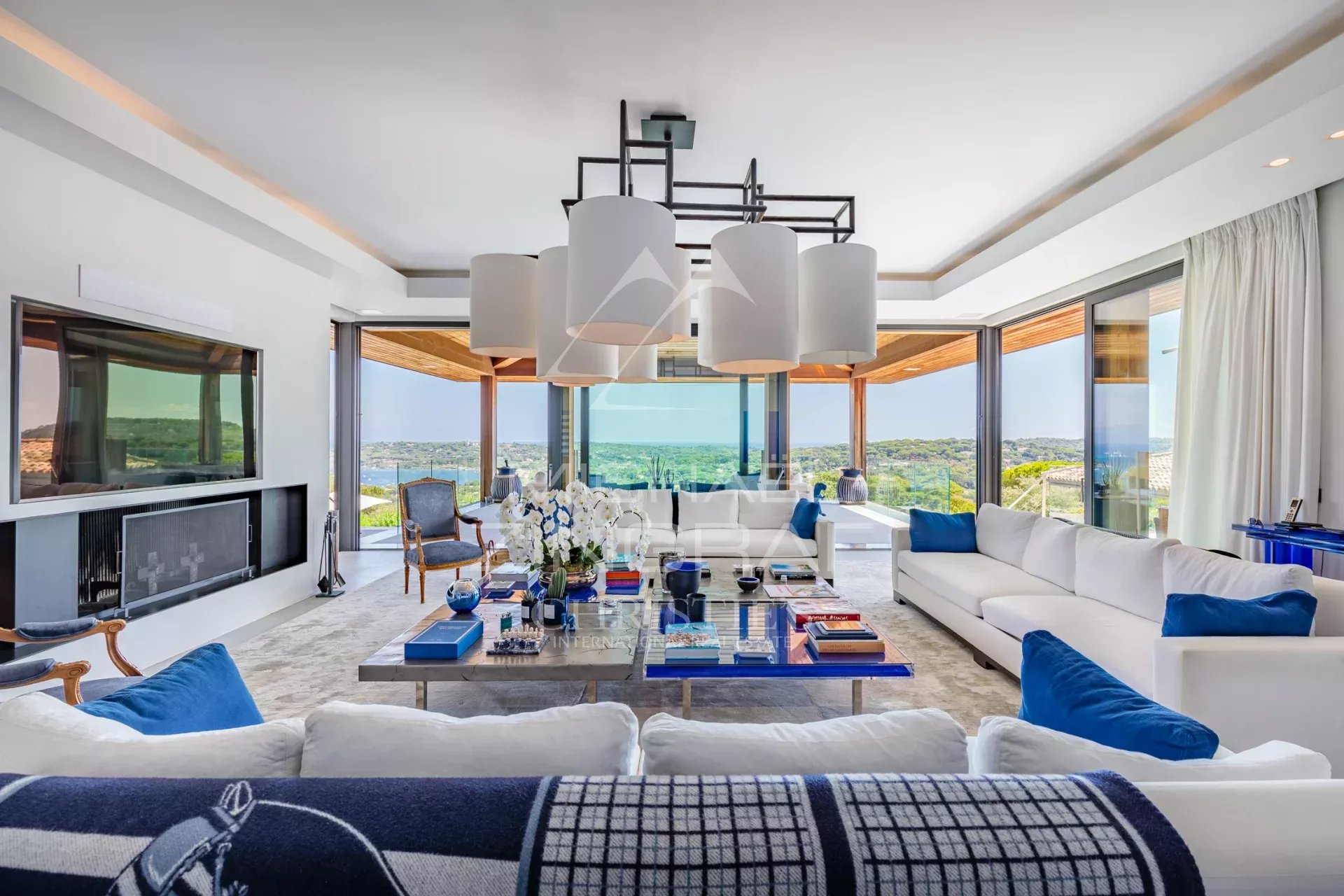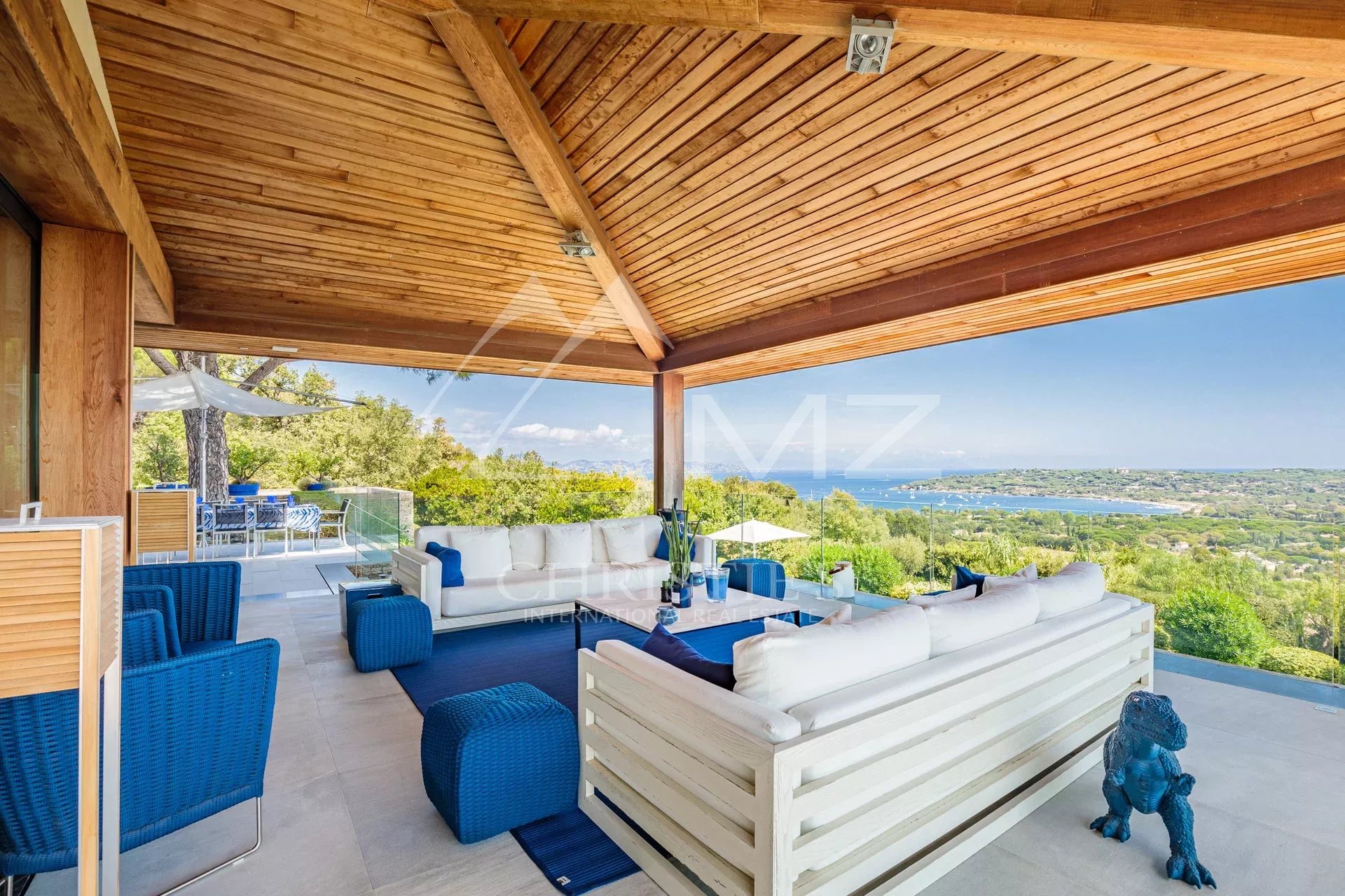 Diese außergewöhnliche Villa befindet sich auf den Anhöhen von Saint-Tropez, 5 Minuten vom Zentrum und dem Strand von Tahiti entfernt und bietet einen der spektakulärsten Panoramablicke auf das Meer der Halbinsel.
