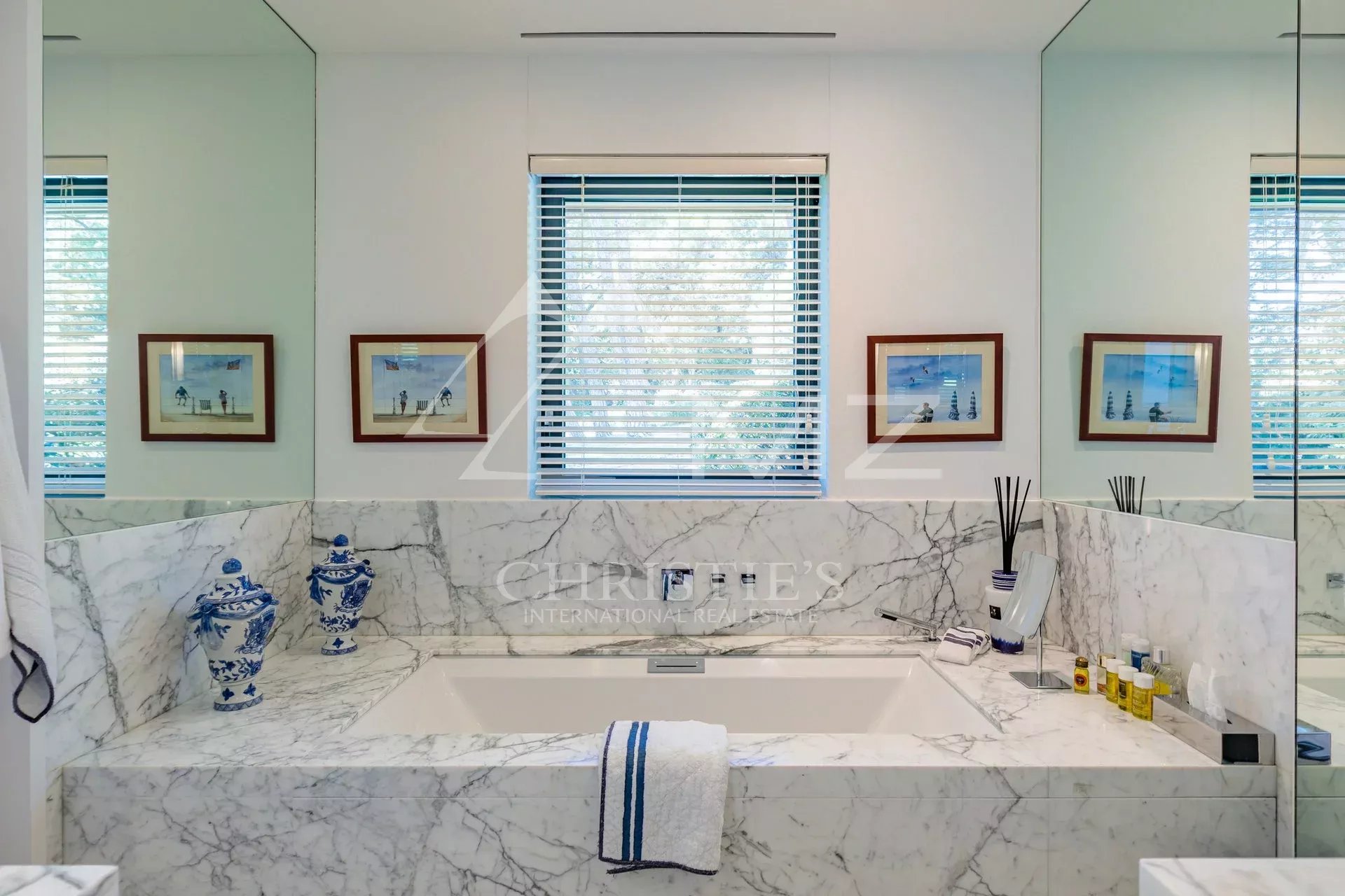 Es bietet zahlreiche Terrassen, schöne Wohnräume, ein Hauptschlafzimmer mit eigenem Bad, 7 Gästezimmer mit Bad oder Dusche, 2 Dienstzimmer, einen Fitnessraum, ein Dampfbad und verfügt über die Leistungen und den Service eines Fünf-Sterne-Hotels.