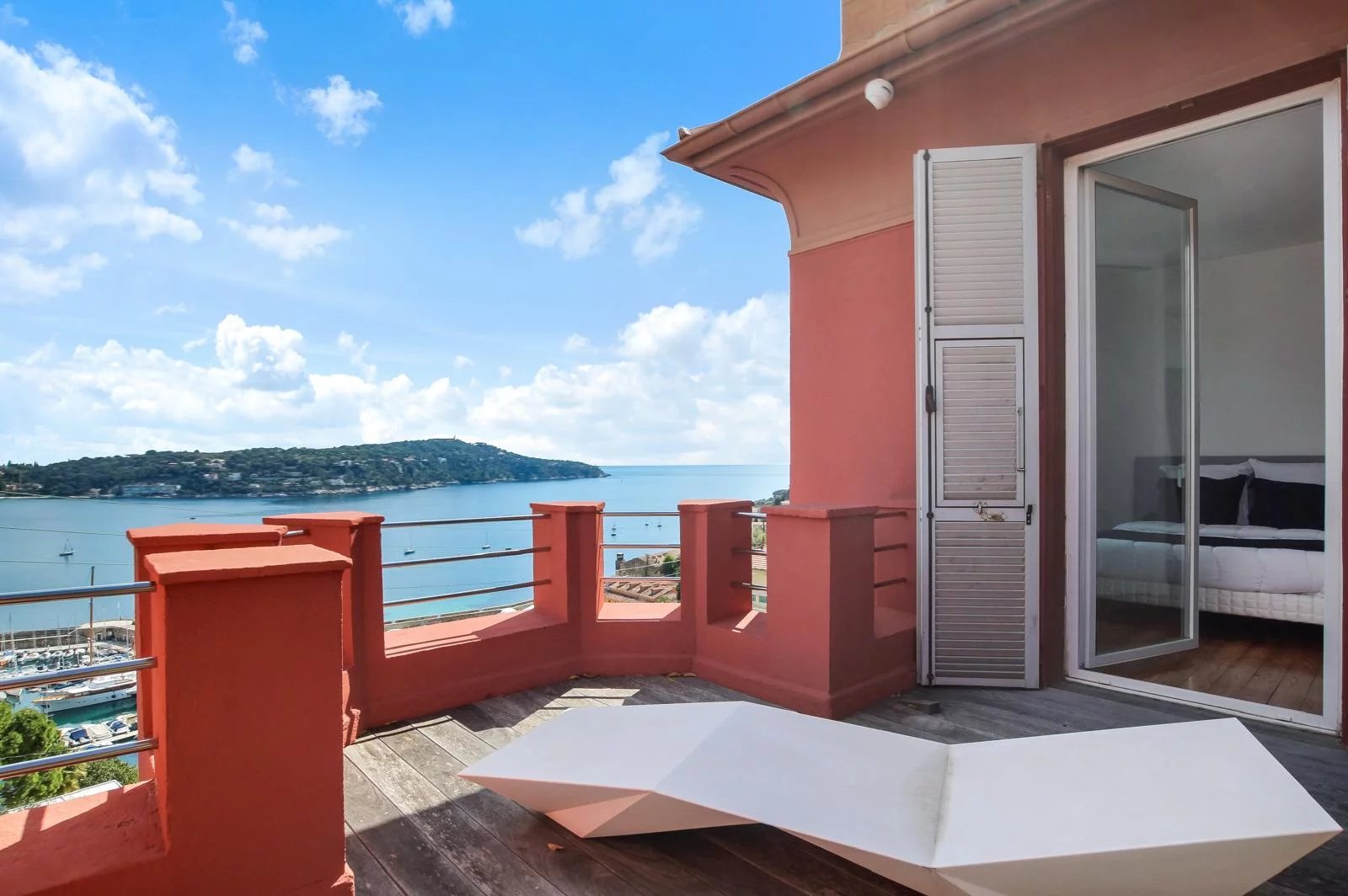 Zwei komfortable Schlafzimmer, eines davon mit Terrasse und Meerblick, sowie ein Badezimmer mit WC.