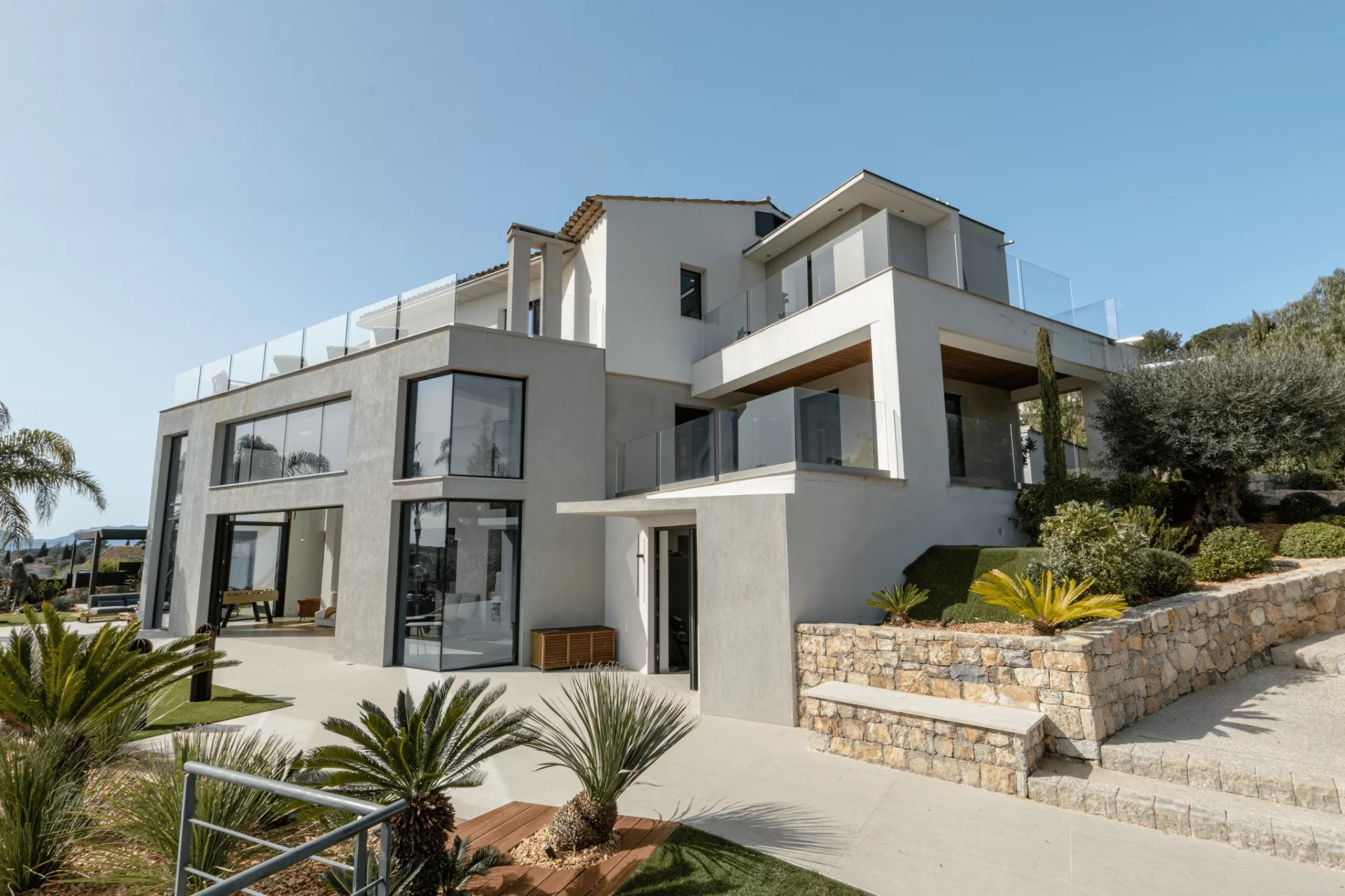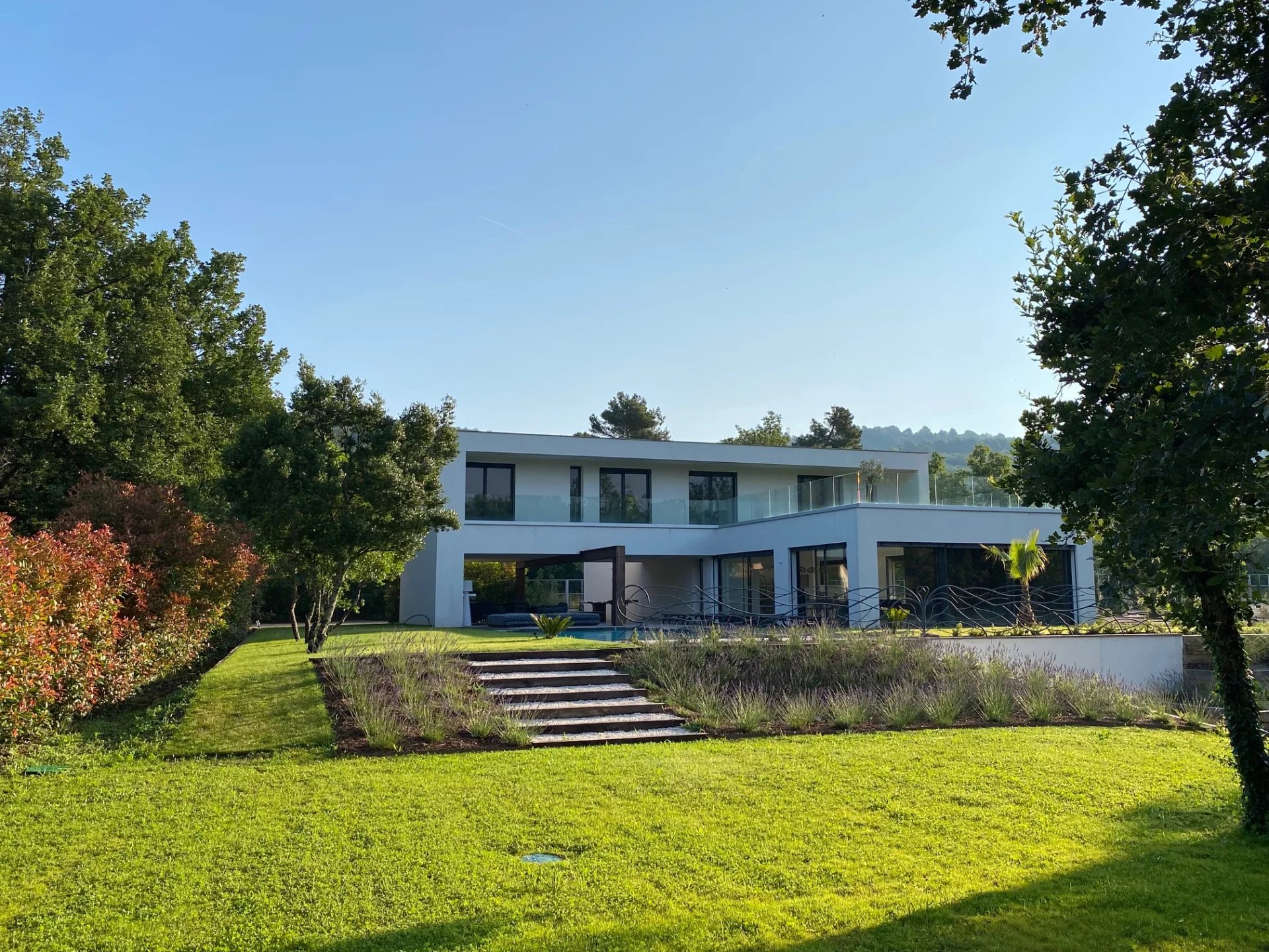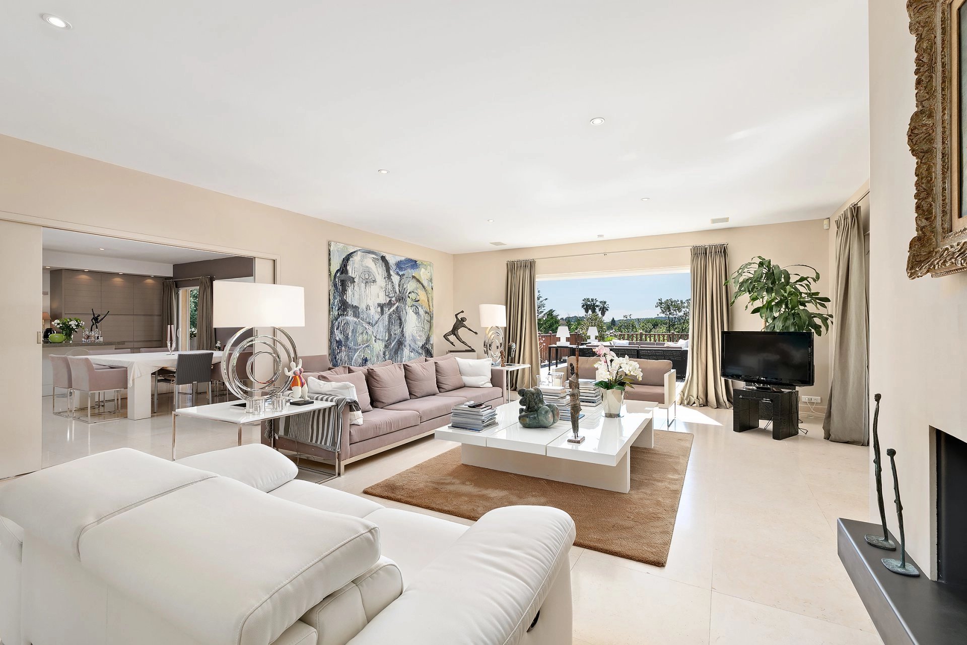 In einer beliebten Gegend von Mougins, eine sehr schöne moderne Villa von ca. 500 m², die einen raffinierten Garten mit einem beheizten Infinity-Pool, ein angenehmes Poolhaus (ausgestattet mit einem Pizzaofen...