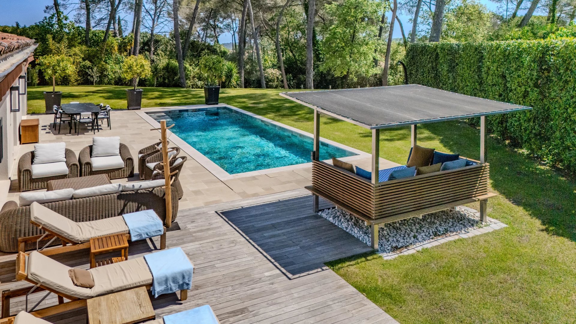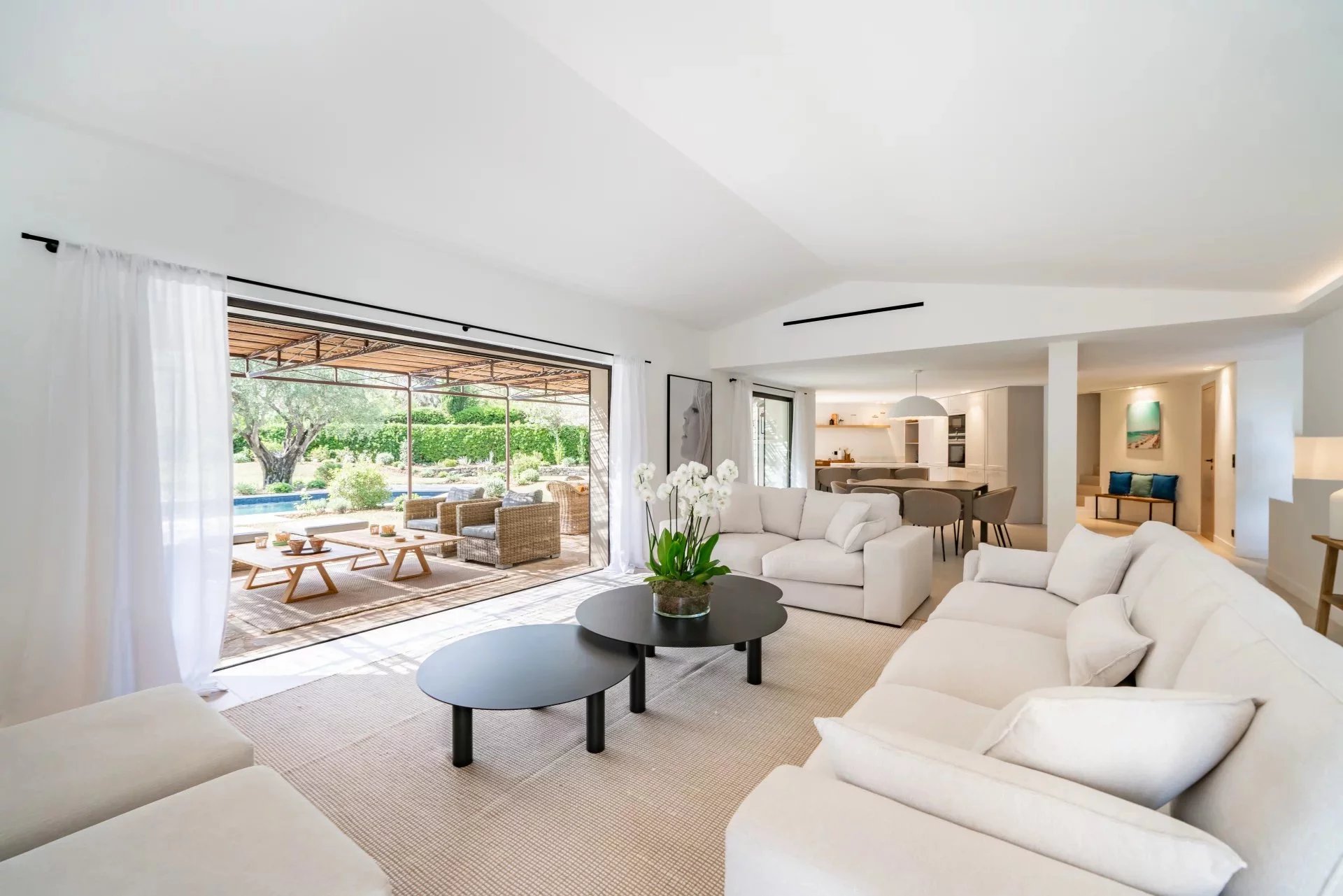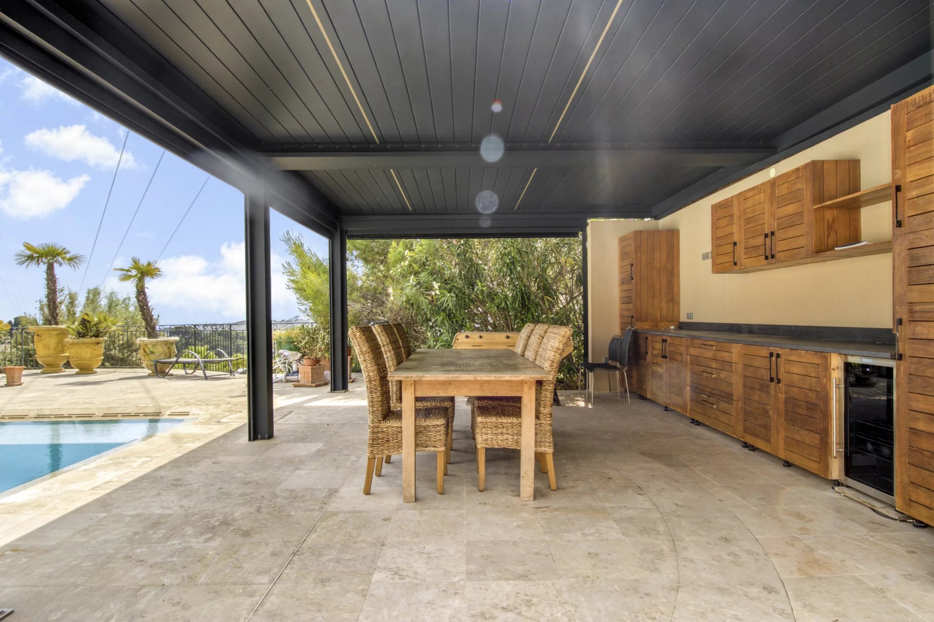 In einer beliebten Gegend von Mougins, eine sehr schöne moderne Villa von ca. 500 m², die einen raffinierten Garten mit einem beheizten Infinity-Pool, ein angenehmes Poolhaus (ausgestattet mit einem Pizzaofen...