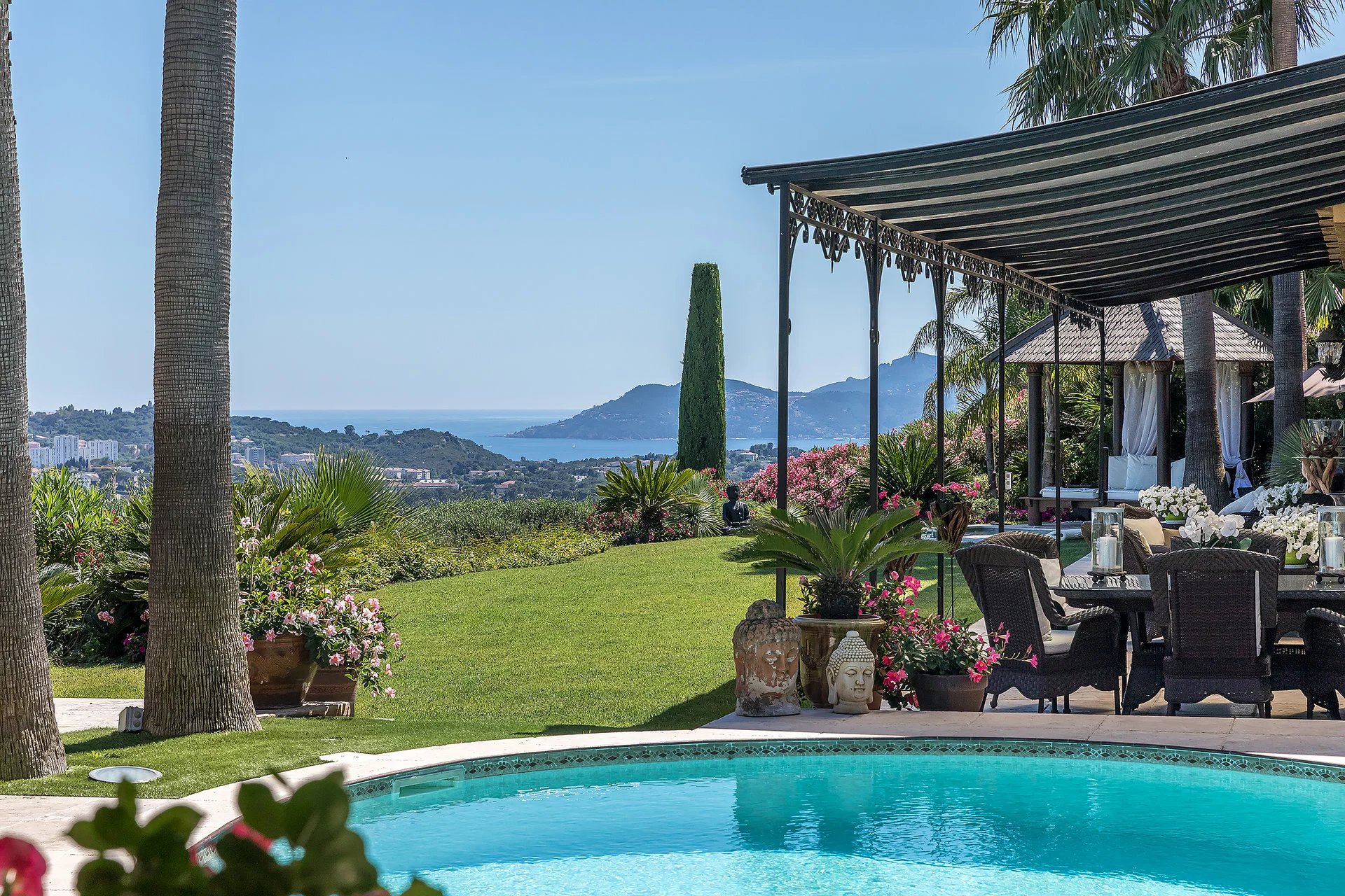 Sehr schöne Adresse für diese balinesisch inspirierte Villa mit bemerkenswerten Leistungen, die nur wenige Schritte vom alten Dorf Mougins entfernt liegt und einen Panoramablick auf das Meer von den Lérins-Inseln...
