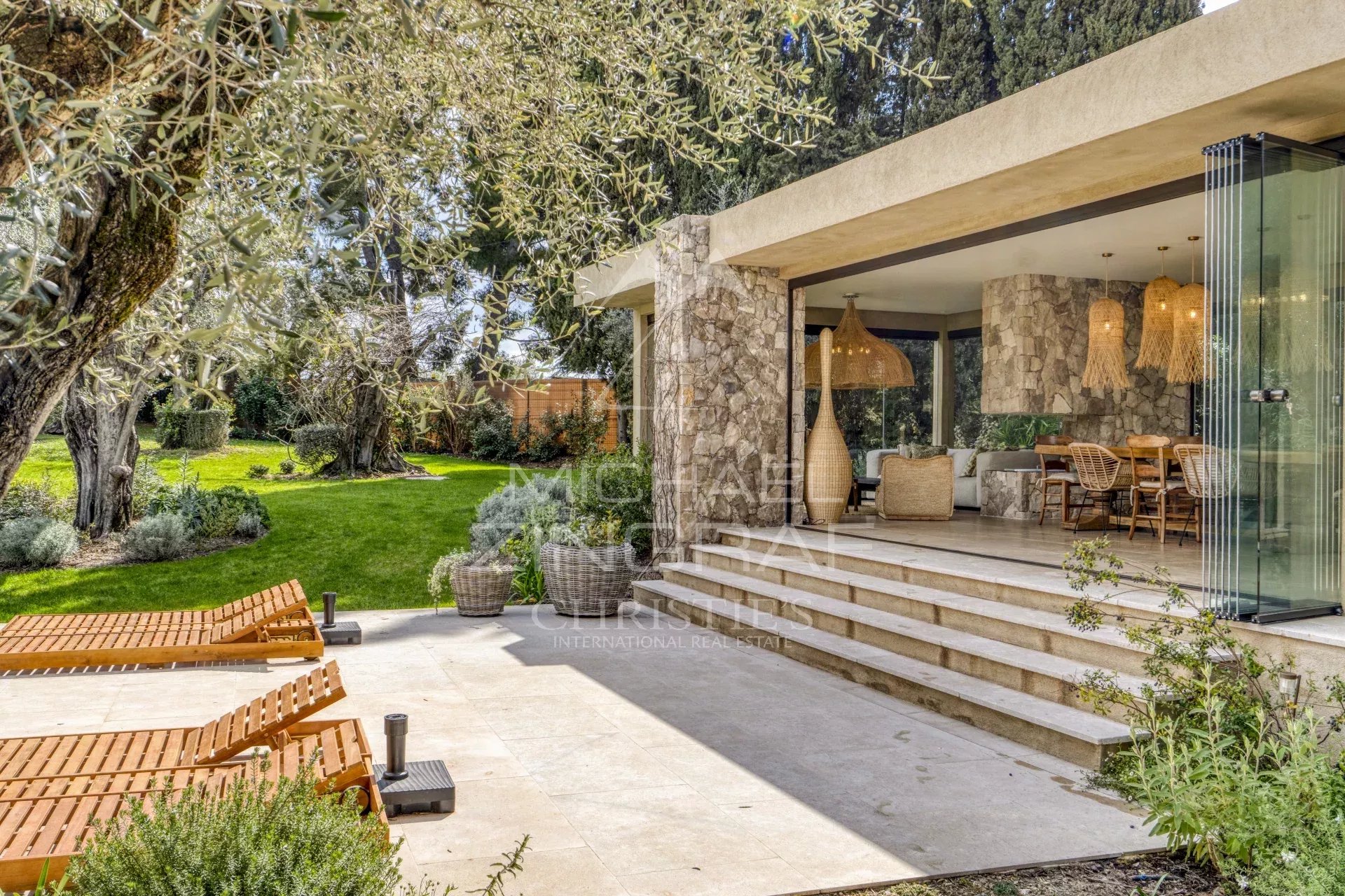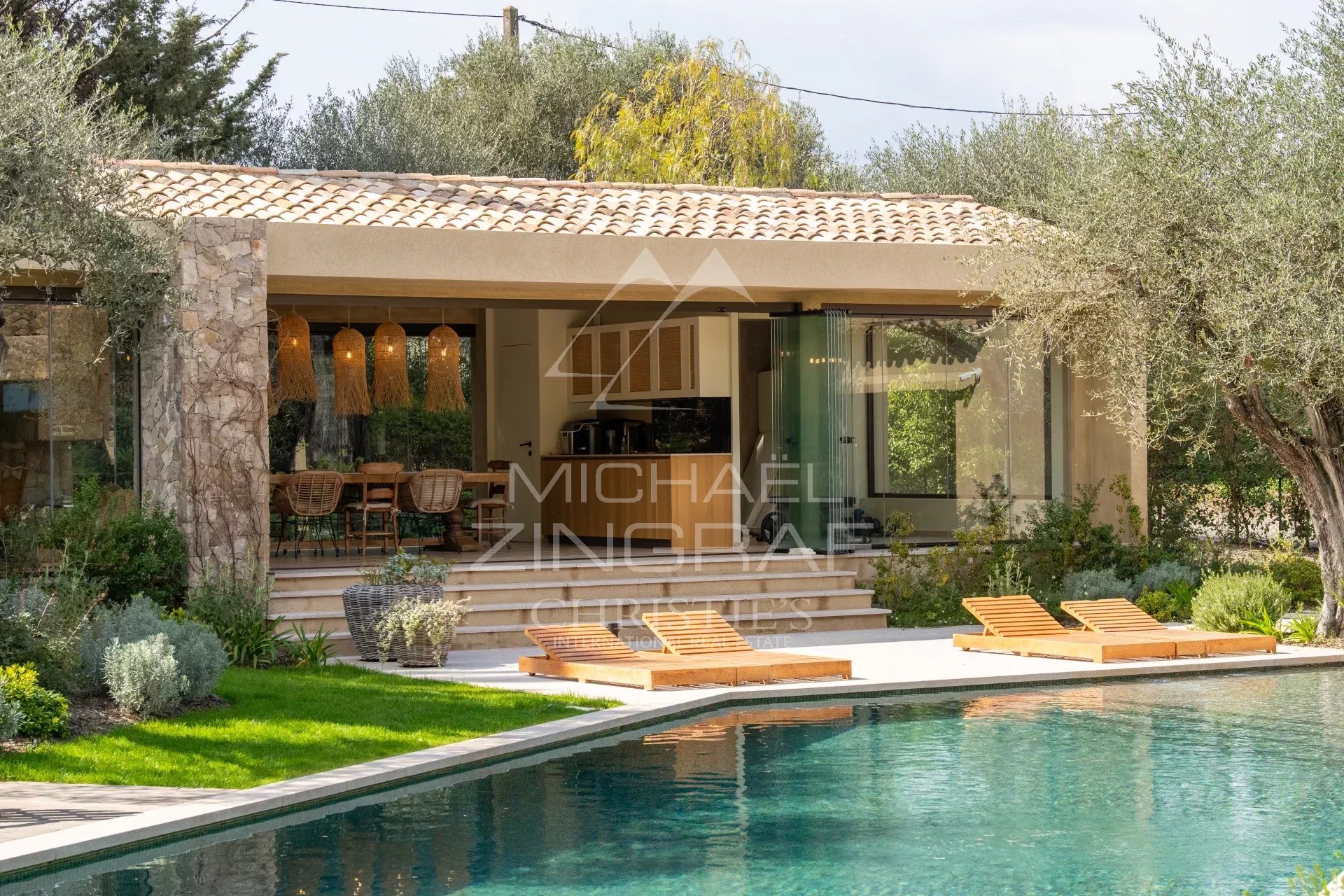 In einer beliebten Gegend von Mougins, eine sehr schöne moderne Villa von ca. 500 m², die einen raffinierten Garten mit einem beheizten Infinity-Pool, ein angenehmes Poolhaus (ausgestattet mit einem Pizzaofen...