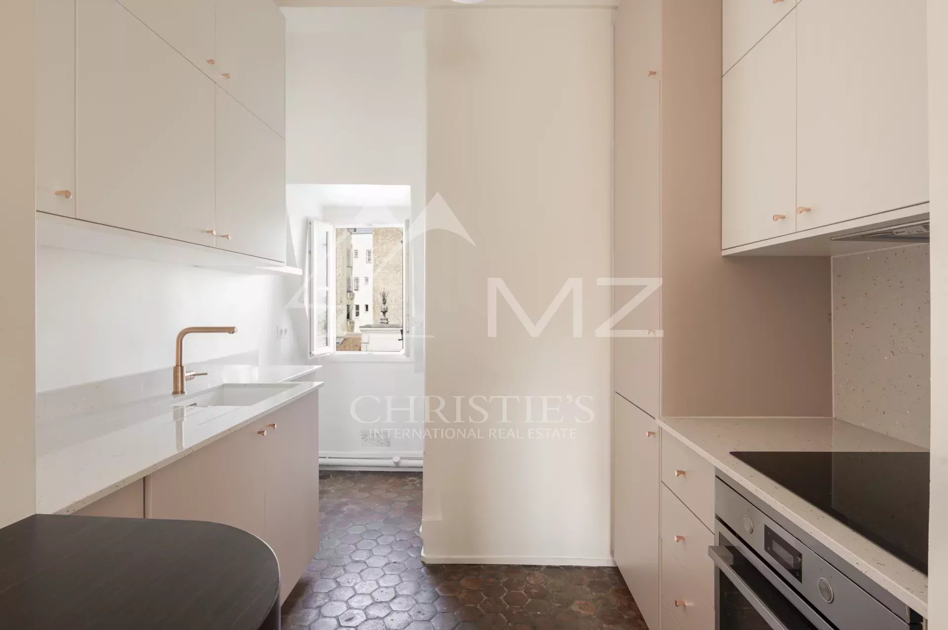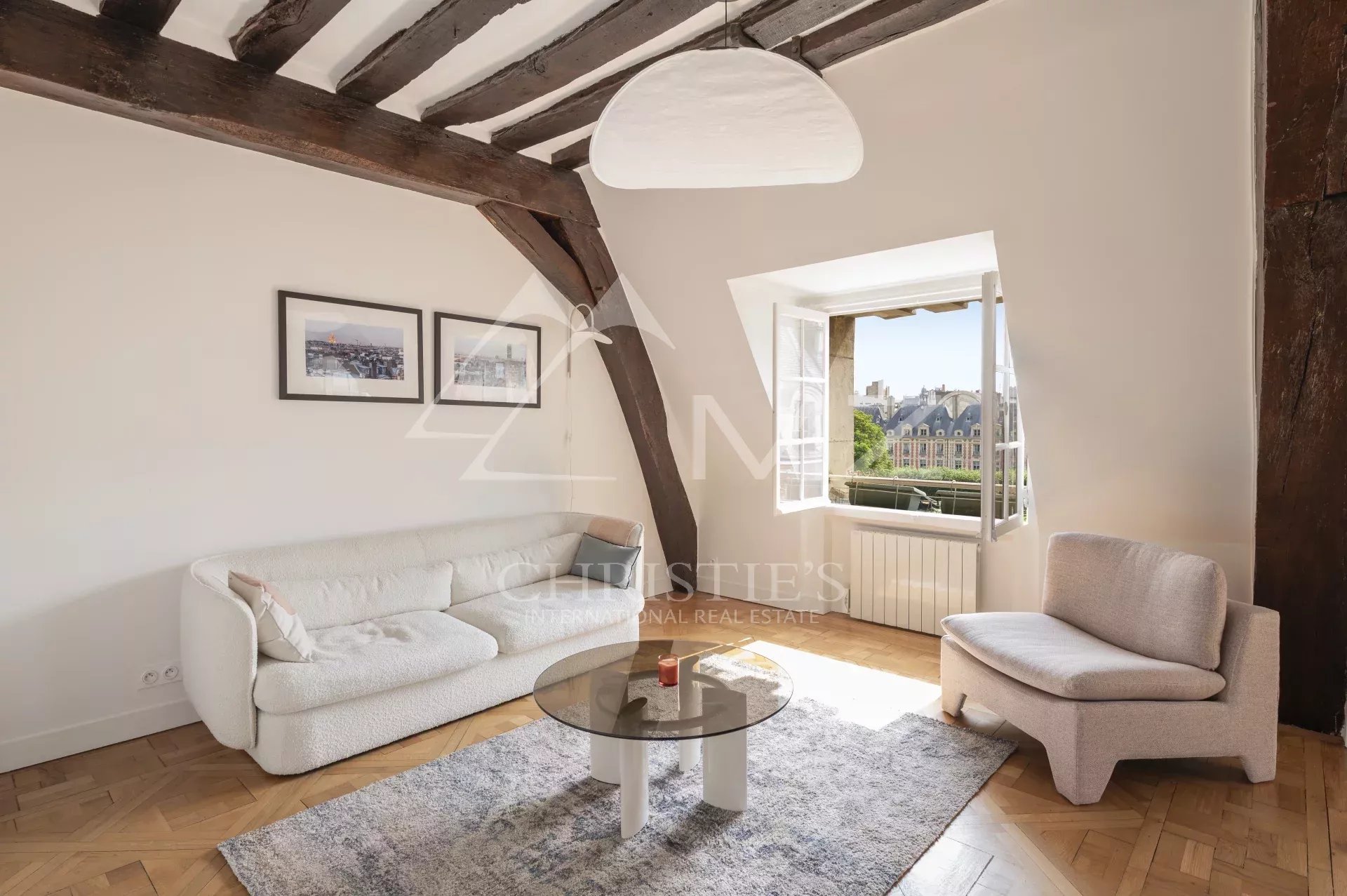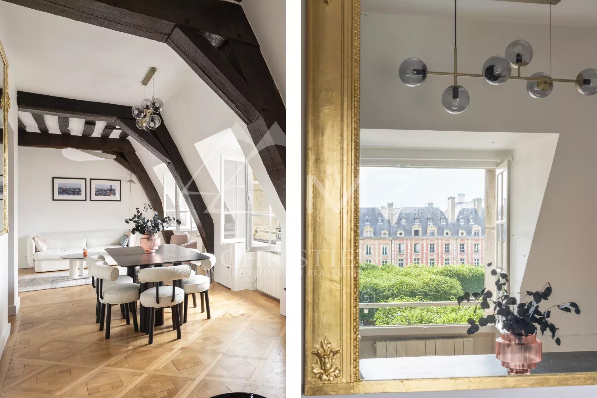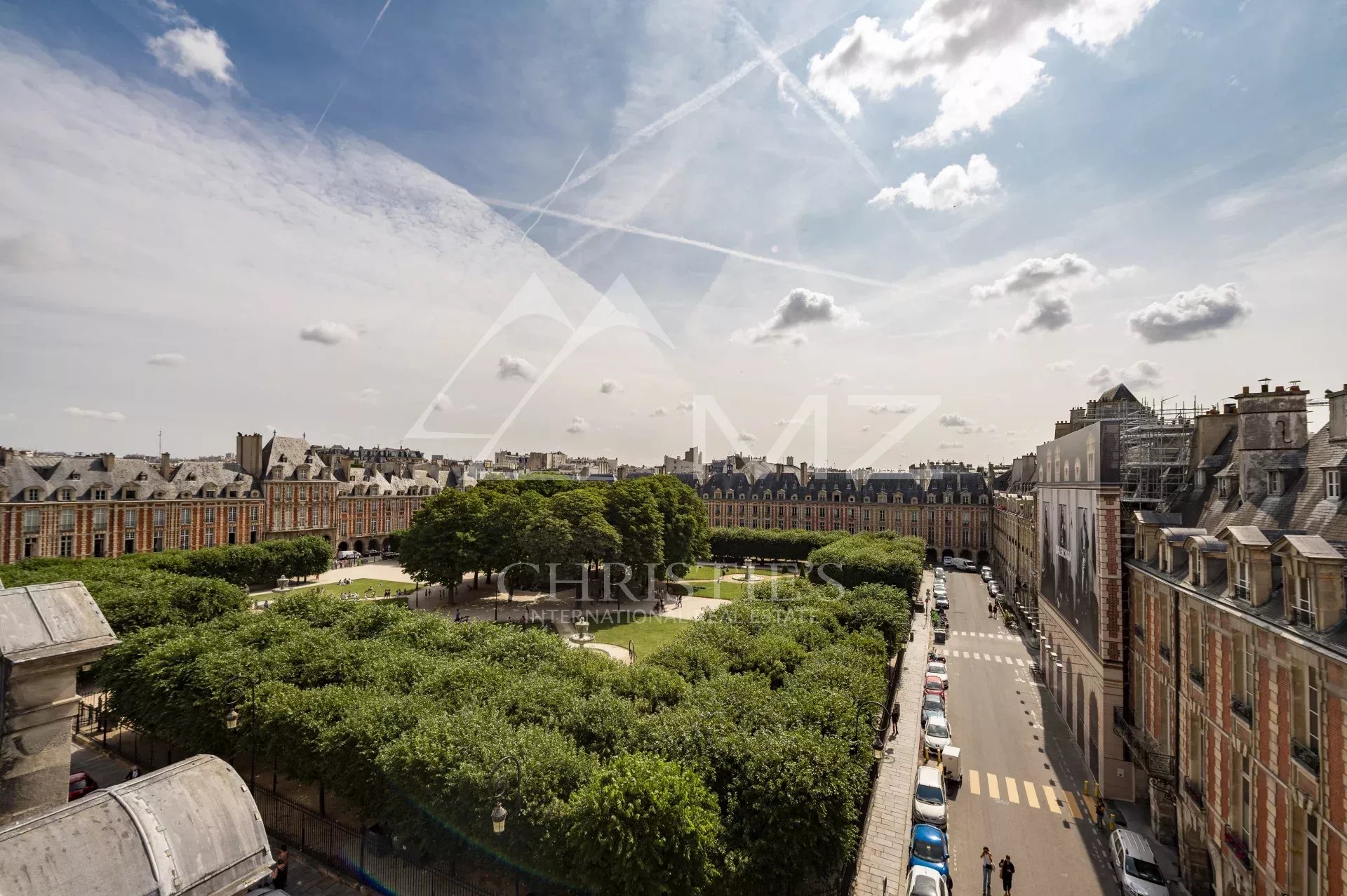 Die vier Fenster der Wohnung bieten einen atemberaubenden Ausblick und eine ideale Ausrichtung auf die Place des Vosges.