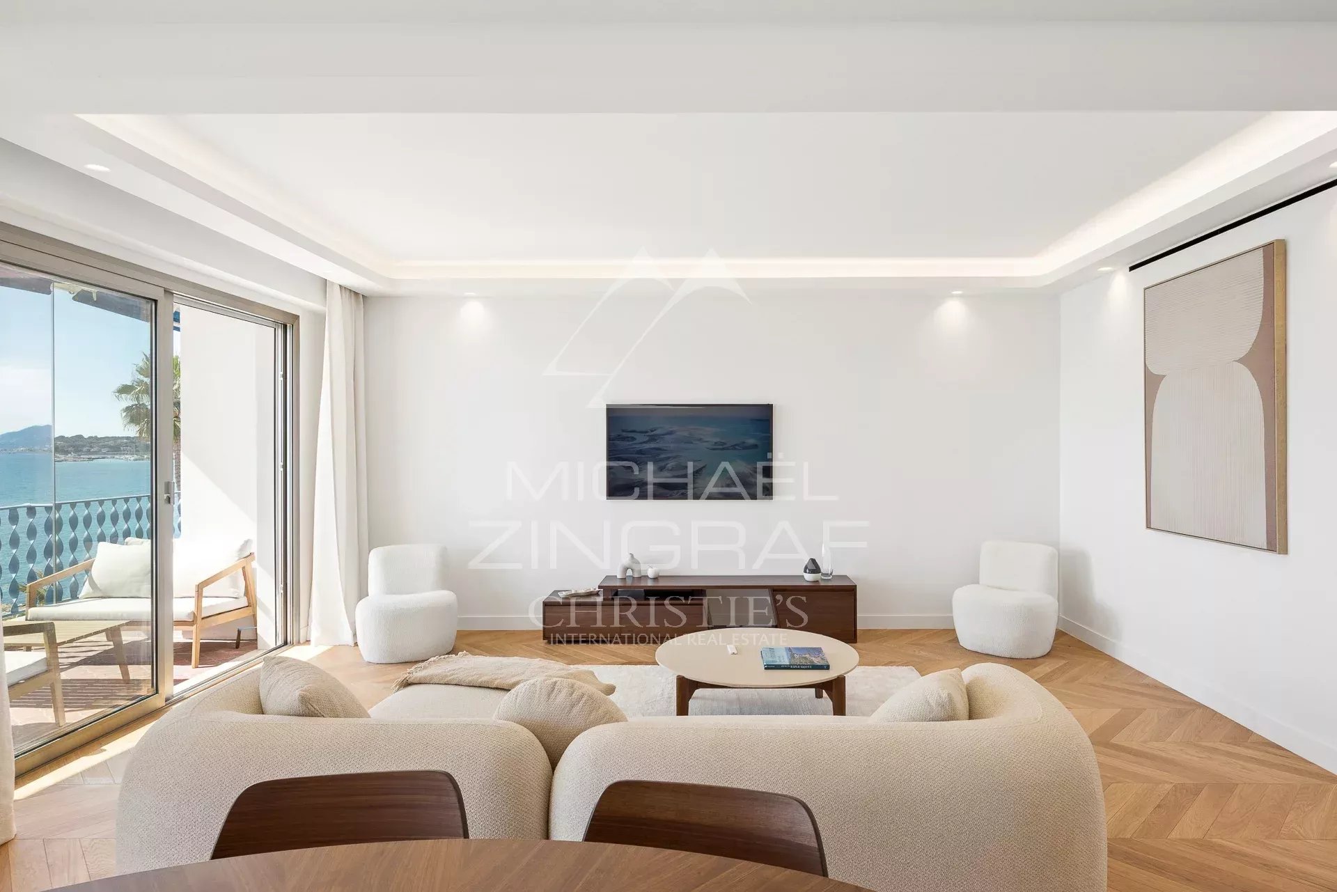 Atemberaubender Panoramameerblick von dieser großzügigen 3-Zimmer-Durchgangswohnung mit 81 m², ergänzt durch eine tiefe Terrasse mit einem außergewöhnlichen Panorama auf das Meer, die Îles de Lérins, das Cap d’Antibes und den...