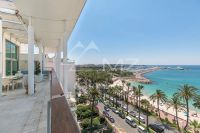 Ideale Lage, schöne Wohnung an der Croisette von 130 m², bestehend aus: Wohnzimmer mit Zugang zur Terrasse und Meerblick, Einbauküche, zwei Schlafzimmer en suite mit Duschbad und ein Schlafzimmer mit...