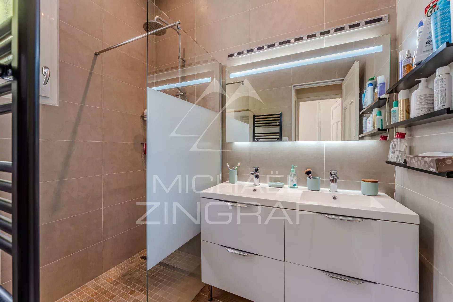 - Ein separates Badezimmer mit Doppelwaschbecken und ebenerdiger Dusche.