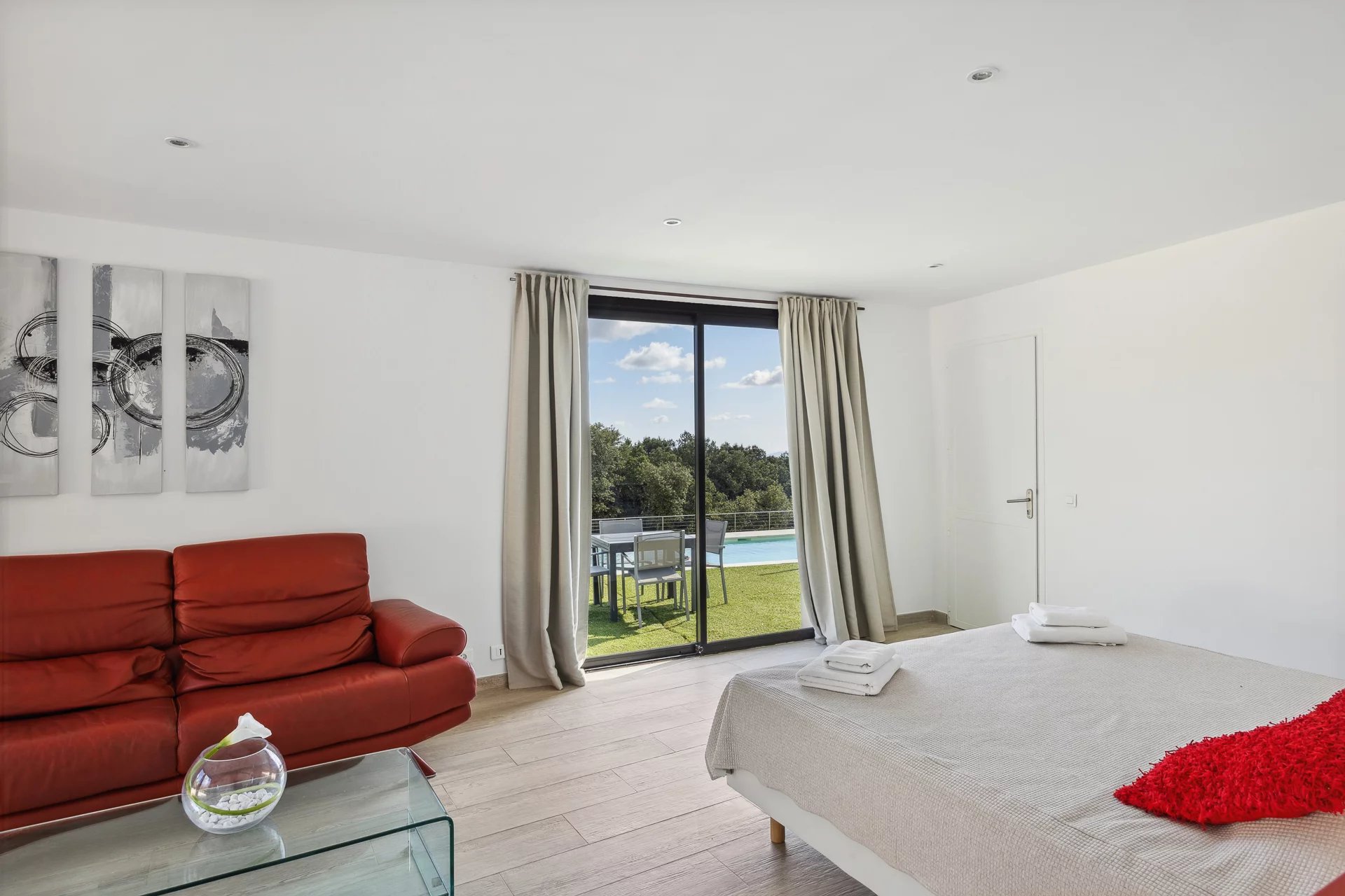 Es besteht aus einem großen Wohnzimmer mit offener, voll ausgestatteter Küche und Esszimmer, das sich zu einer tiefen Terrasse mit atemberaubender Aussicht öffnet, einem Schlafzimmer mit Duschbad und einem Hauptschlafzimmer mit eigenem Bad.