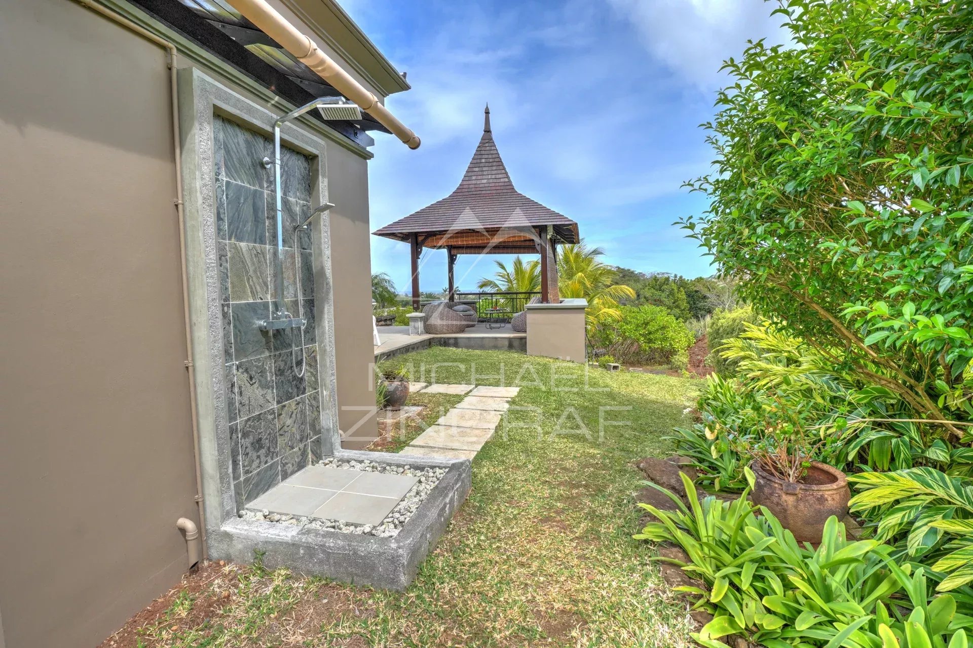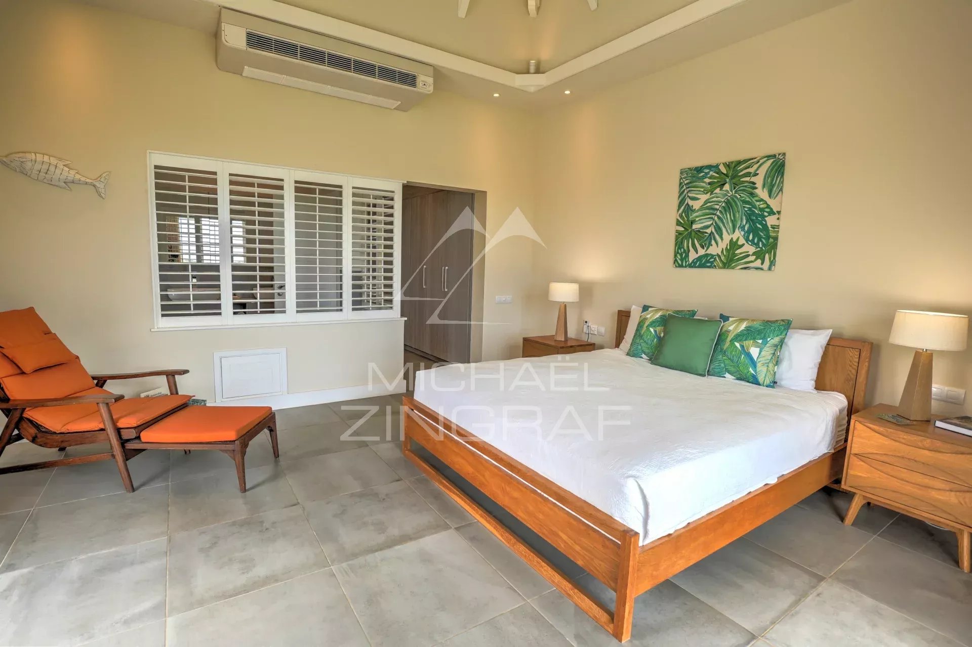 Die vier en-suite Schlafzimmer sind wahre Rückzugsorte des Komforts. Besonders das Hauptschlafzimmer, das sich zu einer Outdoor-Dusche und einer freistehenden Badewanne öffnet, bietet ein einzigartiges Naturerlebnis. Zentrale Klimaanlagen in allen Schlafzimmern sorgen für optimalen Komfort das ganze Jahr über.