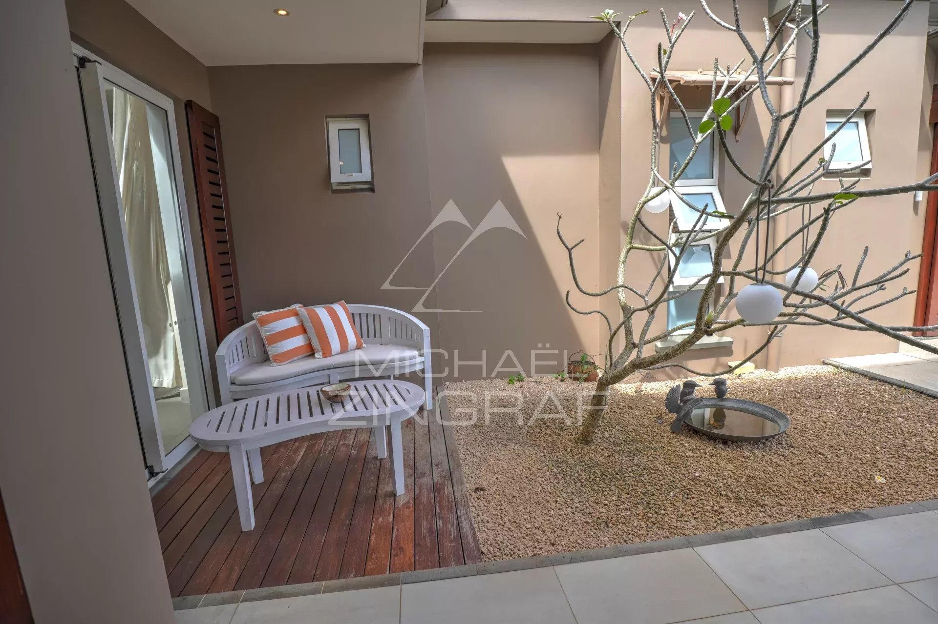Die Varangue, ein wahres Entspannungsrefugium, lädt mit einer stilvollen Bar-Ecke zum Verweilen ein. Die Poolterrasse erstreckt sich bis zum Gazebo, was ein unvergleichliches Outdoor-Erlebnis schafft. Die voll ausgestattete offene Küche verbindet sich harmonisch mit einer großzügigen Hinterküche, die allen Bedürfnissen gerecht wird.
