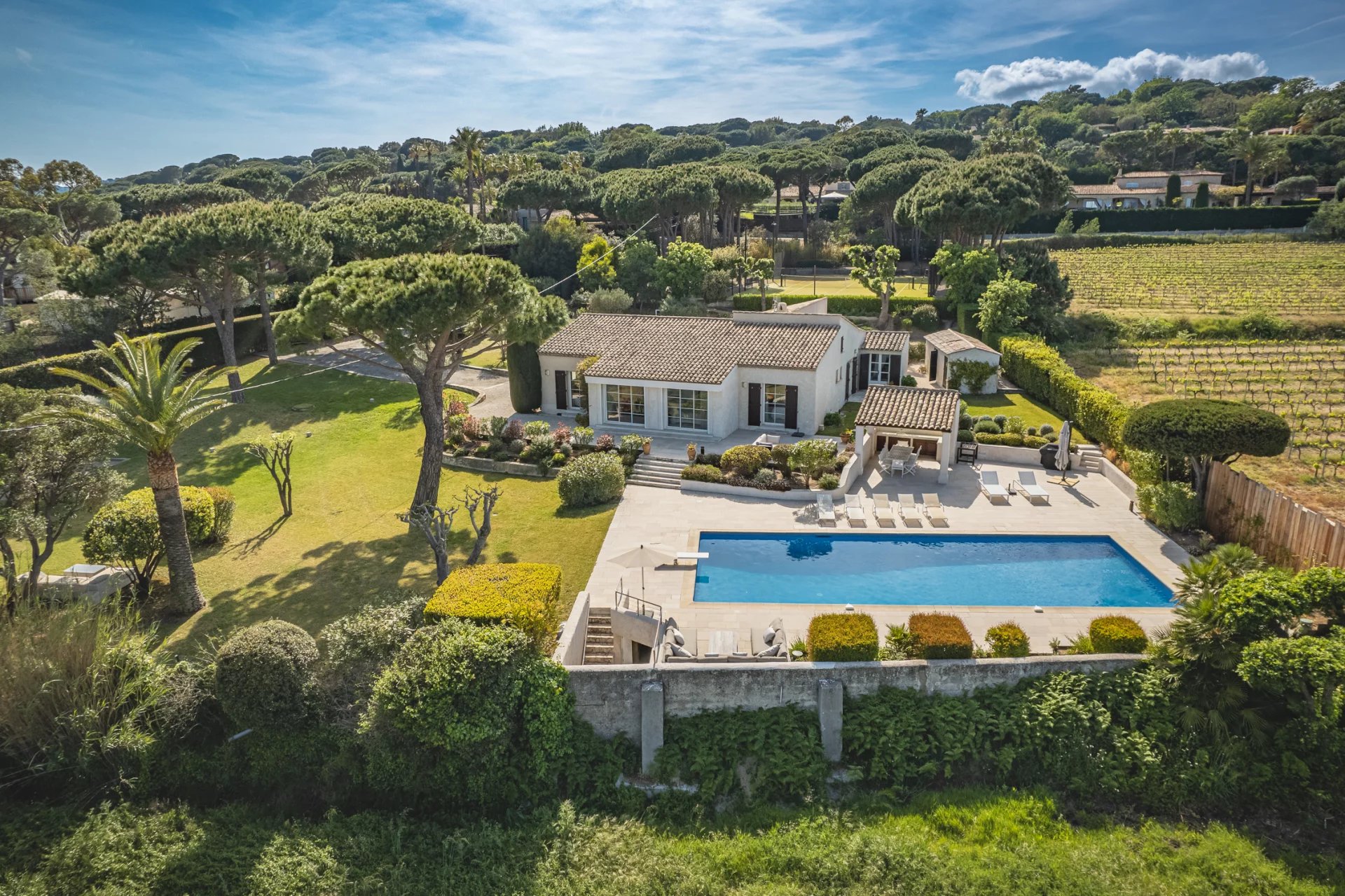 Dieses schöne Anwesen wurde renoviert und neu gestaltet und bietet allen Komfort für einen erholsamen Aufenthalt in Saint-Tropez. Es ist der ideale Ort für Landliebhaber, die in der Nähe der berühmten Strände von Pampelonne sein möchten. Der moderne Innenkomfort wird durch hervorragende Außenanlagen (Bouleplatz, ein großer Swimmingpool und ein Tennisplatz) ergänzt und von einem herrlichen Blick auf die Landschaft und das Meer gekrönt.