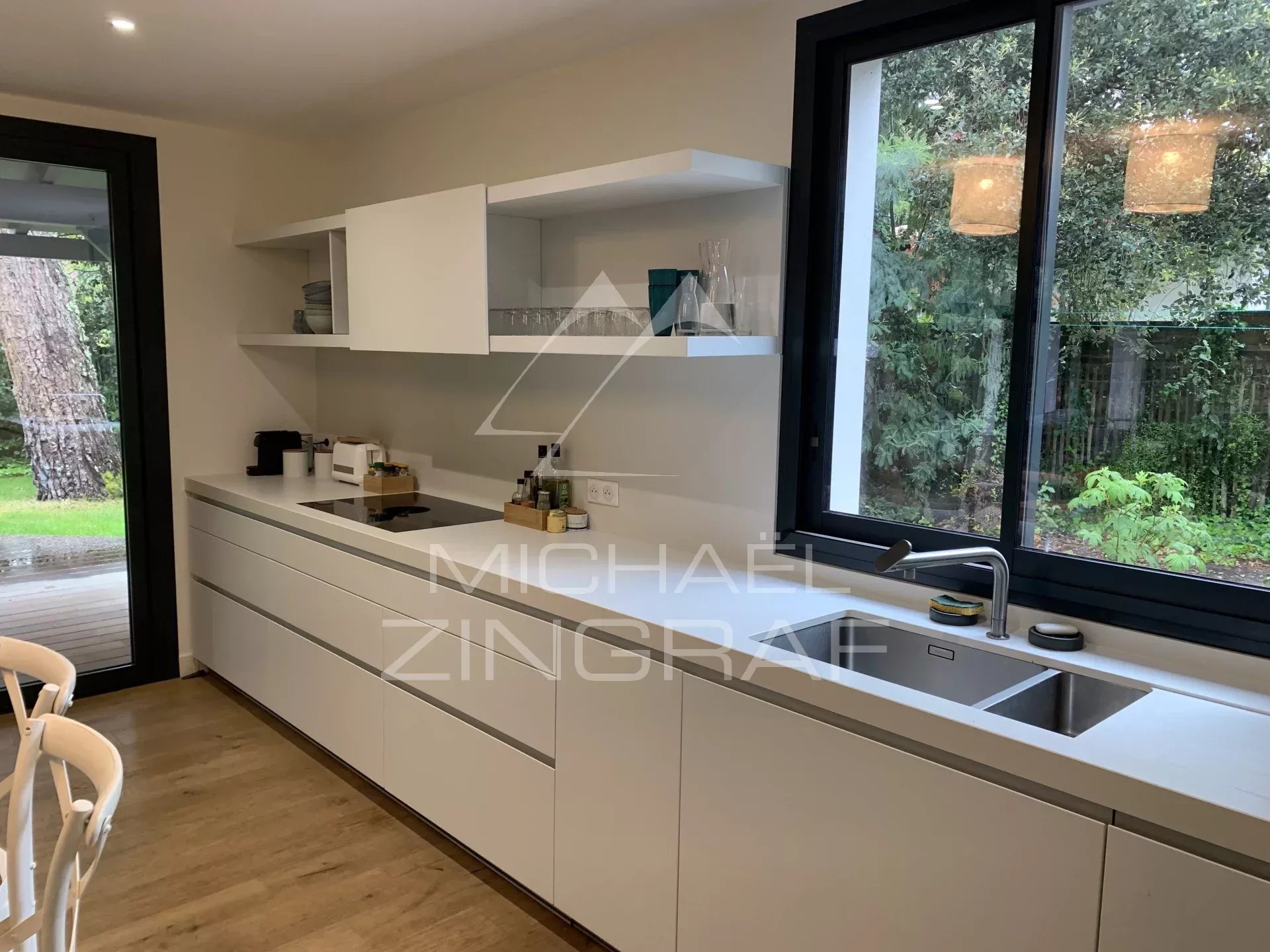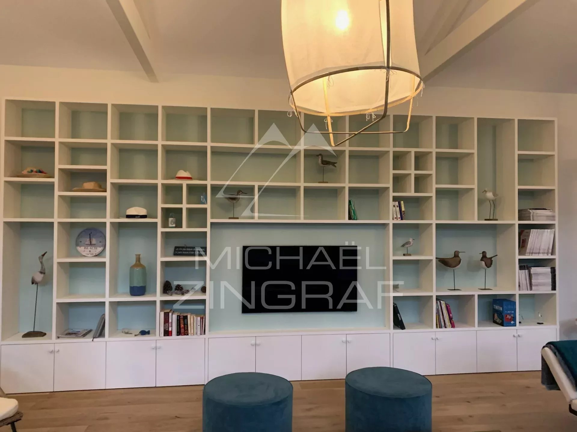 - Ein prächtiges Wohnzimmer, sehr hell dank seiner zahlreichen Erkerfenster, bestehend aus einem Wohnbereich mit Bibliothek und TV, einem Essbereich mit einem sehr großen Esstisch und einer voll ausgestatteten offenen Küche.