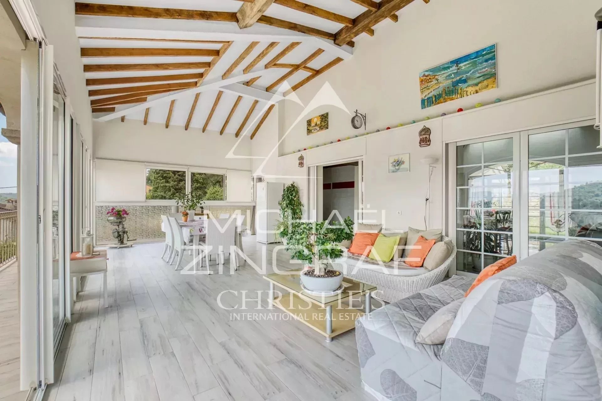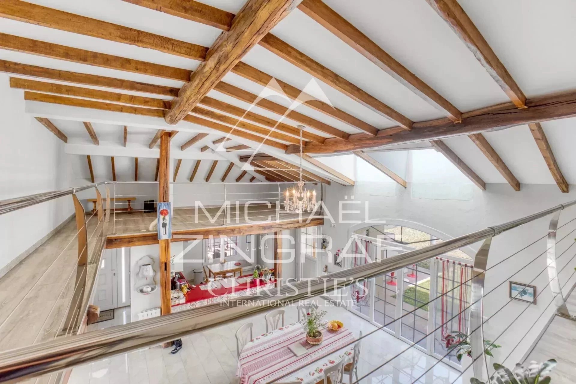 Diese Villa mit einer Wohnfläche von ca. 300m² befindet sich auf einem 1923m² großen Grundstück und liegt auf einem Hügel mit perfekter Ausrichtung in dominanter Lage. Ihre Besonderheit liegt in den Räumen, die sie bietet: Das Hauptwohnzimmer in Kathedralenform bietet 71m², an das sich eine geschlossene Loggia von 40m² anschließt, ebenfalls in Kathedralenform, wobei dieser offene Raum an ein 110m² großes Loft erinnert. Das Hauptgeschoss verfügt über 3 Schlafzimmer und ein Badezimmer, das Obergeschoss und seine "filante" Mezzanine führen uns zu einem atypischen Doppelzimmer im Stil eines Schlafsaals mit einer Fläche von 48 und 20m². Das Anwesen verfügt über eine große Garage, zahlreiche Parkplätze, ein Studio im Erdgeschoss, einen Keller und jede Menge Stauraum.