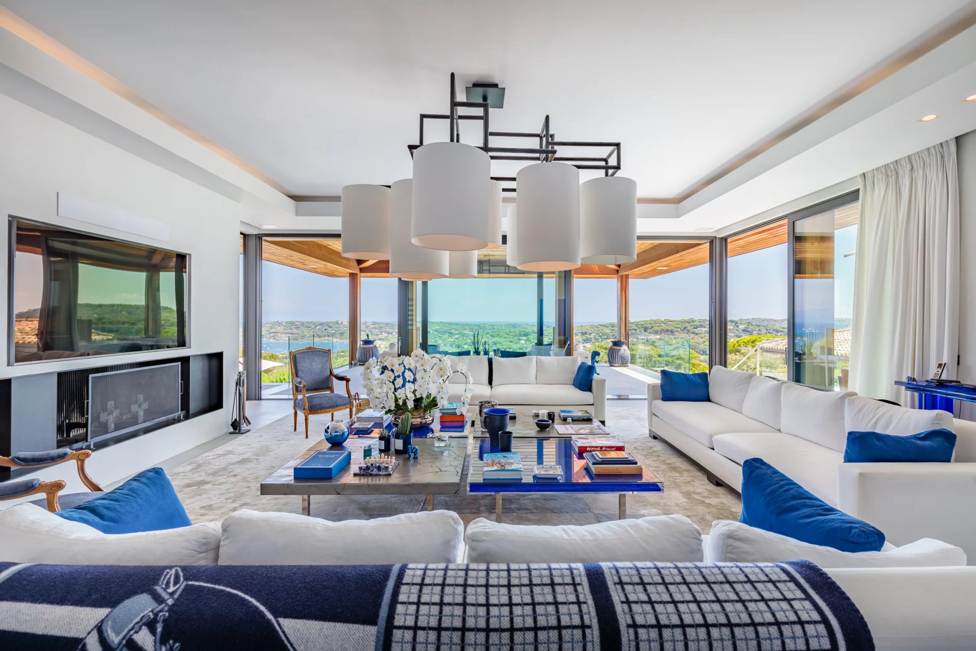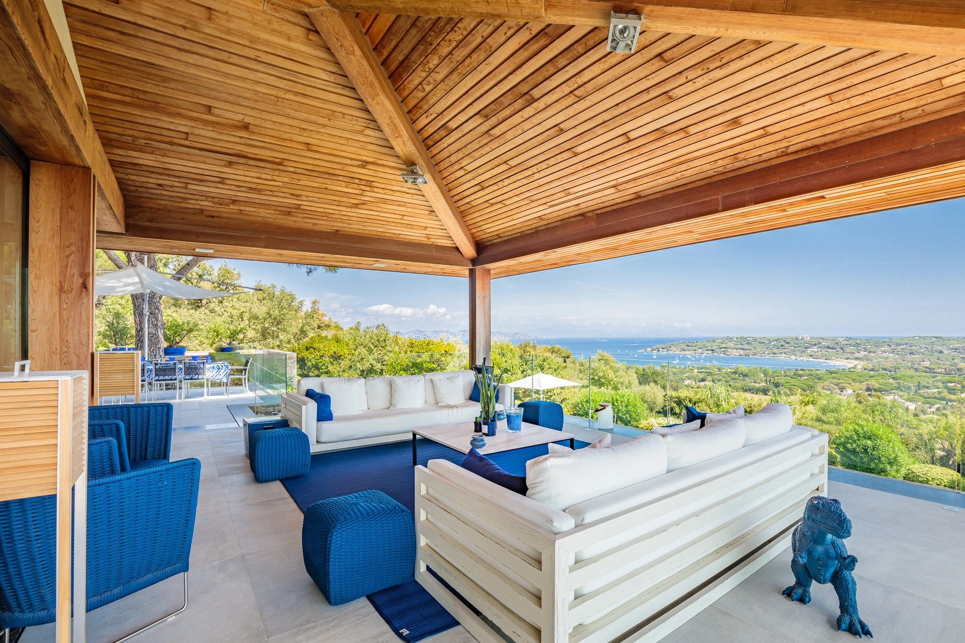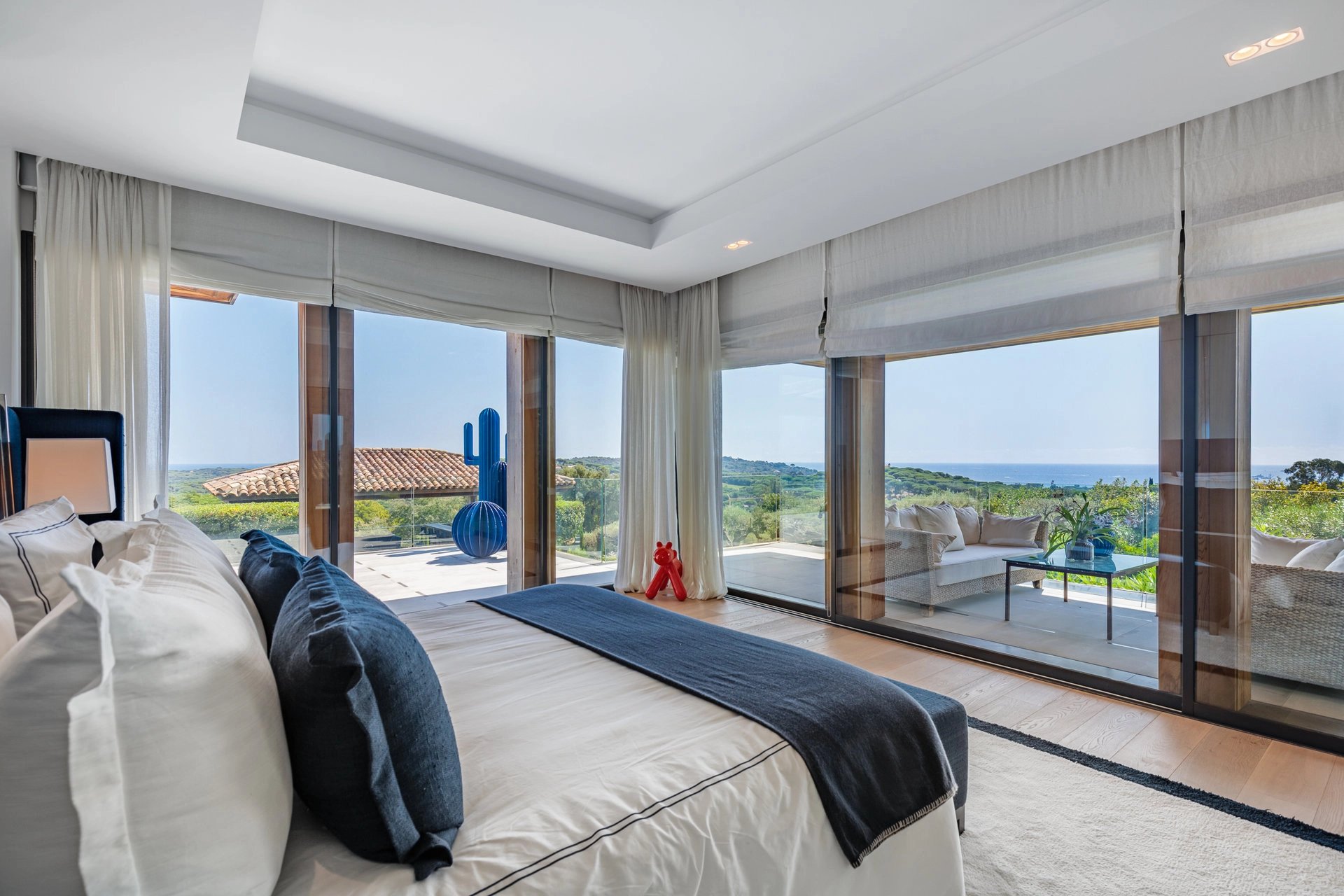 Diese außergewöhnliche Villa befindet sich auf den Anhöhen von Saint-Tropez, 5 Minuten vom Zentrum und dem Strand von Tahiti entfernt und bietet einen der spektakulärsten Panoramablicke auf das Meer der Halbinsel.