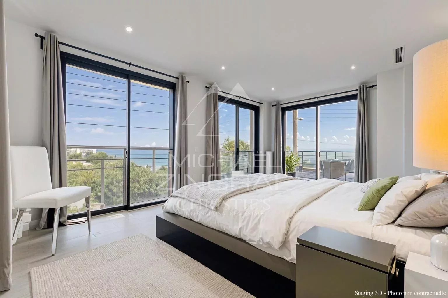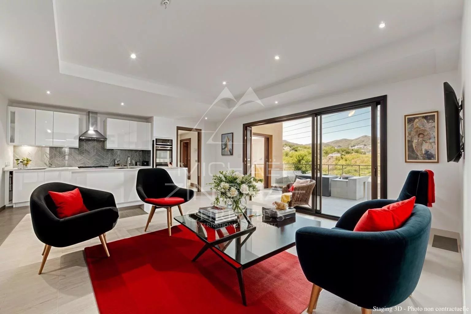 Entdecken Sie diese elegante 100 m² große Wohnung in einer kleinen Wohnanlage in Théoule-sur-Mer, nur 10 Gehminuten vom Strand und 35 Minuten vom Flughafen entfernt. Diese helle und geräumige Immobilie lädt Sie dazu ein, einen atemberaubenden Blick auf das Meer, den Hafen von Figuerette und die umliegenden Berge zu genießen.