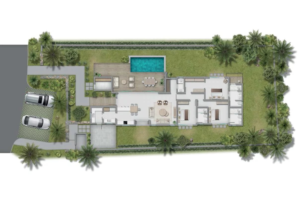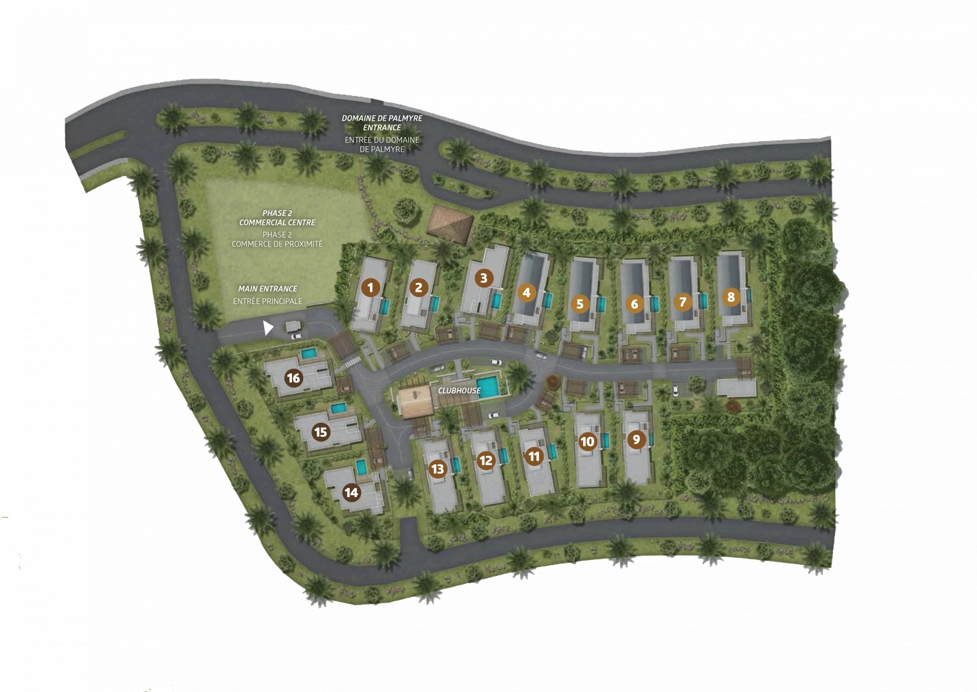 PALMARIS wurde auf einem großzügigen Grundstück von 1,66 Hektar konzipiert und bietet weitläufige Grünflächen, die Privatsphäre respektieren und die Atmosphäre eines privilegierten, gesicherten Dorfes schaffen.