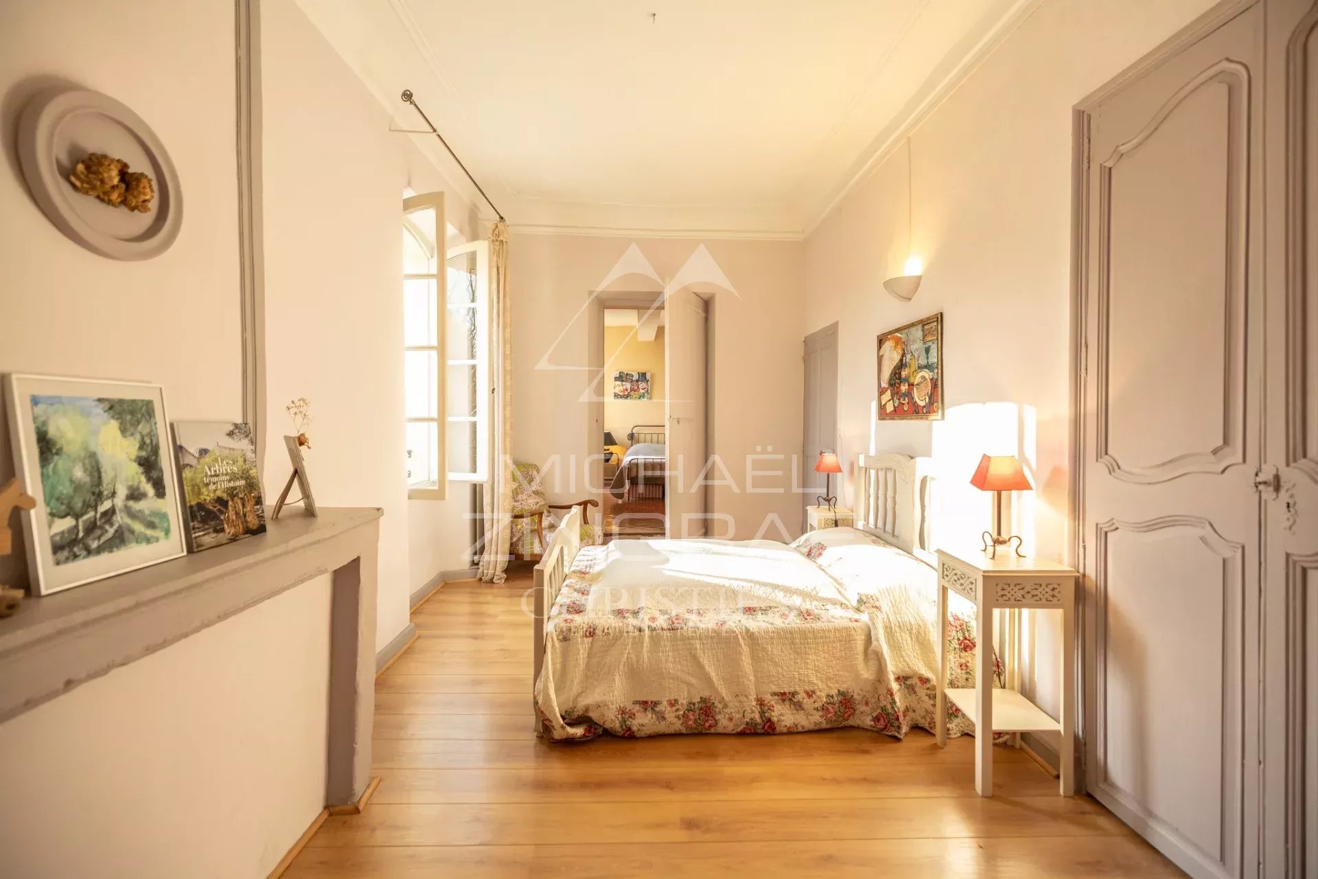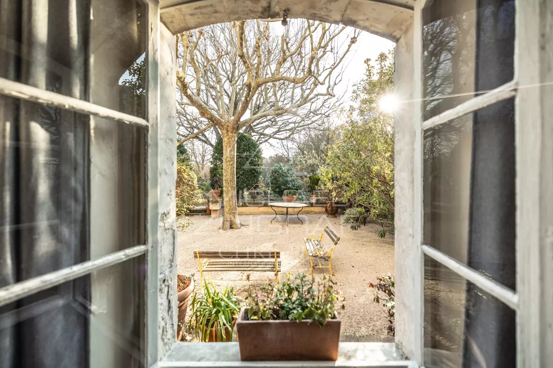 Next to the closed garage, the high-ceilinged entrance hall features a dressing area, laundry room and toilet, and opens onto a small, charming living room that provides access to the immense shaded terrace, a haven of coolness and conviviality, overlooking the verdant garden planted with beautiful, typically Provencal trees: plane, lime, hackberry and a hundred-year-old oak. A small swimming pool is available for cooling off in summer, as the property is not overlooked.