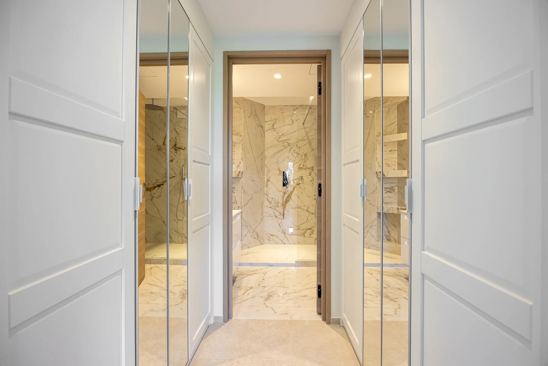 Luxuriously renovated, the apartment offers a surface area of 92 sqm and features a spacious living room with an open-plan, fully equipped kitchen that opens onto a beautiful terrace overlooking the sea. It includes two bedrooms, each with its own en-suite shower room, one of which has a toilet, as well as a separate guest WC.