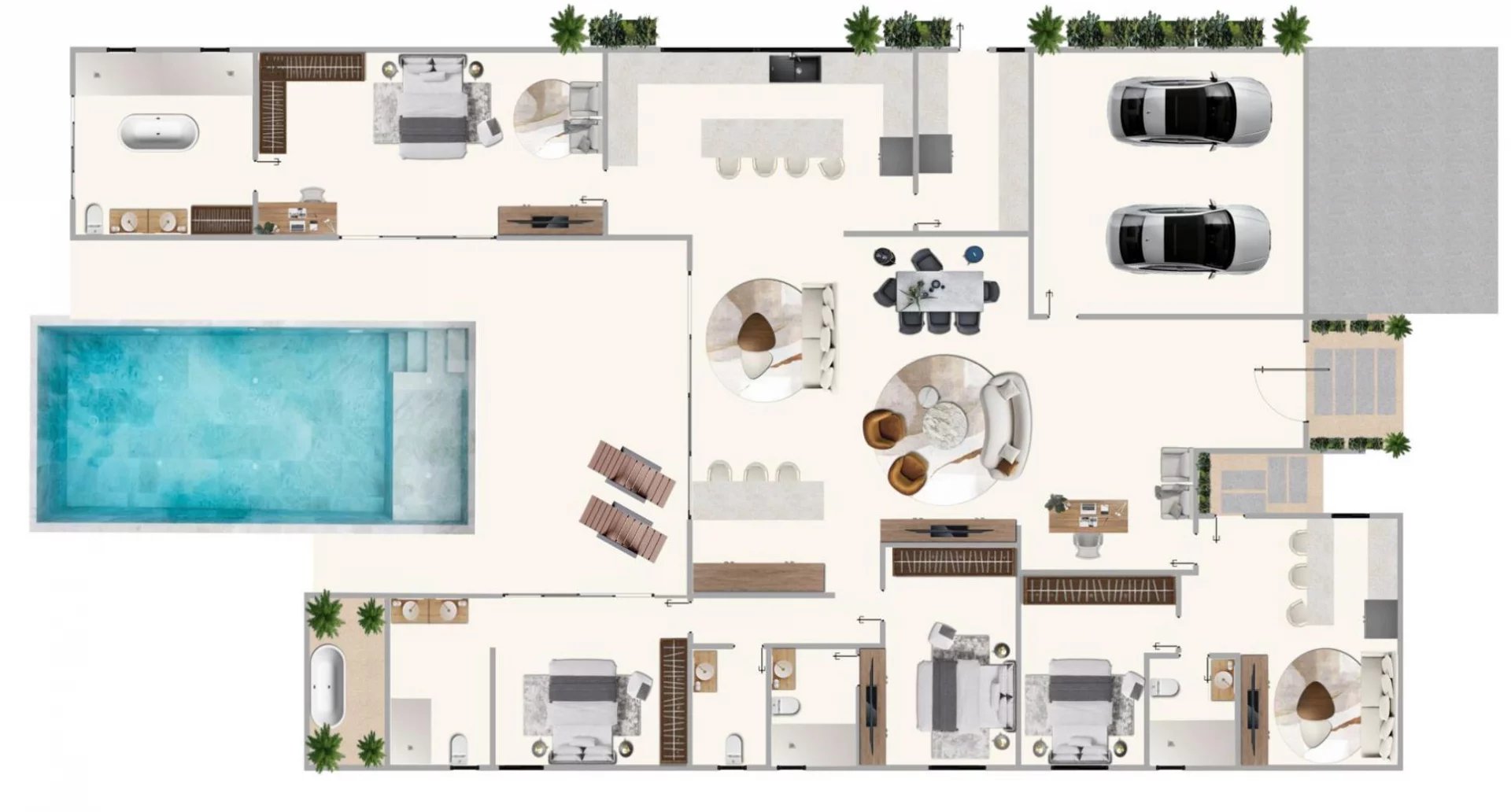 The LENI villa, with a surface area of 435 m², includes 3 bedrooms and a studio. It boasts high ceilings, a private pool, a terrace, and all the modern amenities one could need.