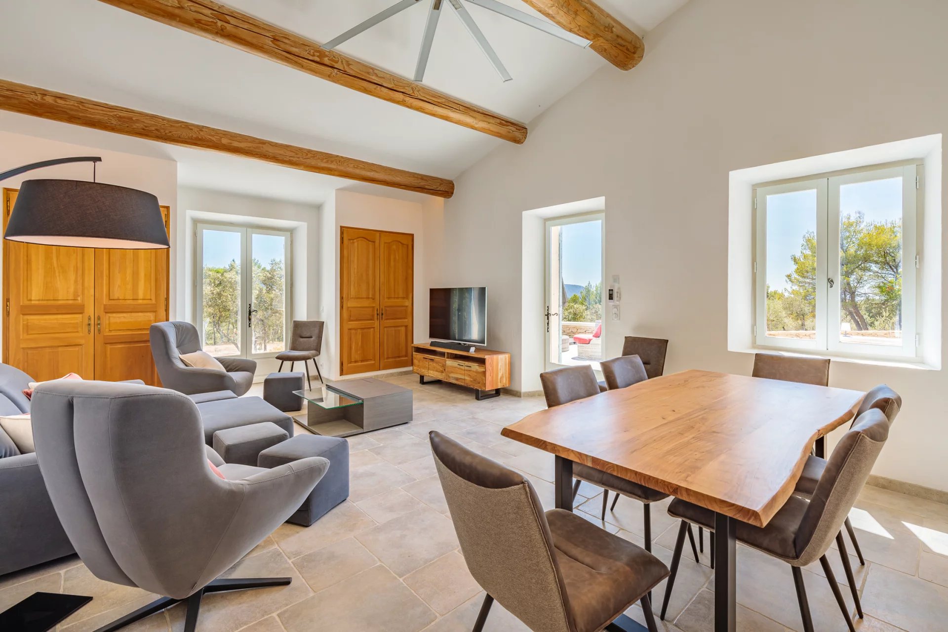 A spacious terrace of more than 180 sqm offers lunch and relaxation areas with an unobstructed view of the Luberon massif. A beautiful heated swimming pool of 7x7 m, with a rounded side, deckchairs, a parasol...