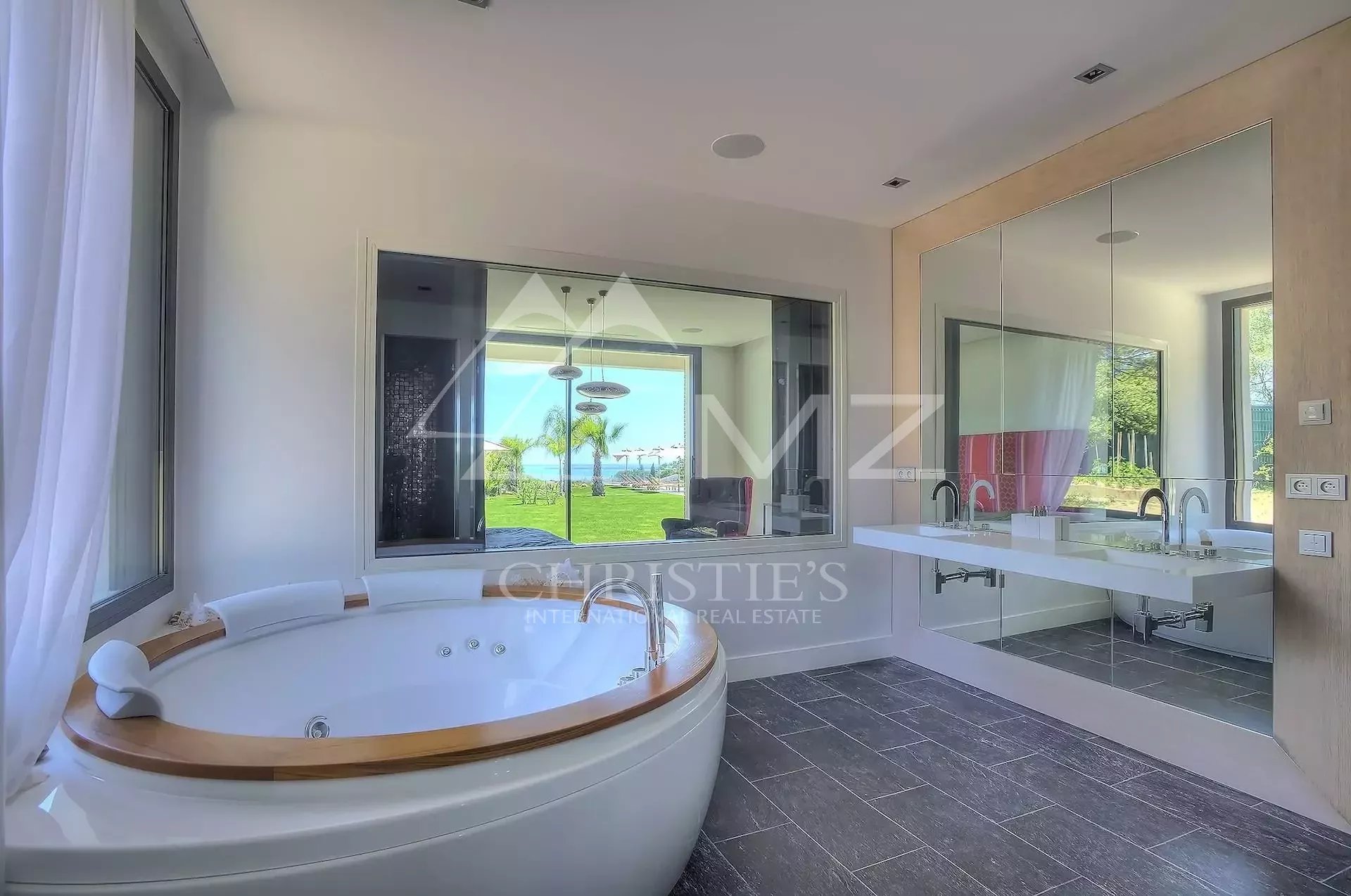 Magnificent contemporary new villa, mainly one storey, on the heights of Antibes. On 500 sqm living space the villa has 5 bedrooms and an apartment as annex, a bright and large living room with view on the Cannes bay, a large kitchen, a TV lounge and a party/music room with Steinway piano. The outside terraces lay in front of the living room and close to the large heated overflow pool. Located in a calm and residential area, the 8000 sqm landscaped gardens bordering the forest offer panoramic views from the surrounding hills down to the Lérins islands. 5 minutes from the sandy beaches, the old town of Antibes with its restaurants and Marché Provençal and only 10 minutes from Cannes Croisette.