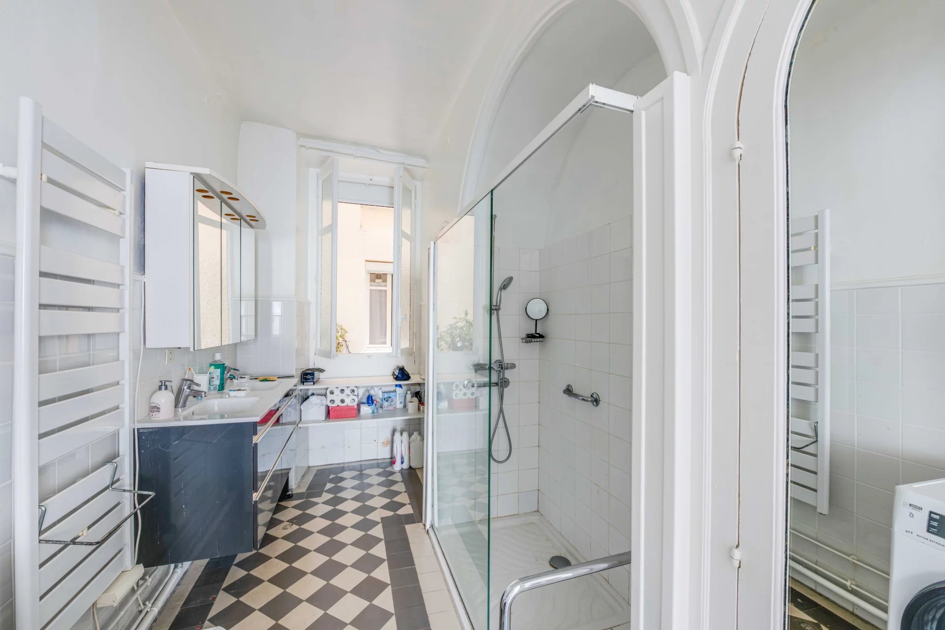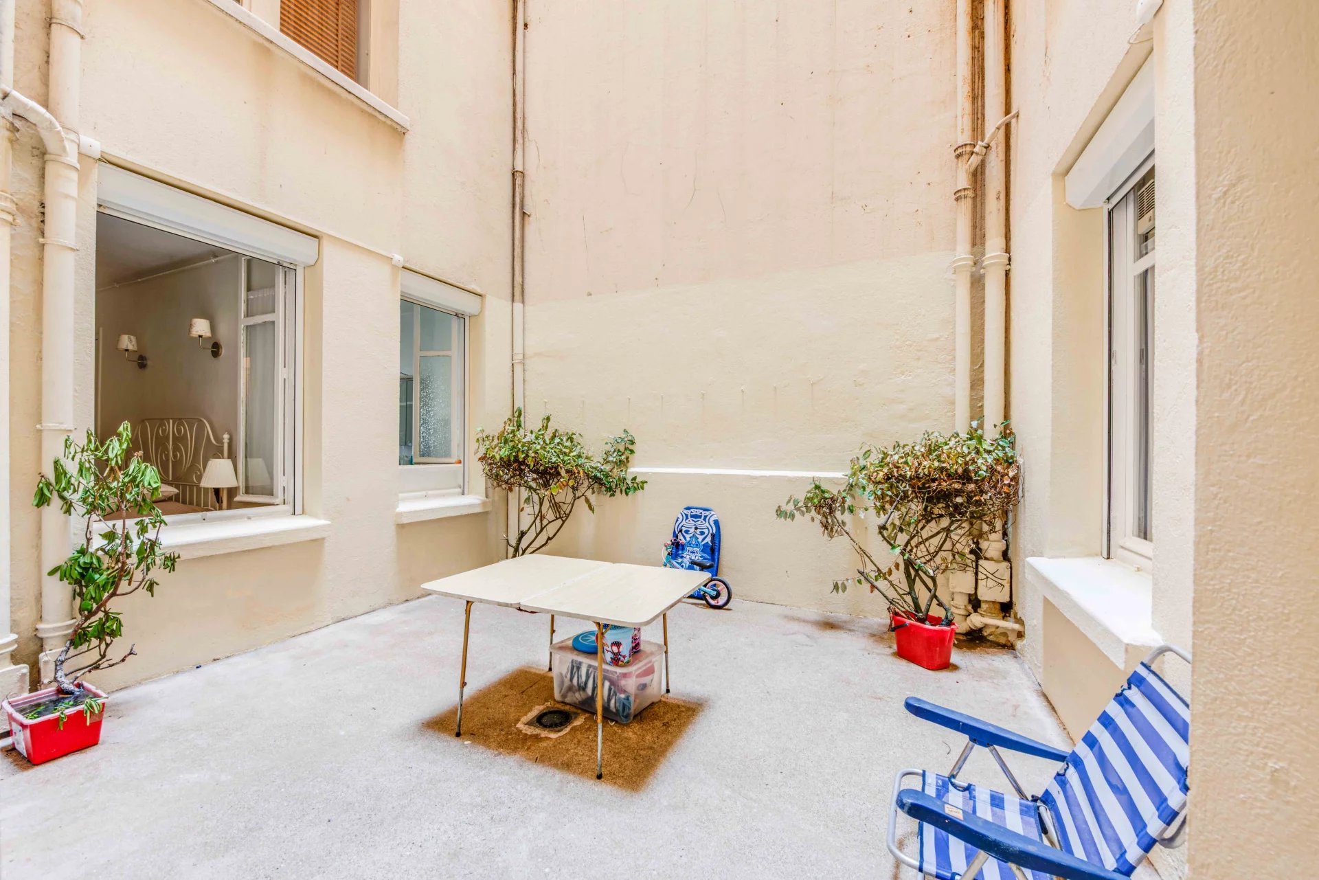 With a surface area of 105 m2 carrez, this charming apartment with patio and large volumes comprises a large entrance hall with separate toilet, a double reception room with its beautiful period fireplace and four large windows, a shower room and toilet, two bedrooms, one with its own shower cubicle, and a large kitchen/diner opening onto a patio of approx. 18 m2.