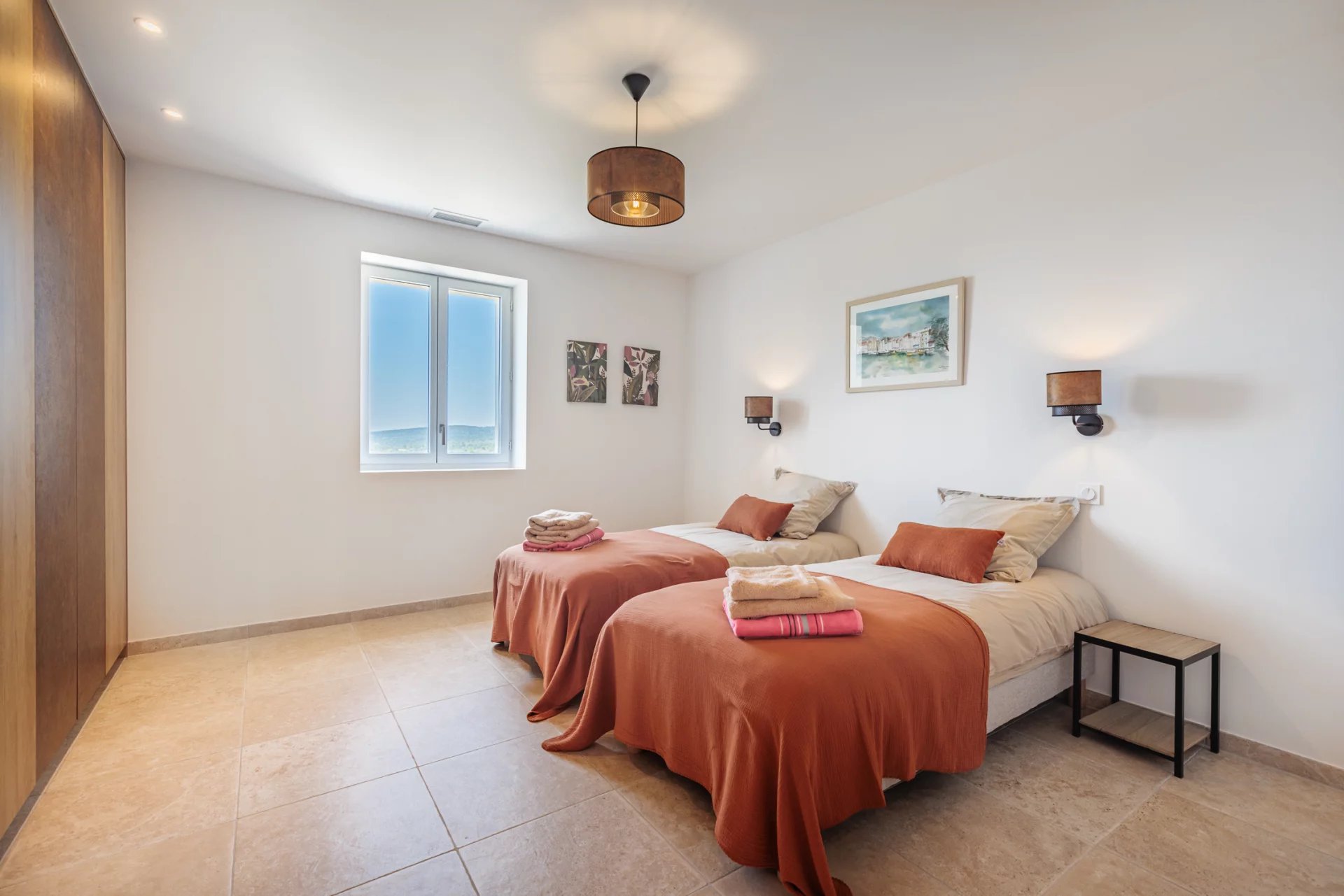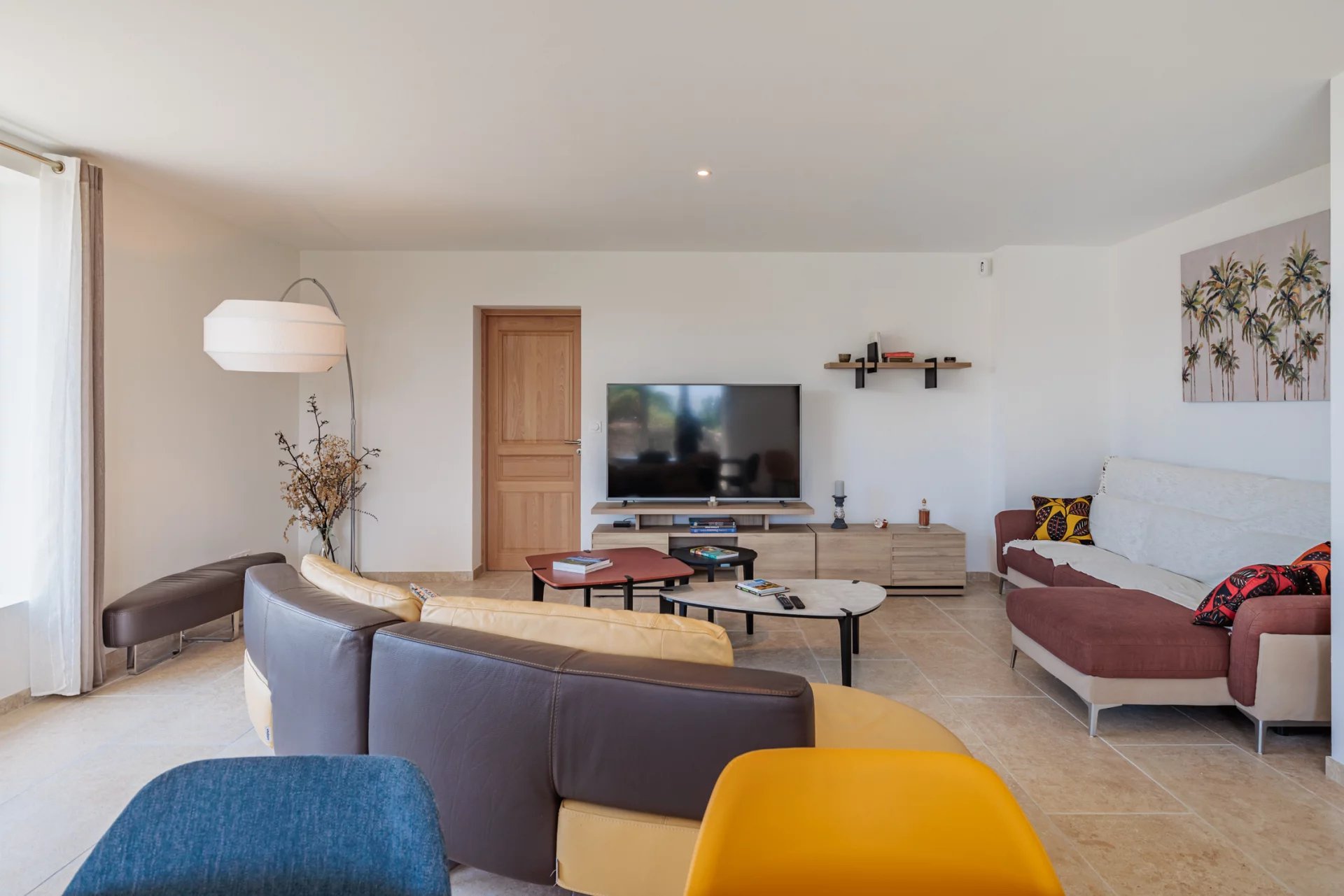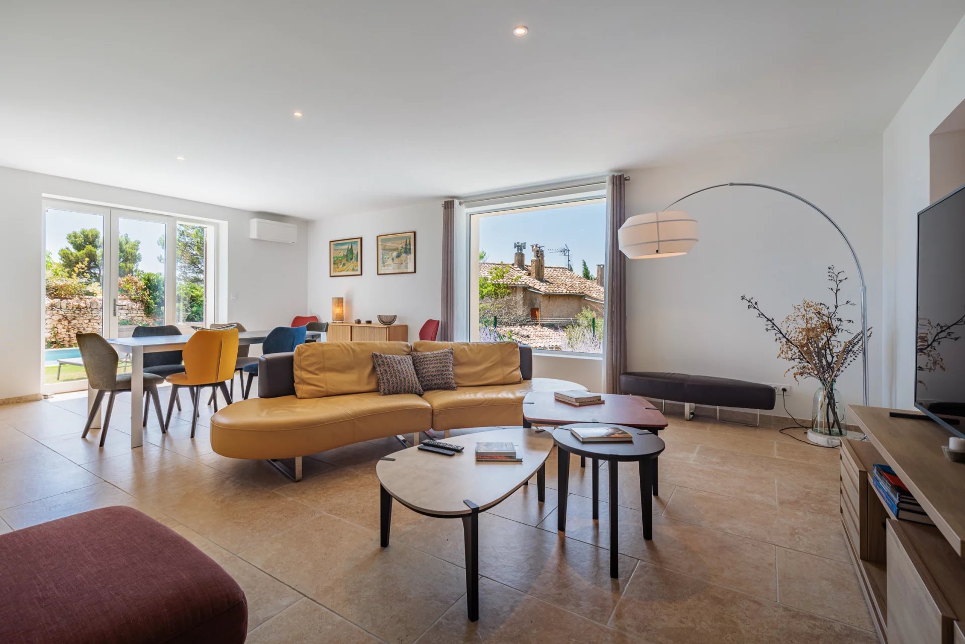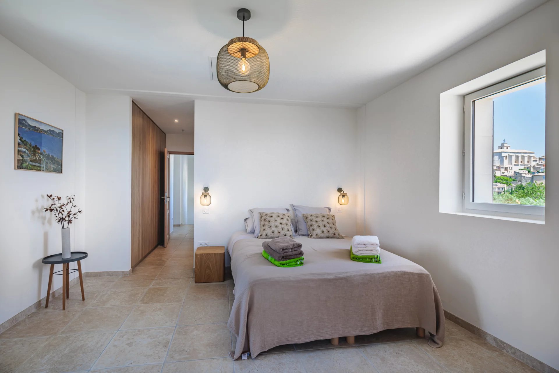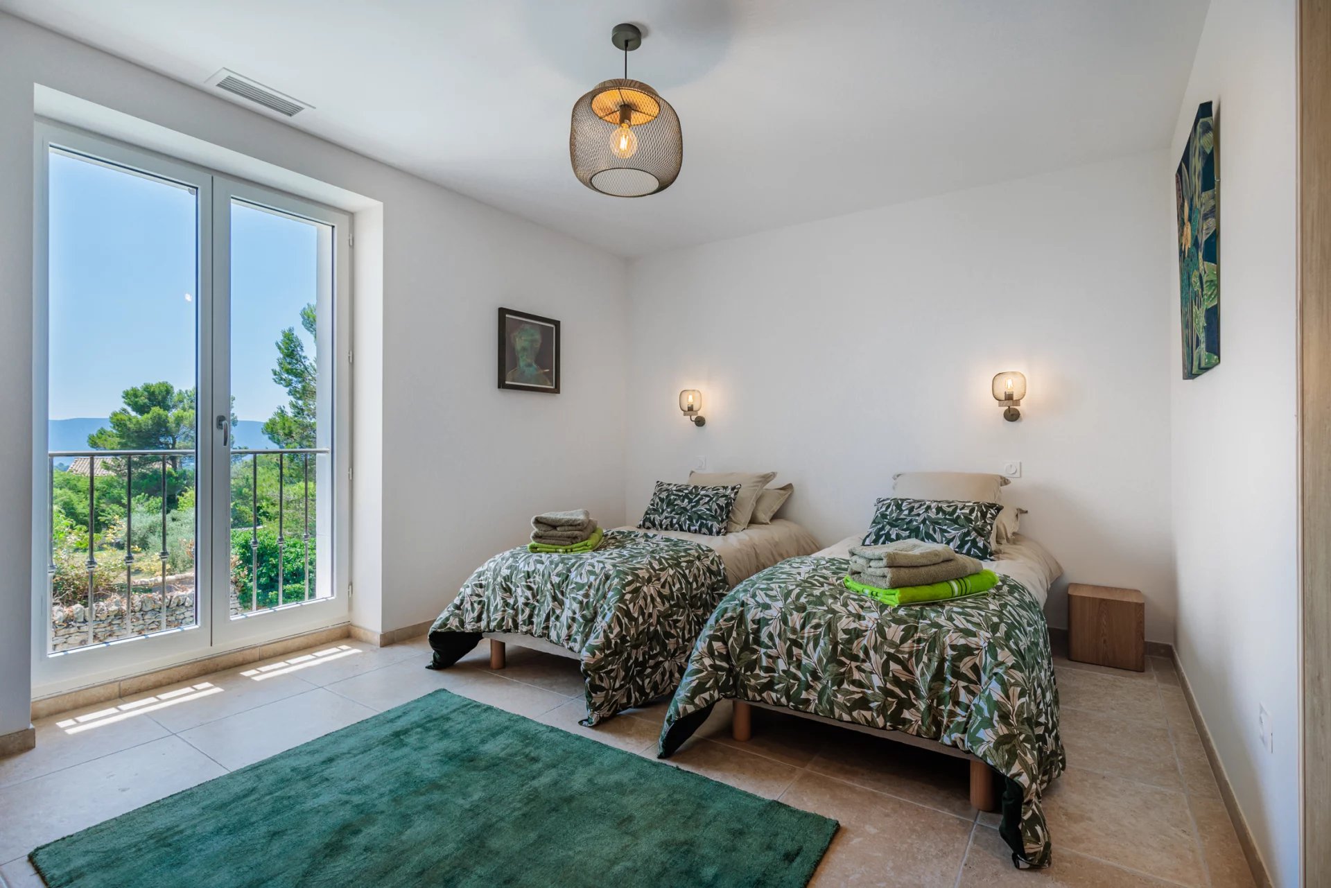 The interior, modern and bright, offers two well-appointed levels with the day area on the ground floor, open and functional. The sleeping area, upstairs, includes 5 beautiful en-suite bedrooms, the most spacious of which has a private terrace and a view of the perched village.
