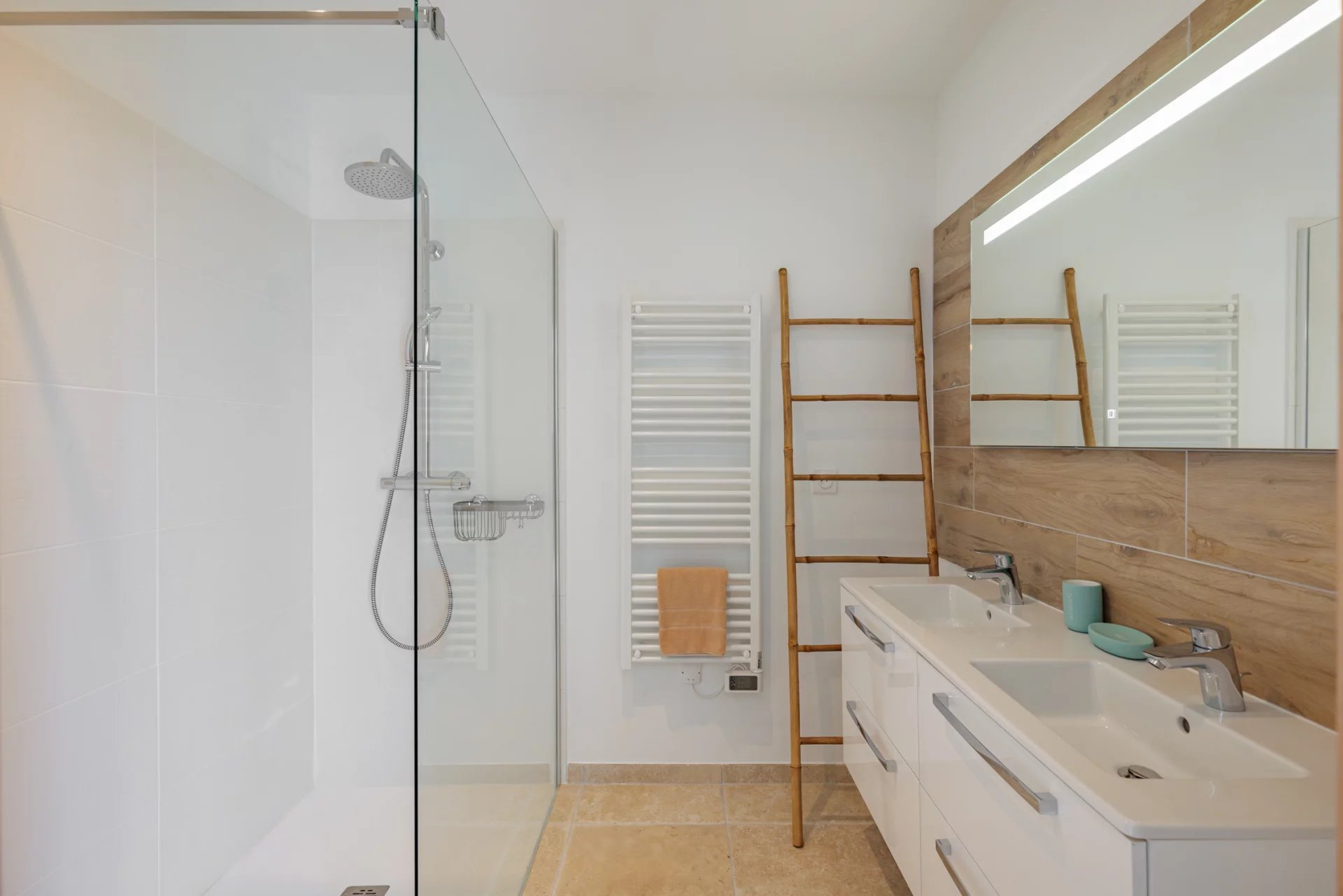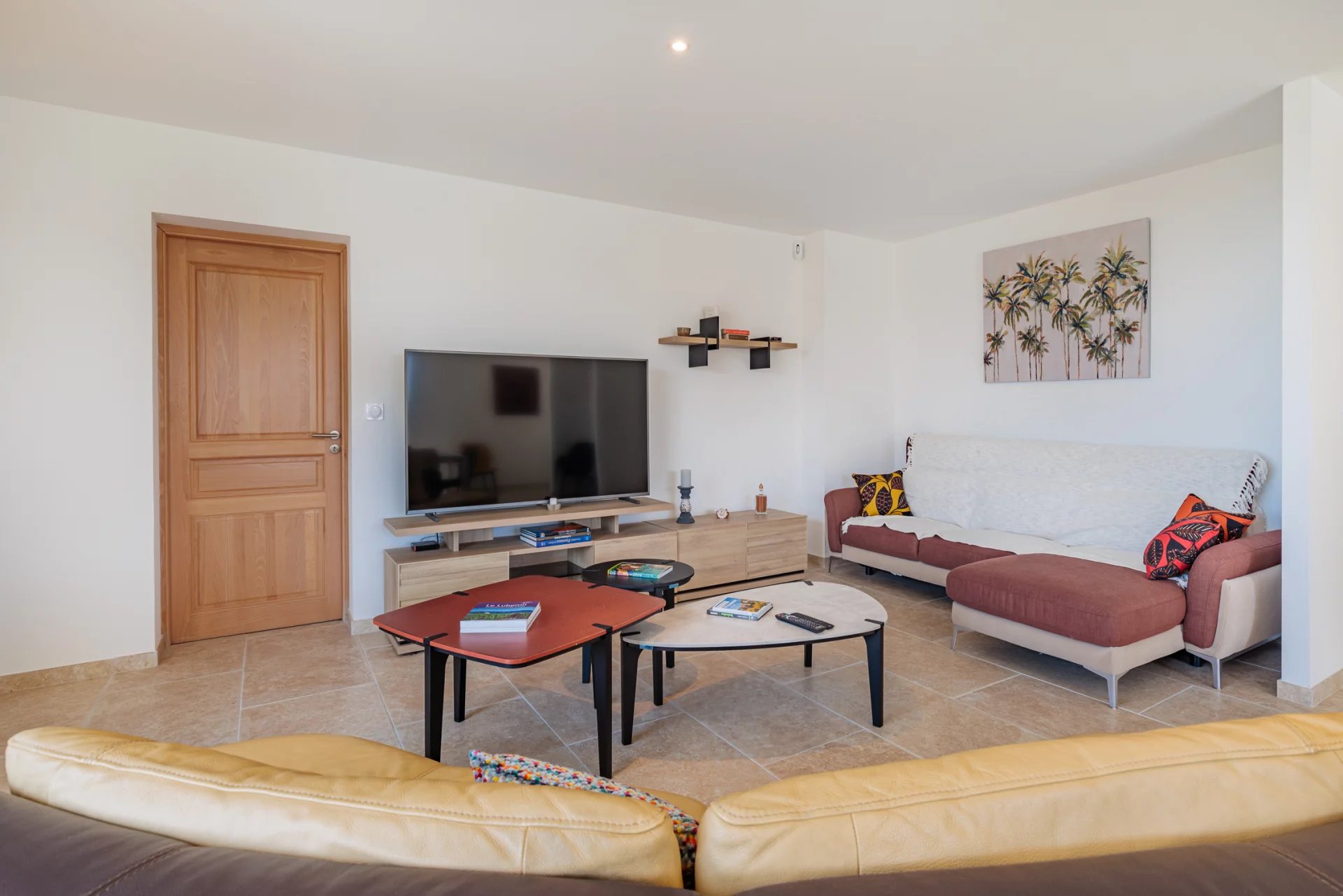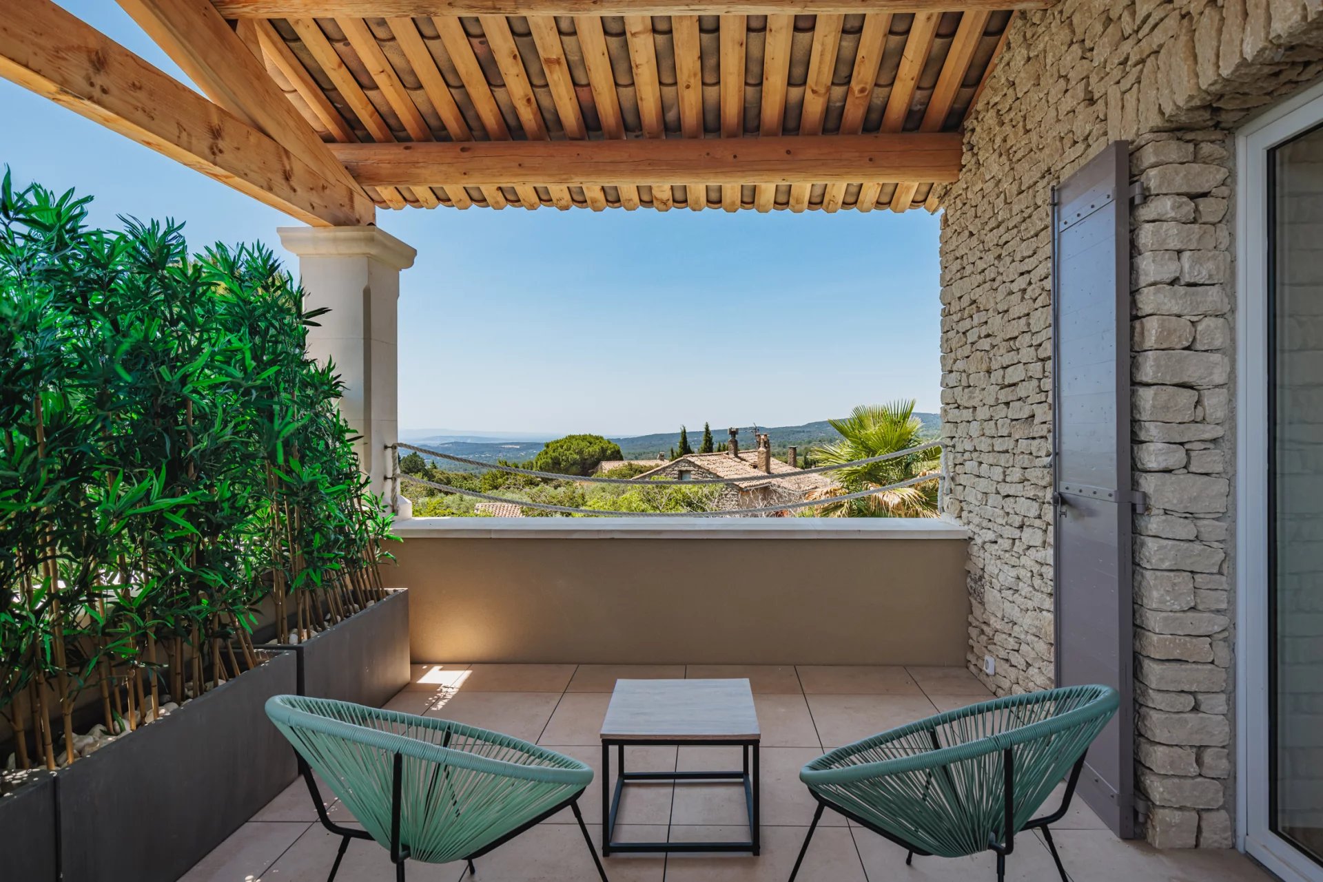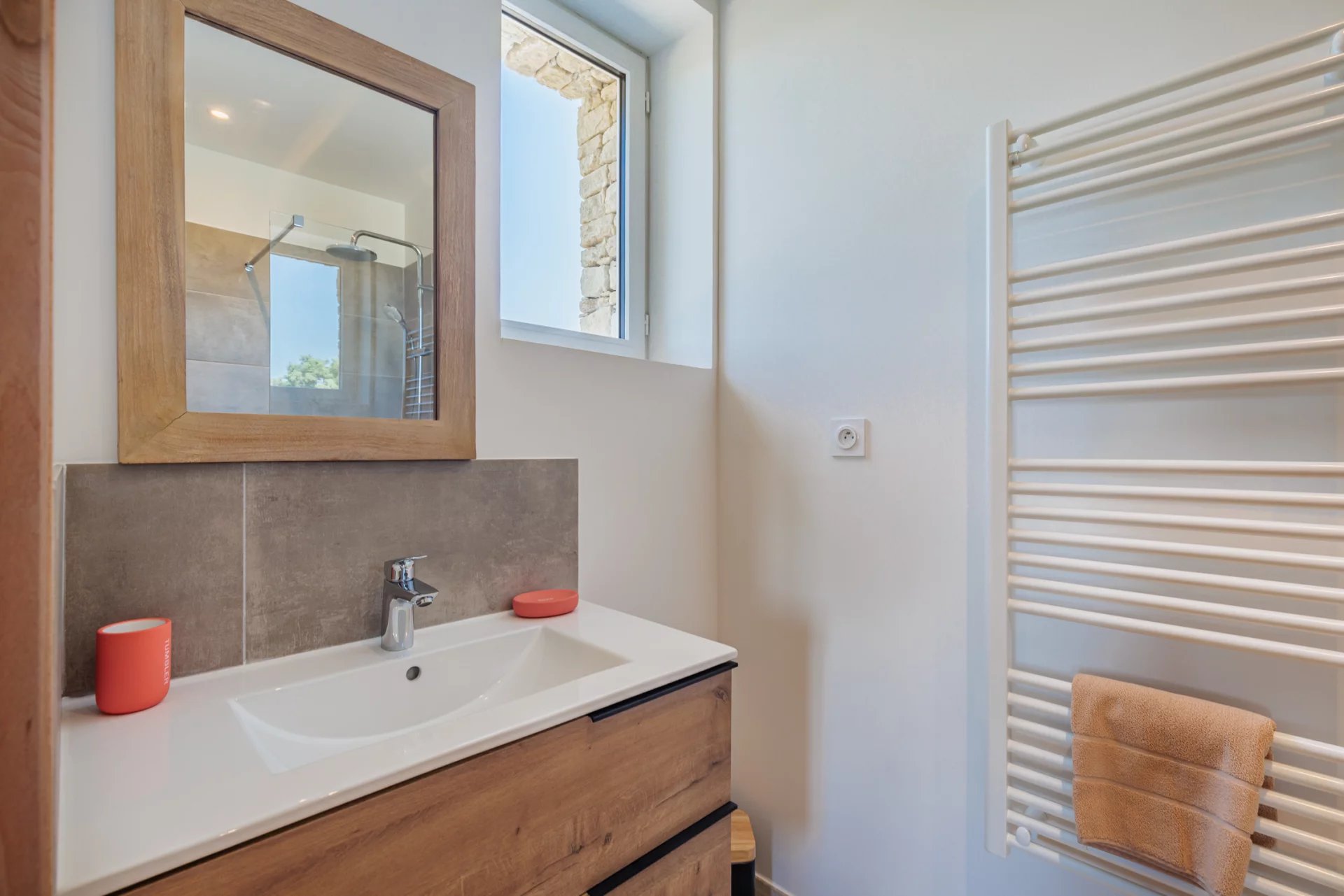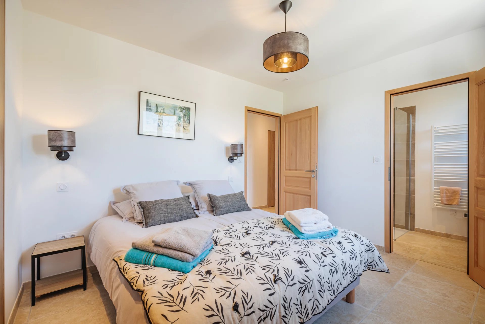 The interior, modern and bright, offers two well-appointed levels with the day area on the ground floor, open and functional. The sleeping area, upstairs, includes 5 beautiful en-suite bedrooms, the most spacious of which has a private terrace and a view of the perched village.