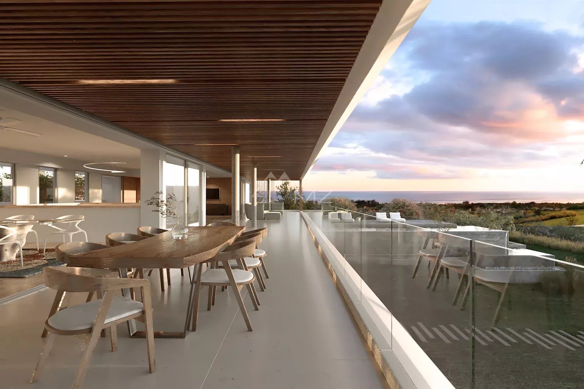 The spacious living room with its open kitchen spreads out in double height on its central section establishing the link between the upper and lower gardens of the property. The long infinity pool faces the ocean and constitutes the linking pillar of the villa's landscaped spaces.
