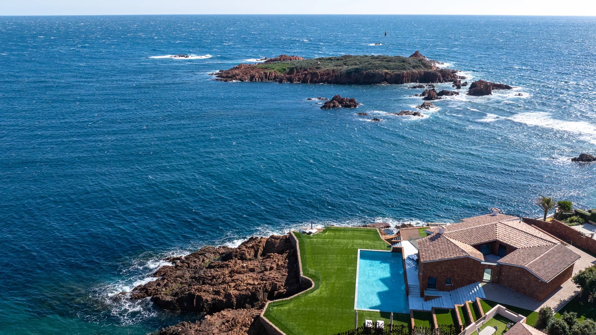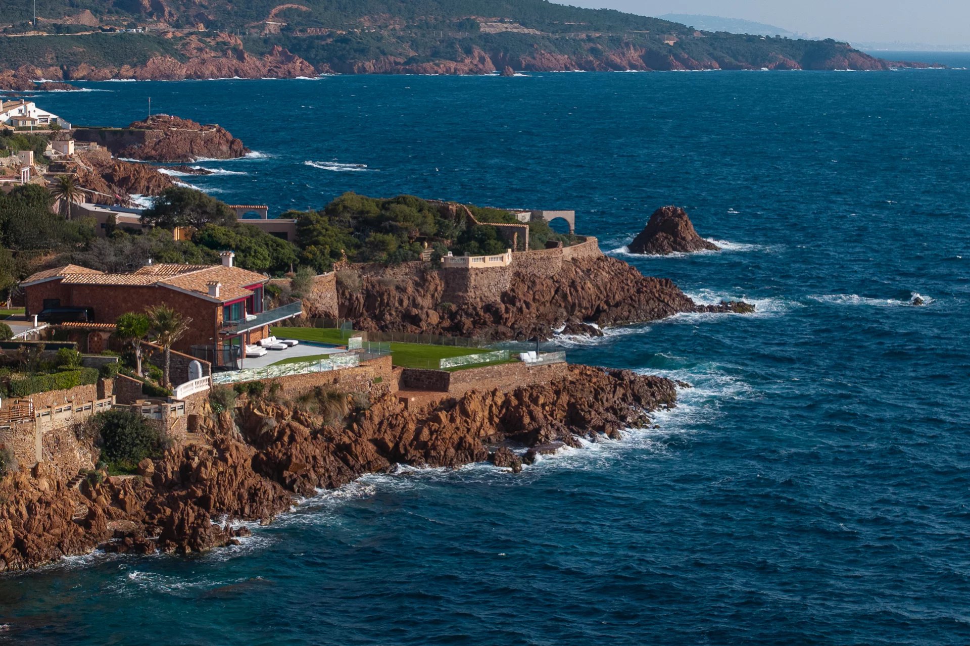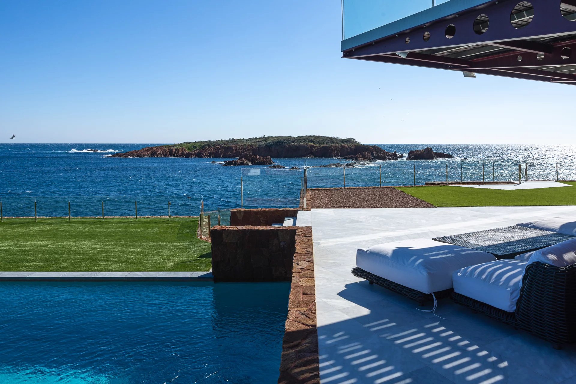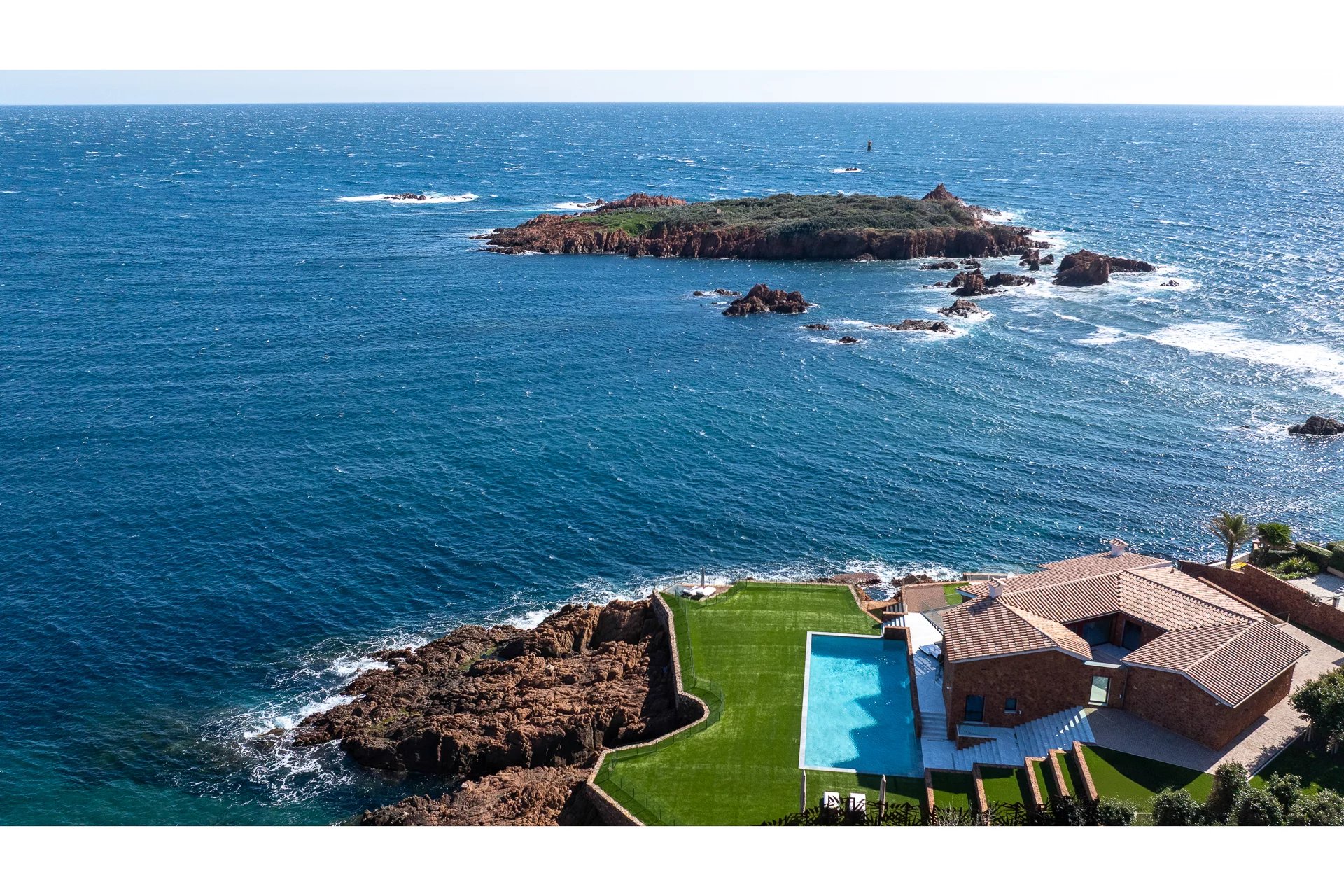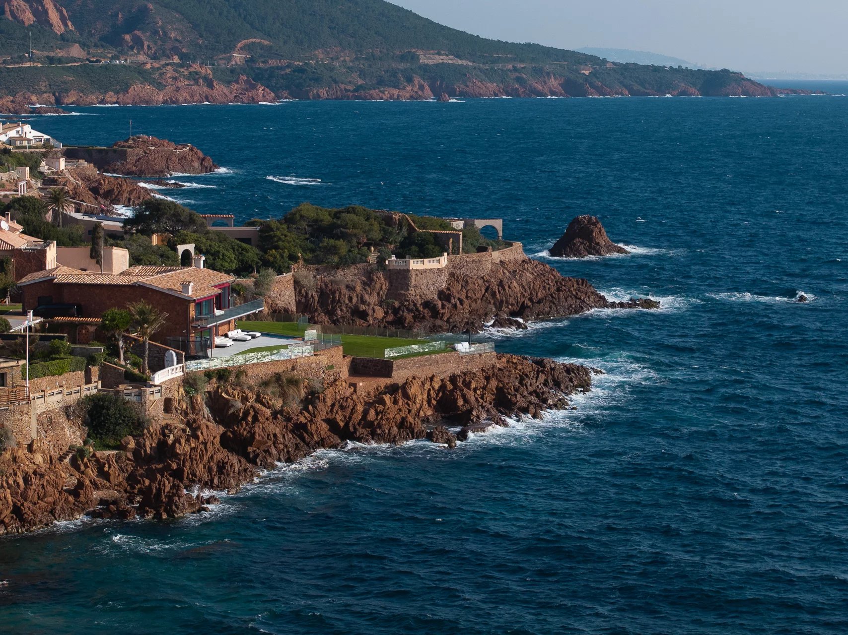 Located in an idyllic setting between Cannes and Saint-Tropez, this stunning waterfront villa offers a unique panoramic view of the Mediterranean, facing the Île des Vieilles and near the protected Cap Roux nature reserve.