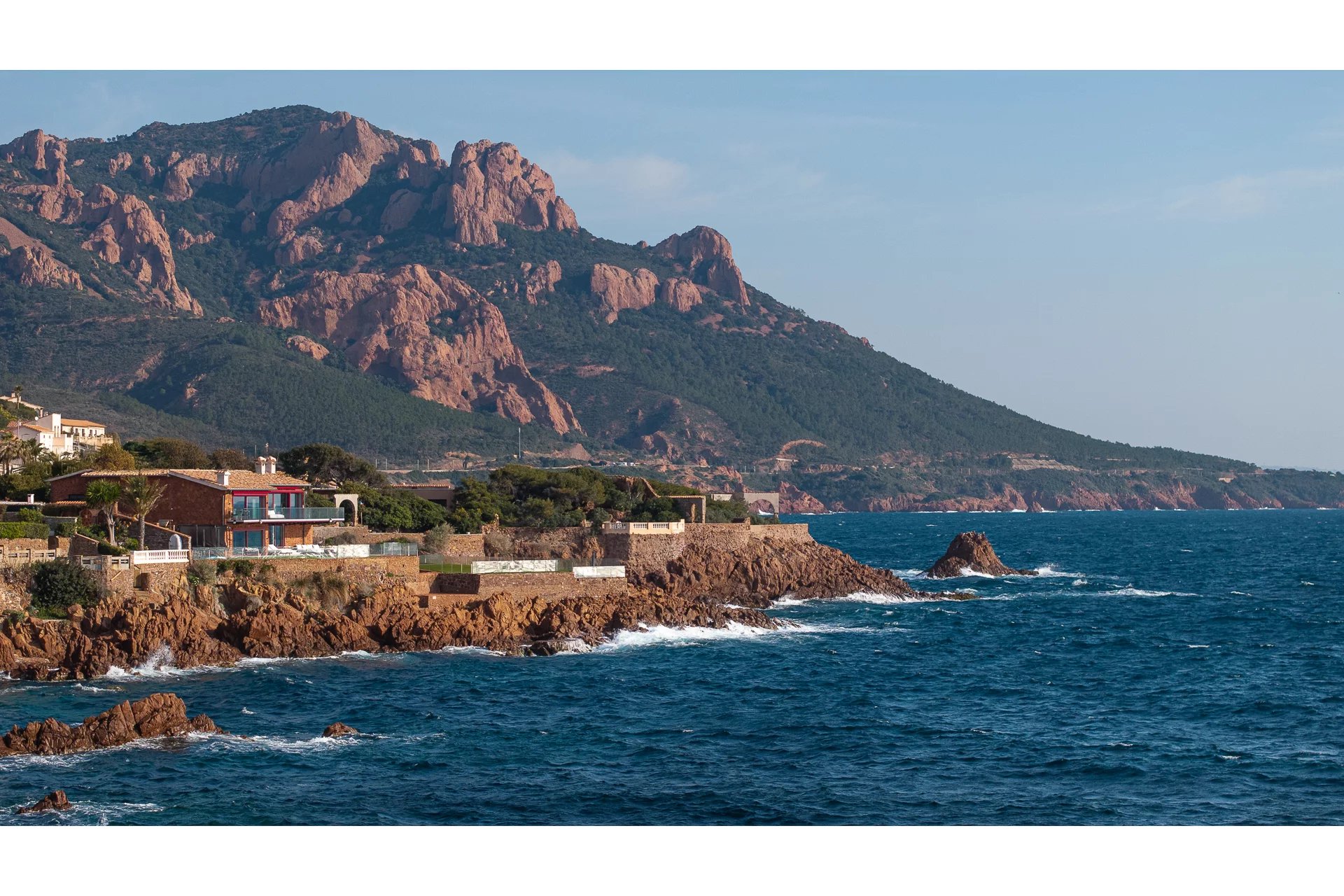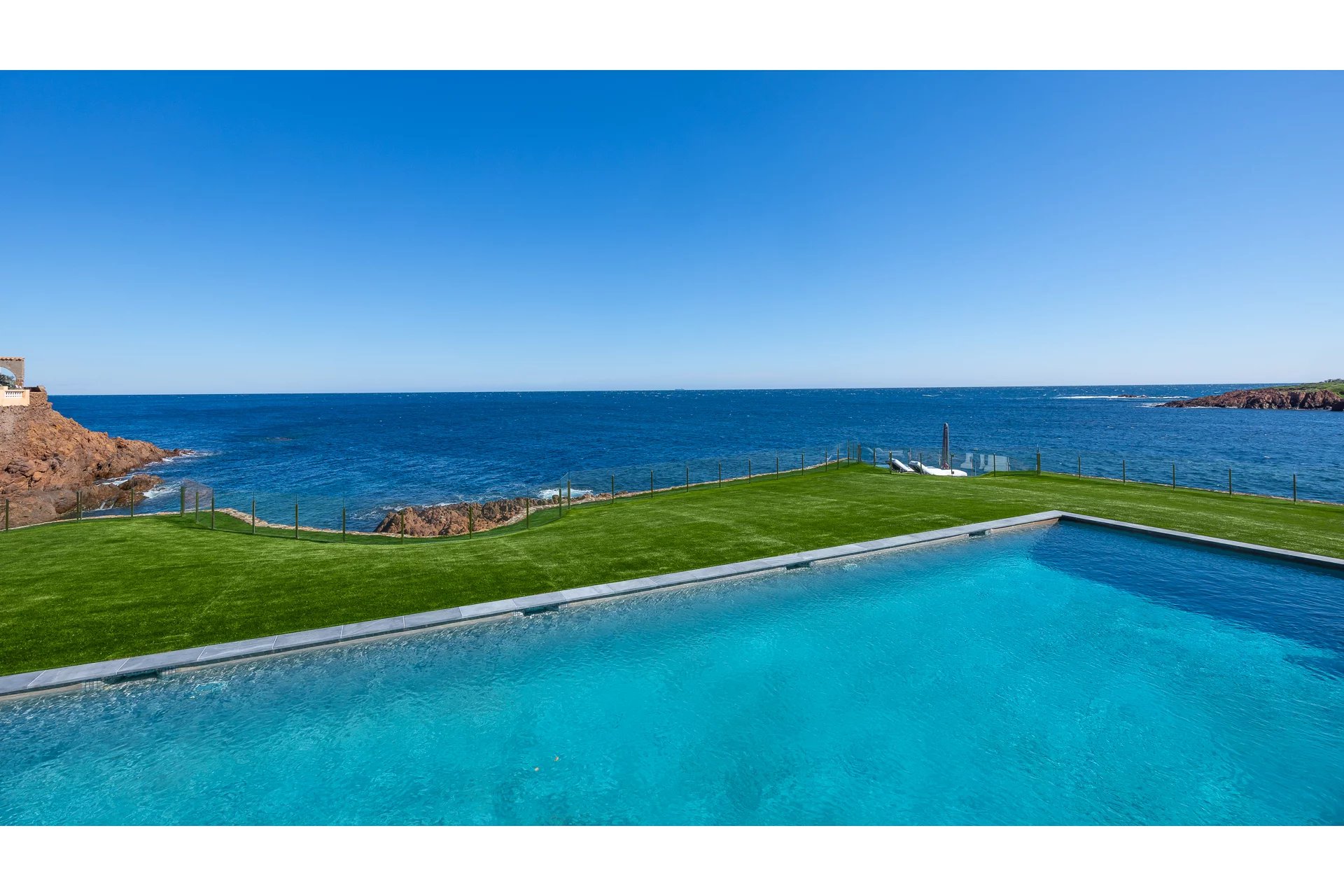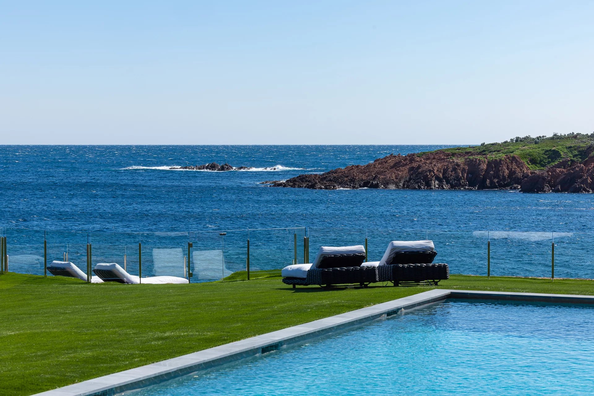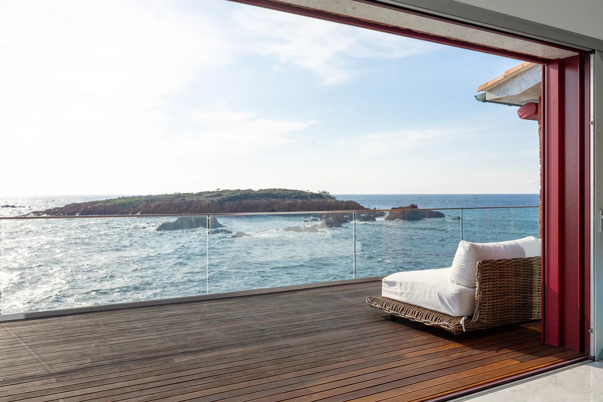 Located in an idyllic setting between Cannes and Saint-Tropez, this stunning waterfront villa offers a unique panoramic view of the Mediterranean, facing the Île des Vieilles and near the protected Cap Roux nature reserve.