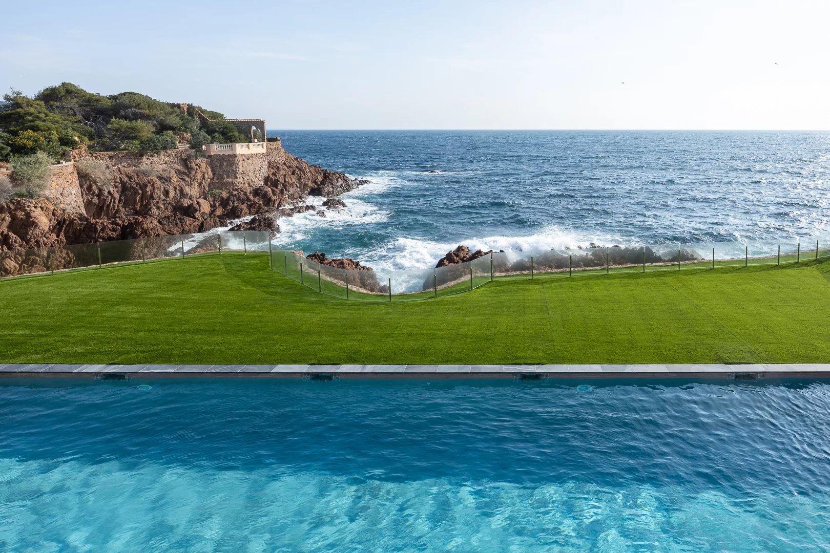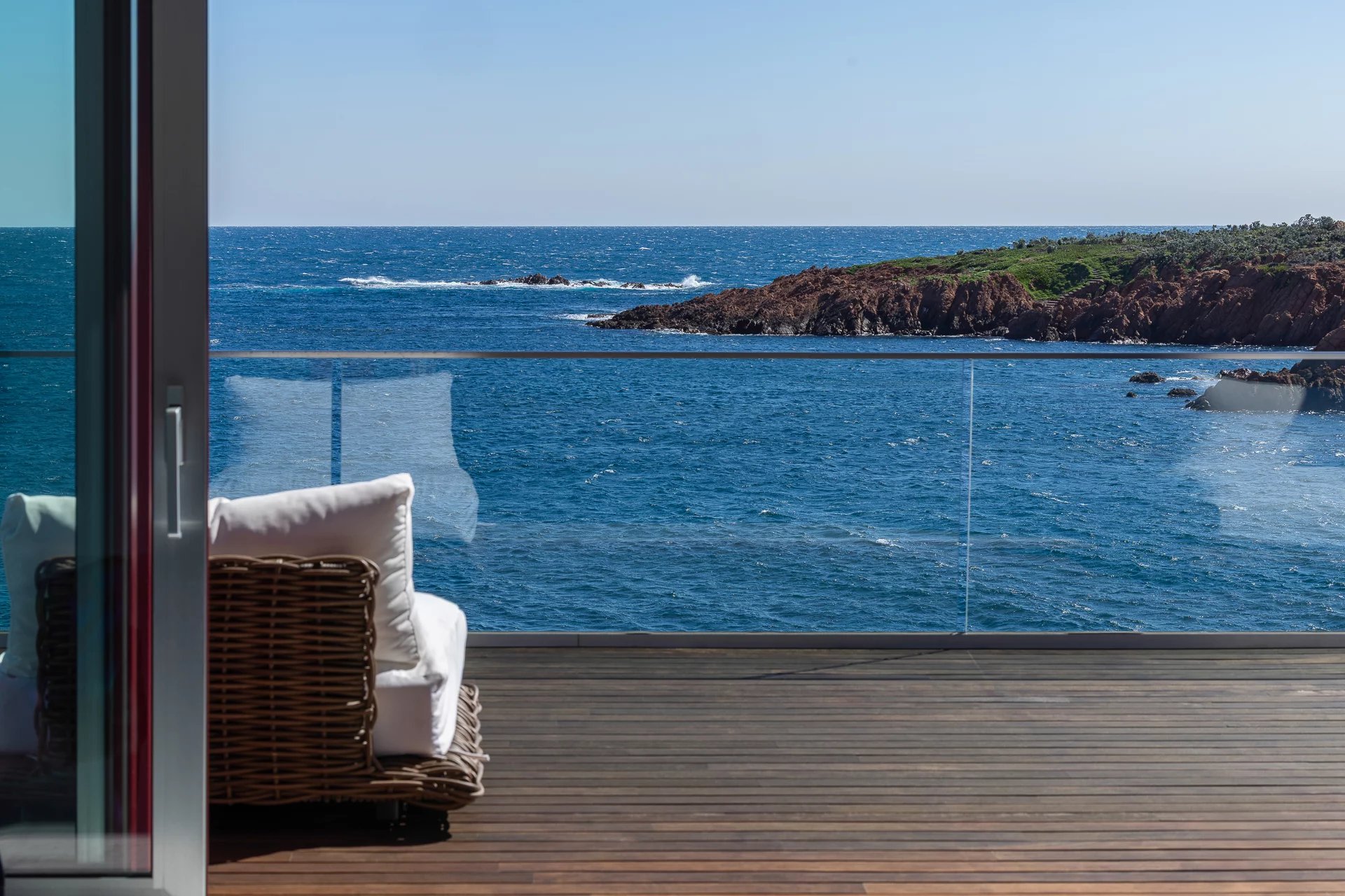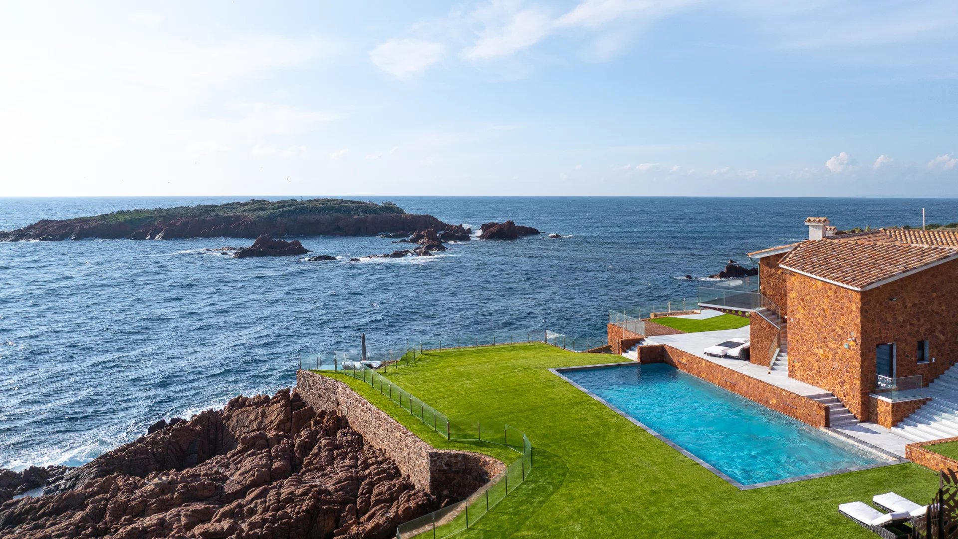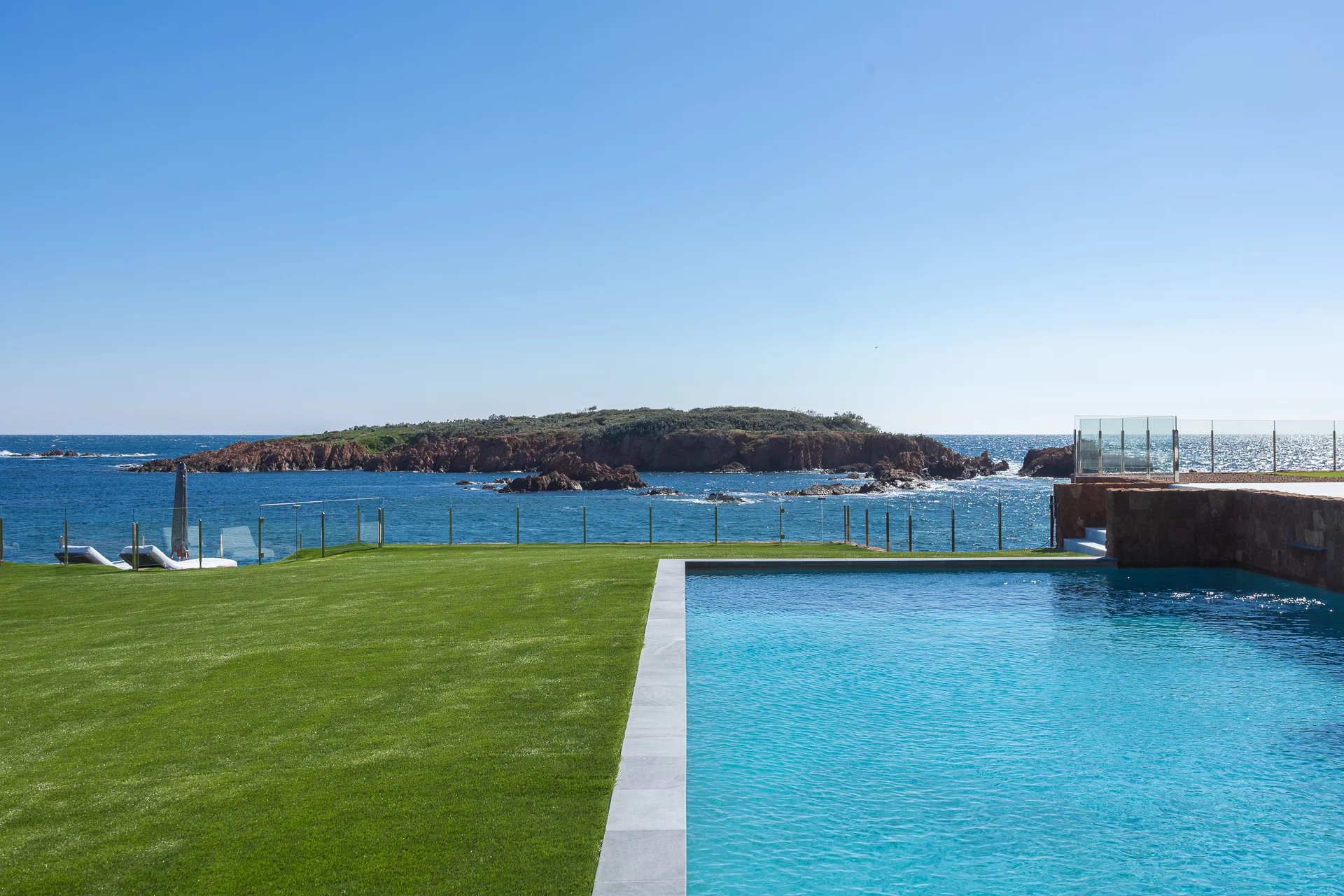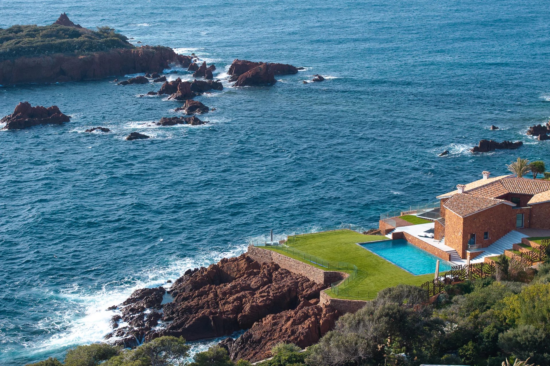 Located in an idyllic setting between Cannes and Saint-Tropez, this stunning waterfront villa offers a unique panoramic view of the Mediterranean, facing the Île des Vieilles and near the protected Cap Roux nature reserve.