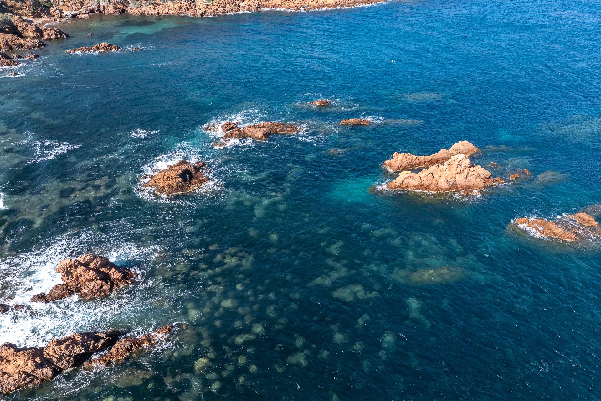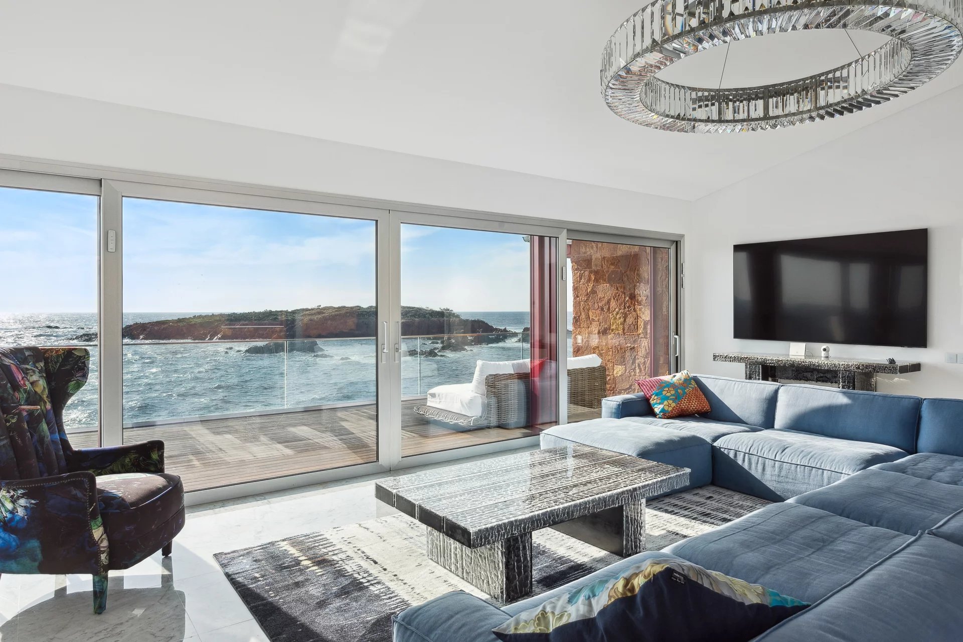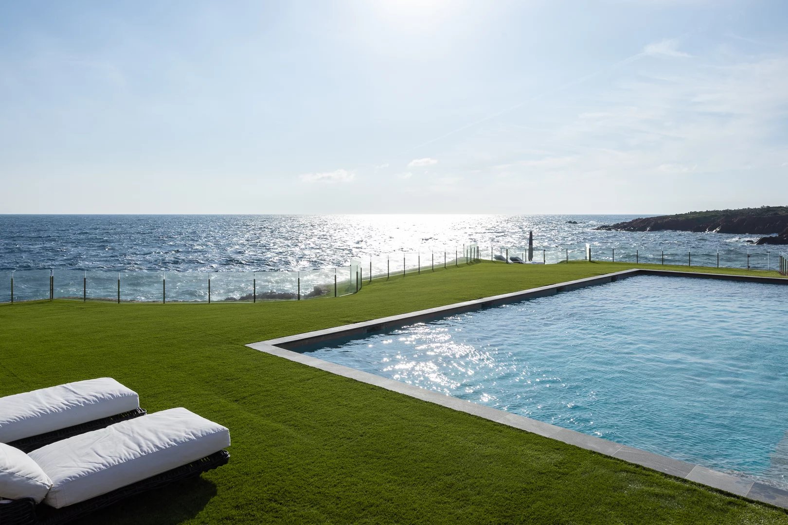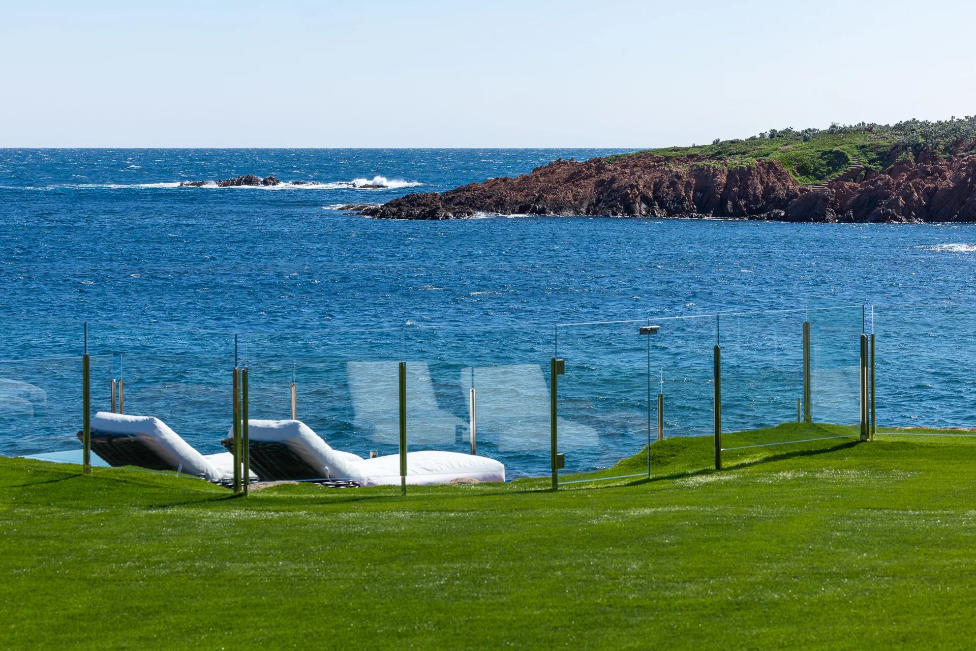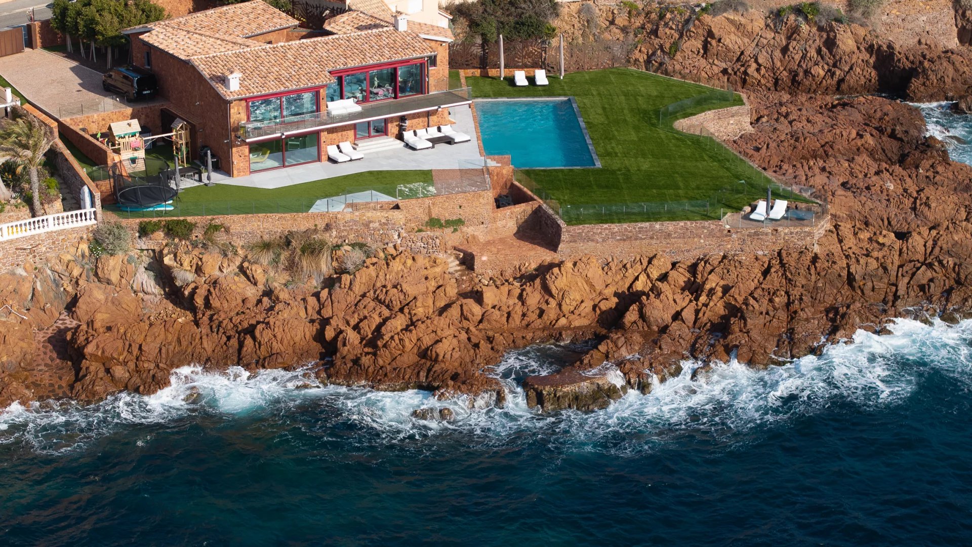 Located in an idyllic setting between Cannes and Saint-Tropez, this stunning waterfront villa offers a unique panoramic view of the Mediterranean, facing the Île des Vieilles and near the protected Cap Roux nature reserve.