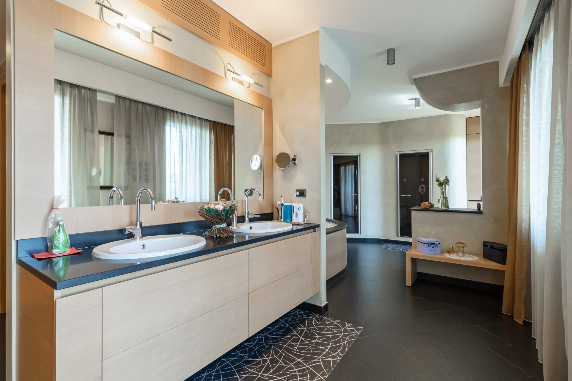 The duplex penthouse is divided as follows: on the eighth floor we can find a living area comprising of an entrance hall, guest bathroom, living room, kitchen, laundry room, cloakroom and study, and a night area consisting of two bedrooms, a bathroom, a huge 120 m2 master bedroom with en suite bathroom, walk-in closet and wellness area with Finnish sauna.