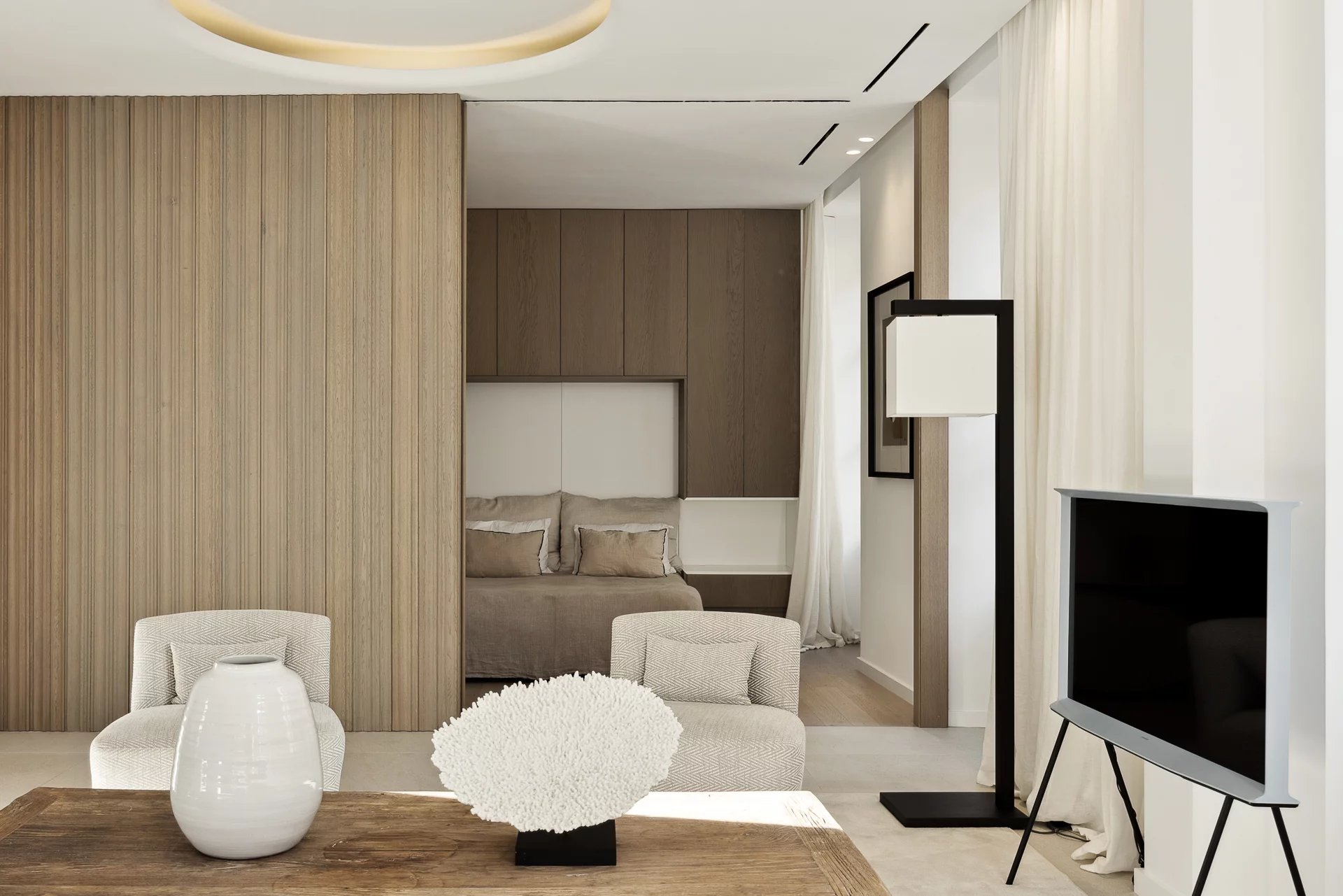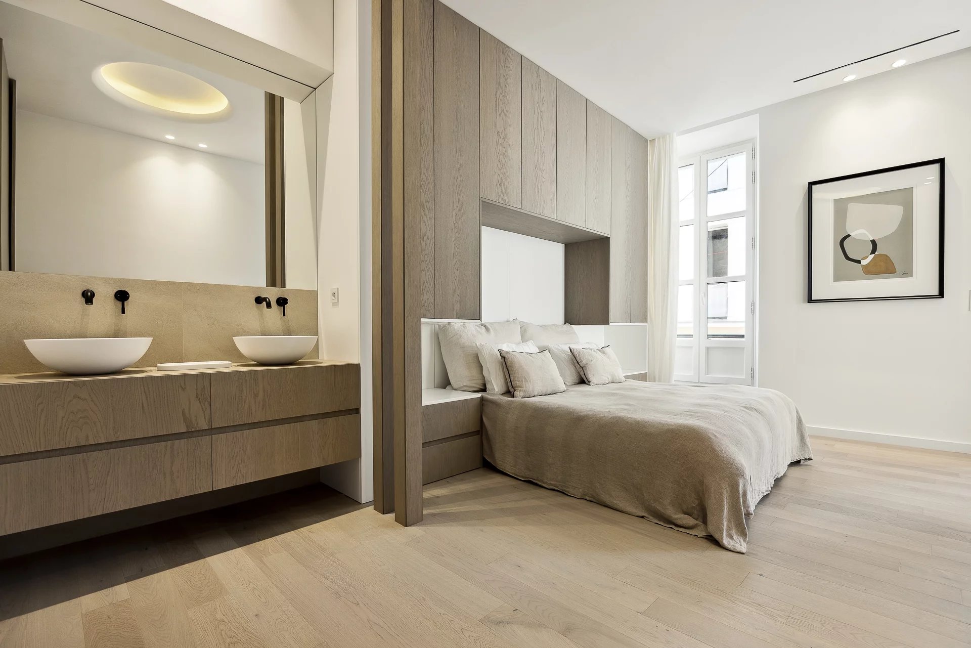 In the heart of Cannes town centre, on Rue d'Antibes, in the heart of a bourgeois building: magnificent 3-room flat, fully renovated to a very high standard, with sublime ceiling heights. It comprises an entrance hall, living/dining room, open-plan fitted kitchen, 2 bedrooms, one of which is a masterbedroom with its own shower room and toilet. A second shower room and guests toilet.