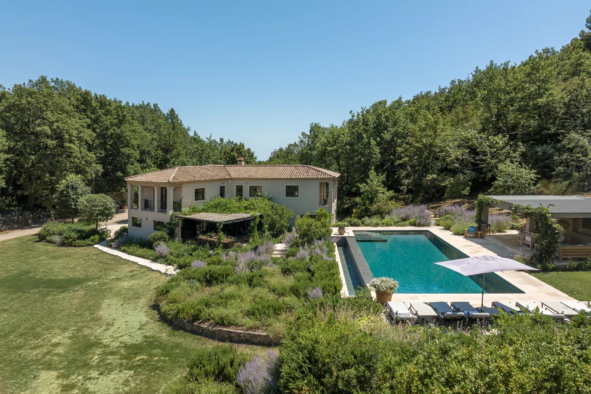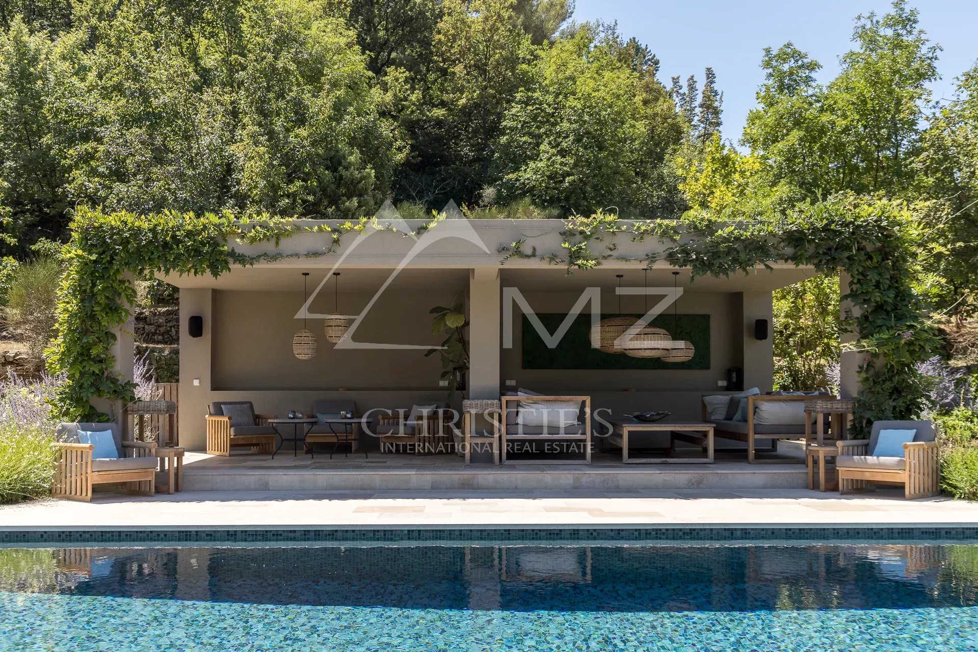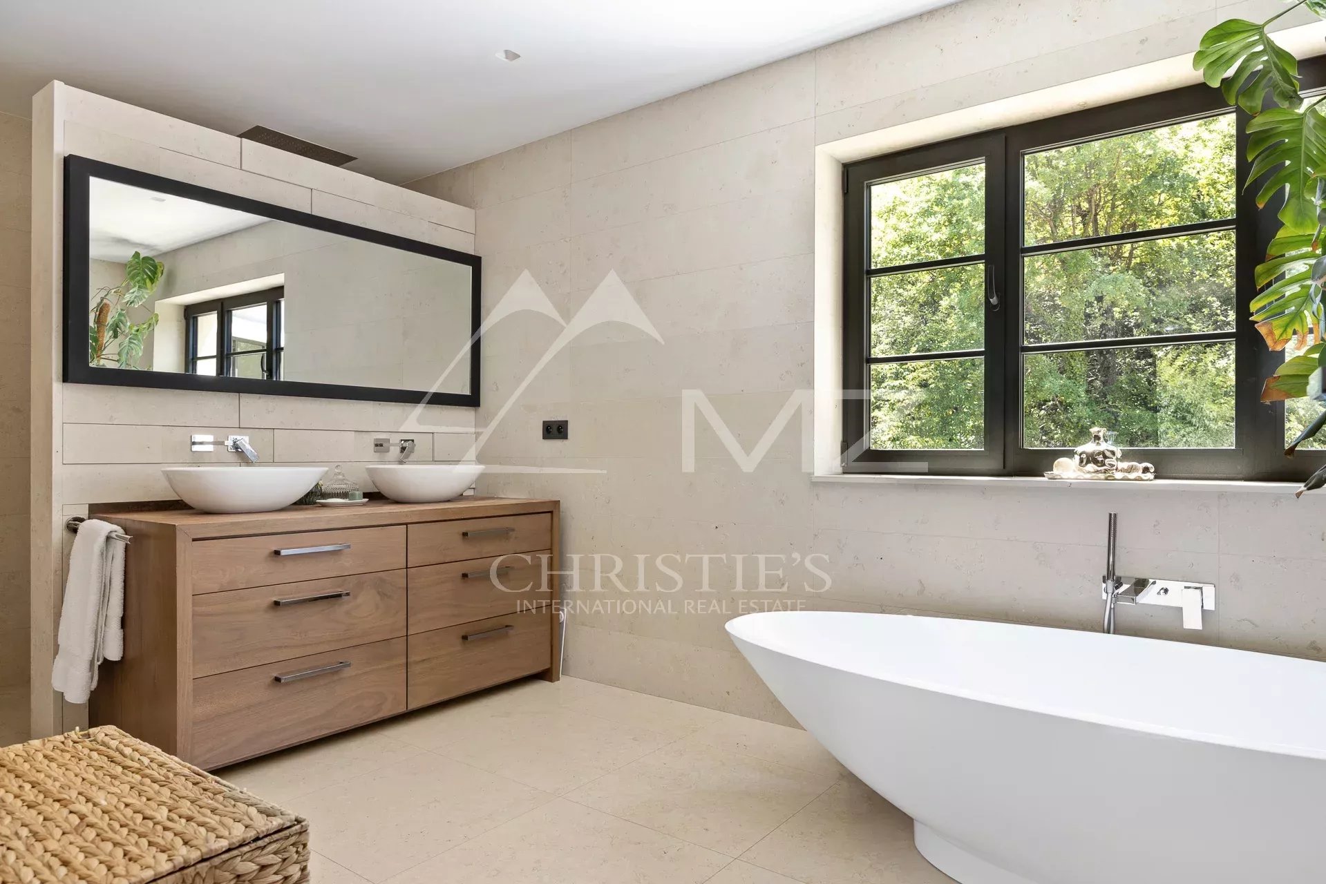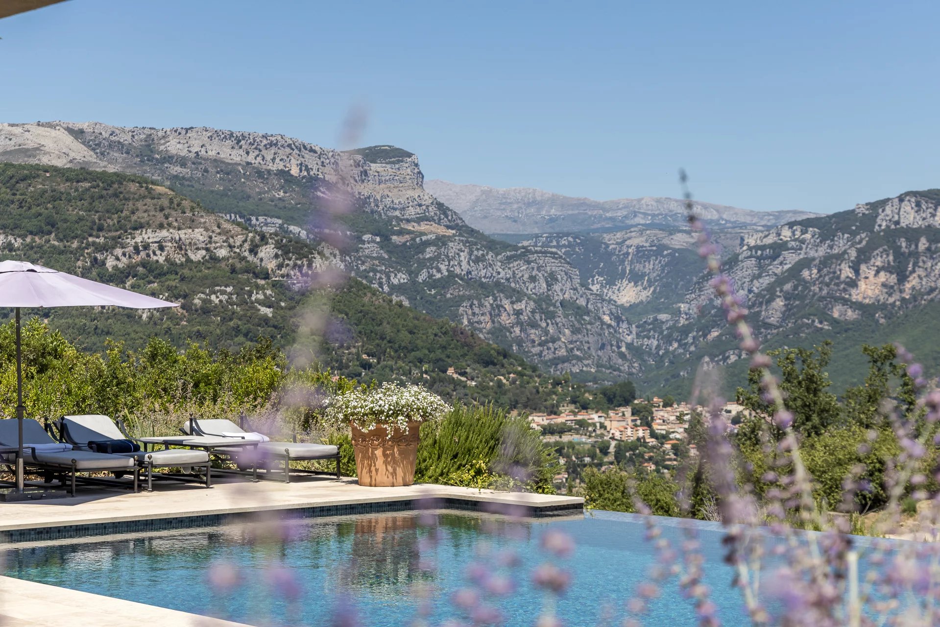Nestled in a natural, peaceful setting, yet close to shops, this stunning property offers breathtaking panoramic views over the Gorges du Loup.
