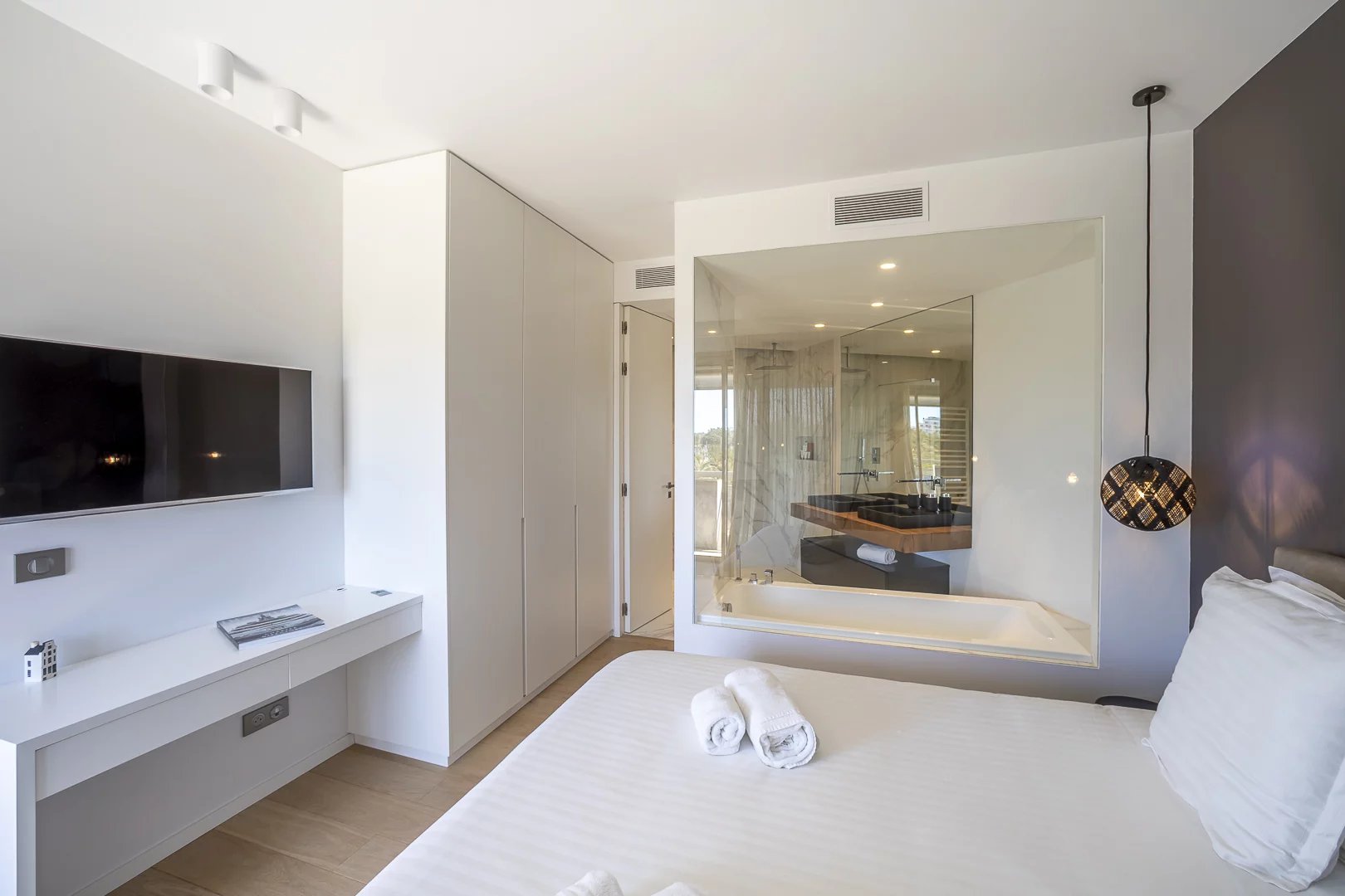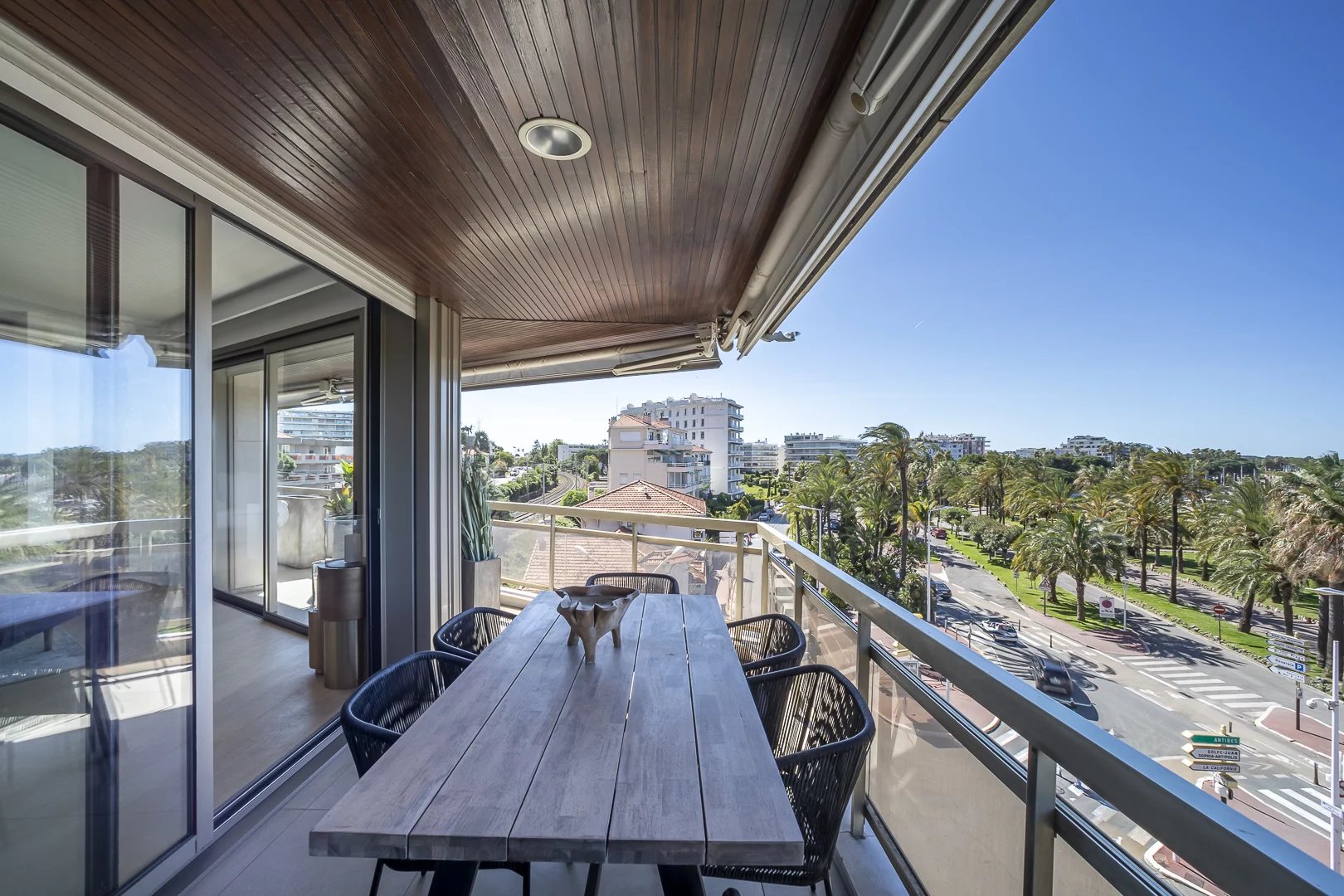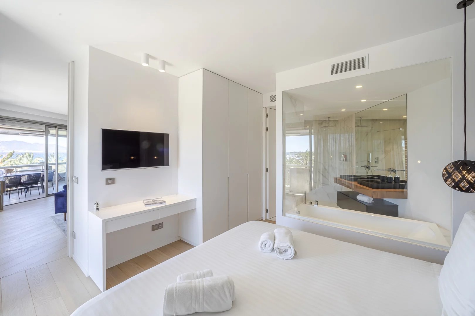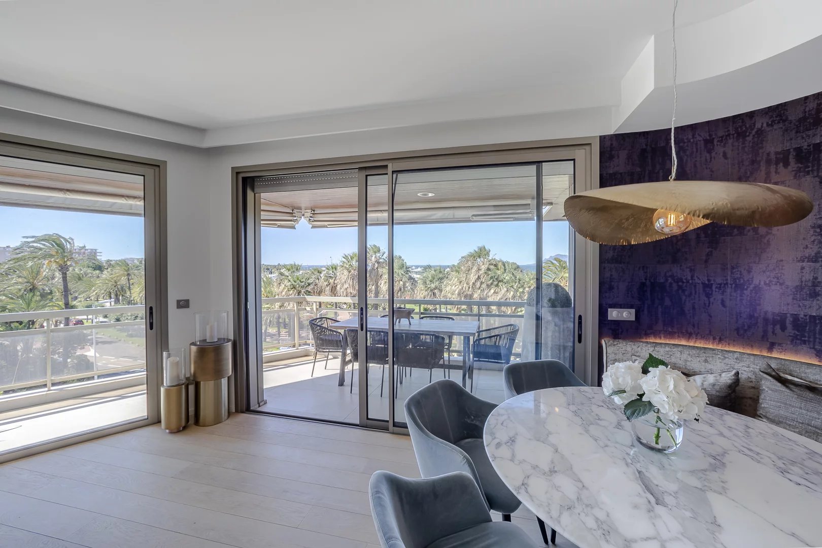 Magnificent completely renovated apartment of approximately 95 m², comprising: a living room with dining room and open fitted kitchen, two en-suite bedrooms with shower room and a master bedroom with bathroom / shower. Large sea view terrace with lounge and outdoor dining room. On foot from the beaches and the Palais des Festivals.