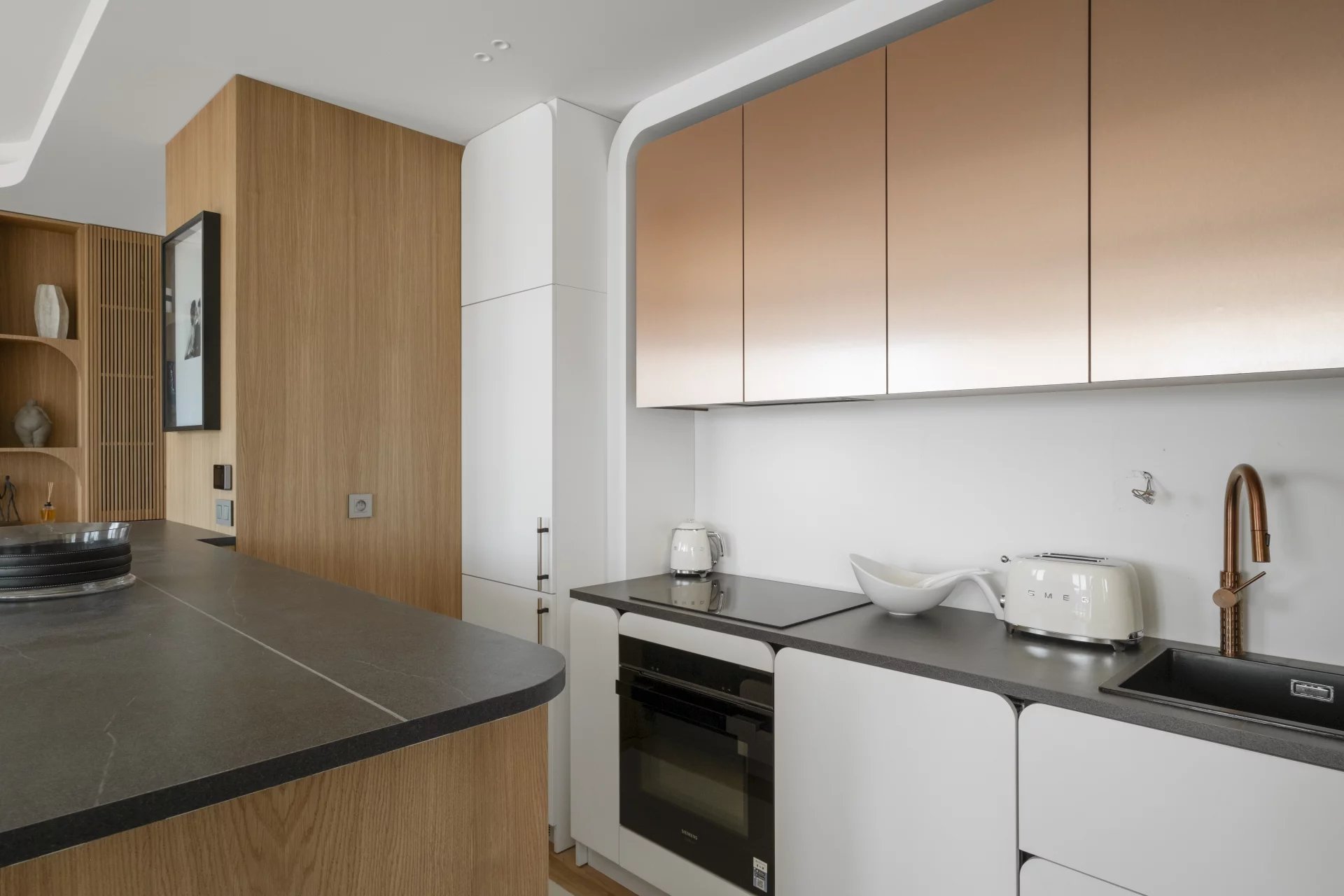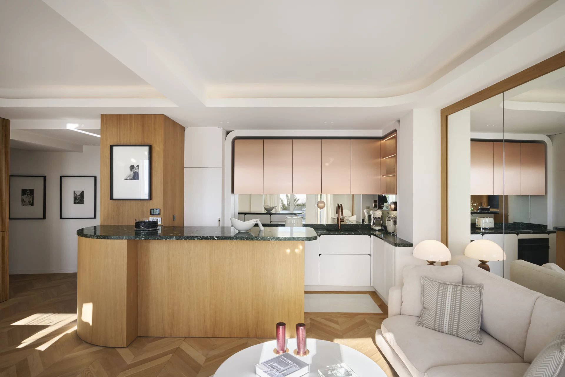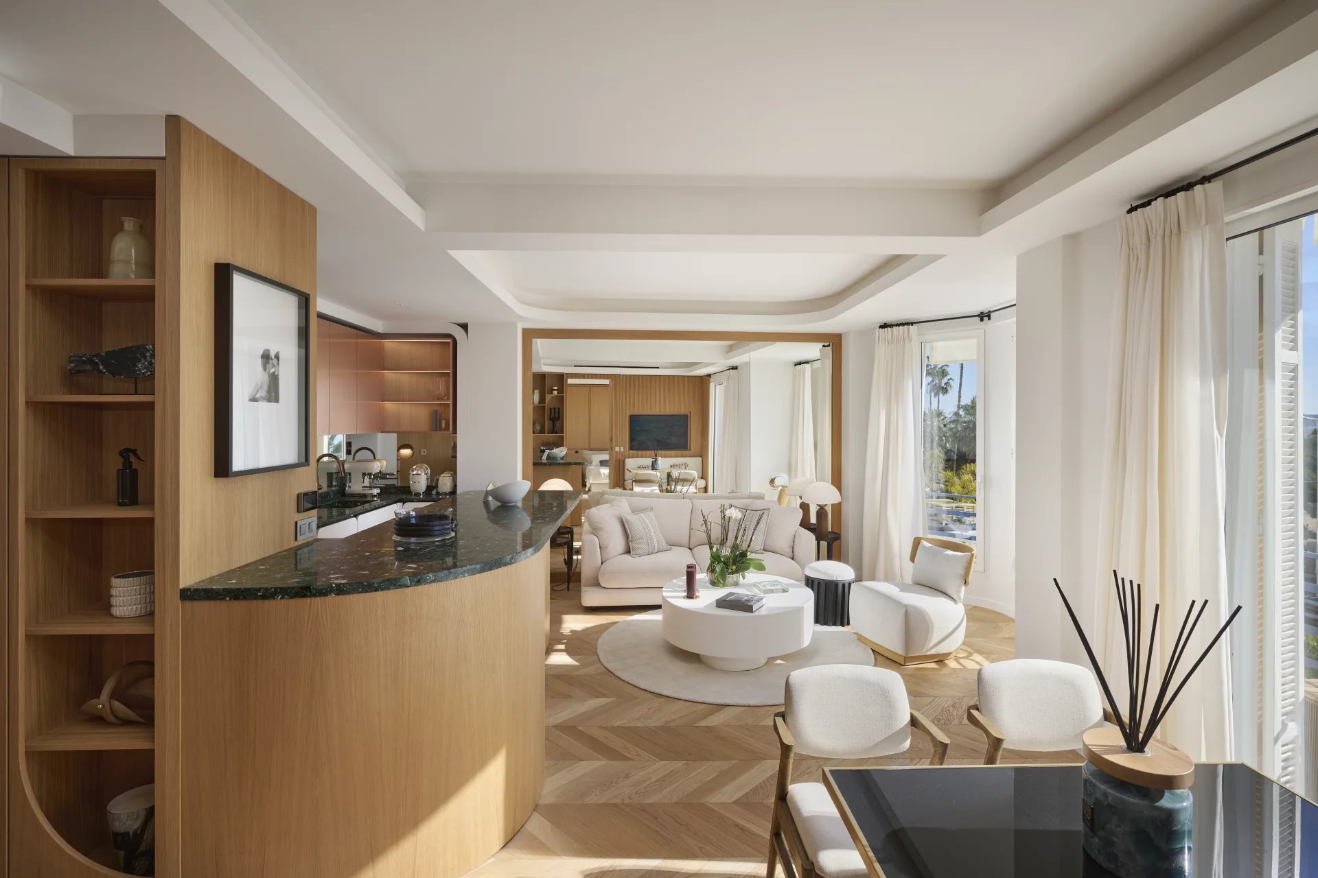 Ideally located on the Croisette, this apartment of approximately 66 m² includes: a living room, dining room opening onto a terrace, an American-style kitchen and two en-suite bedrooms with shower rooms. Very bright apartment.