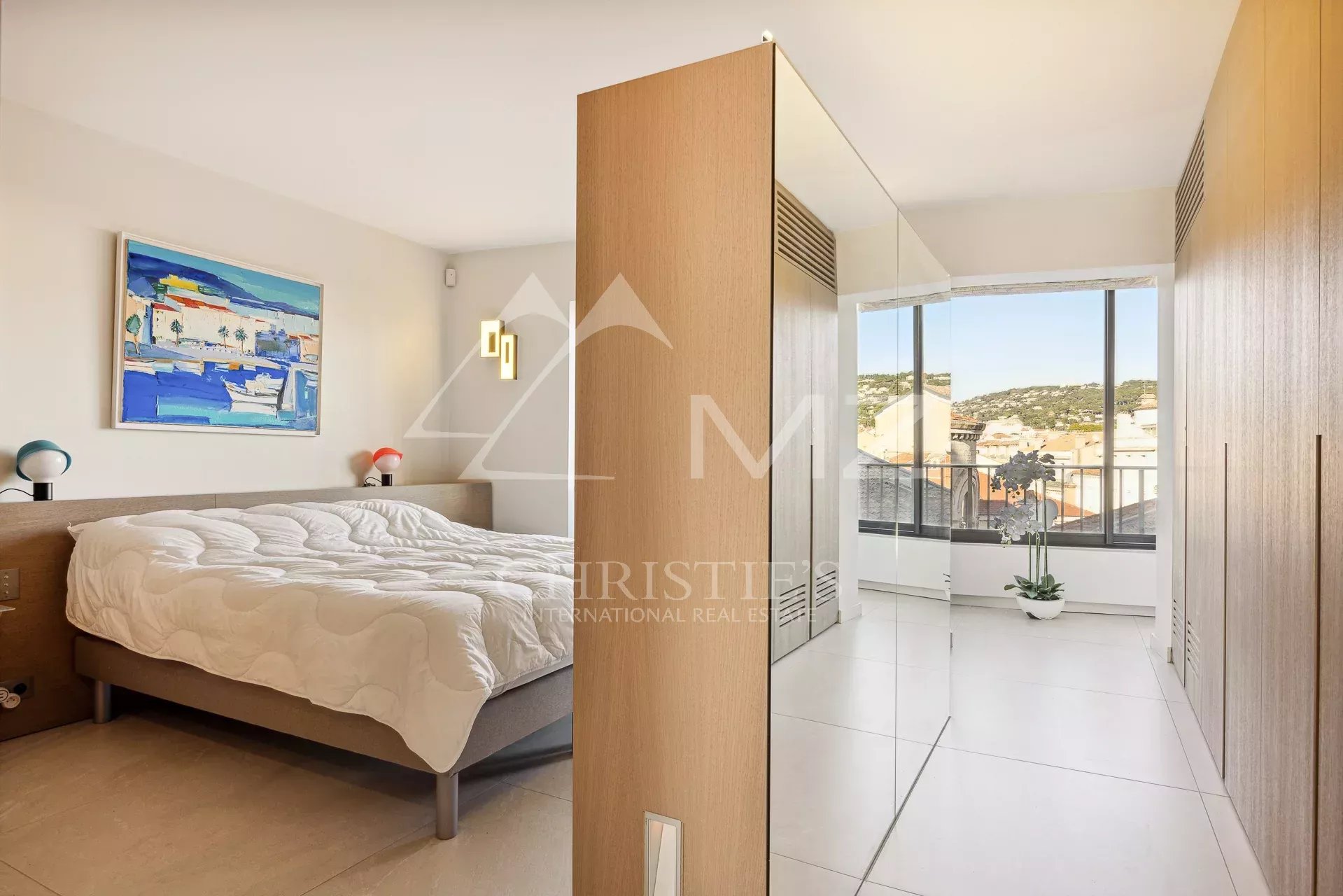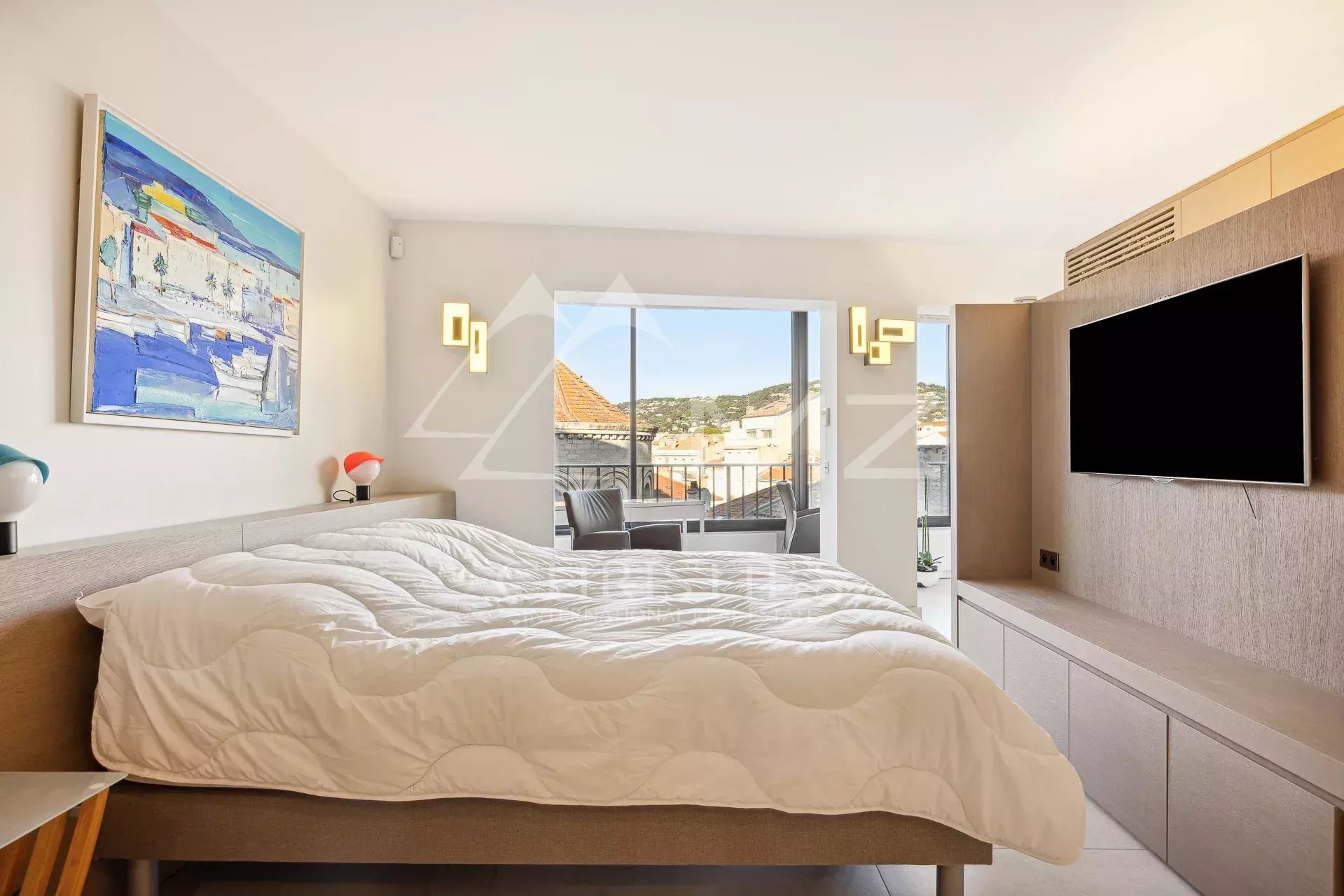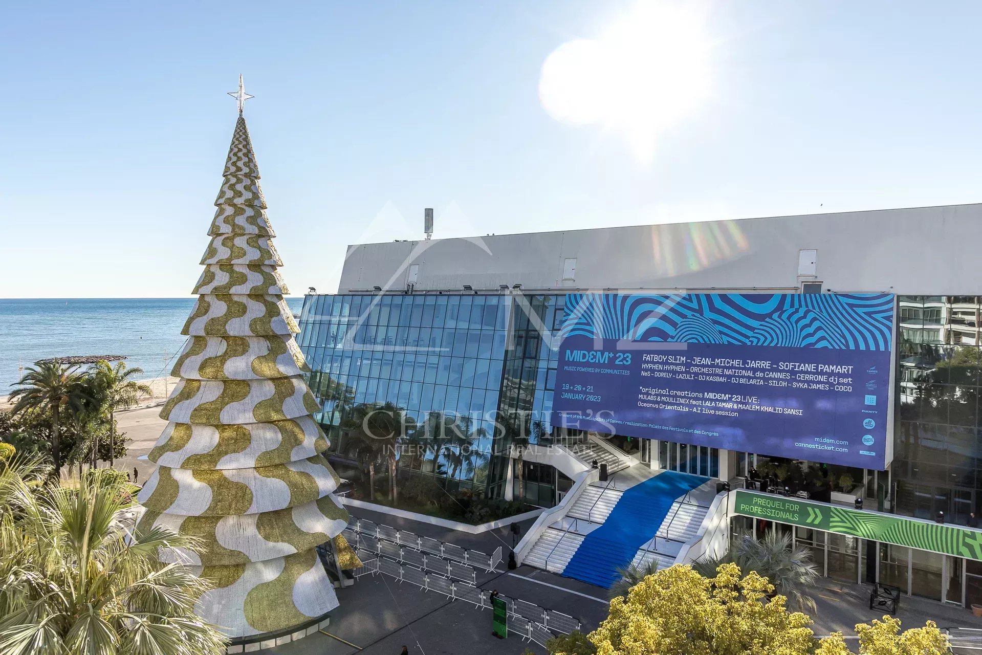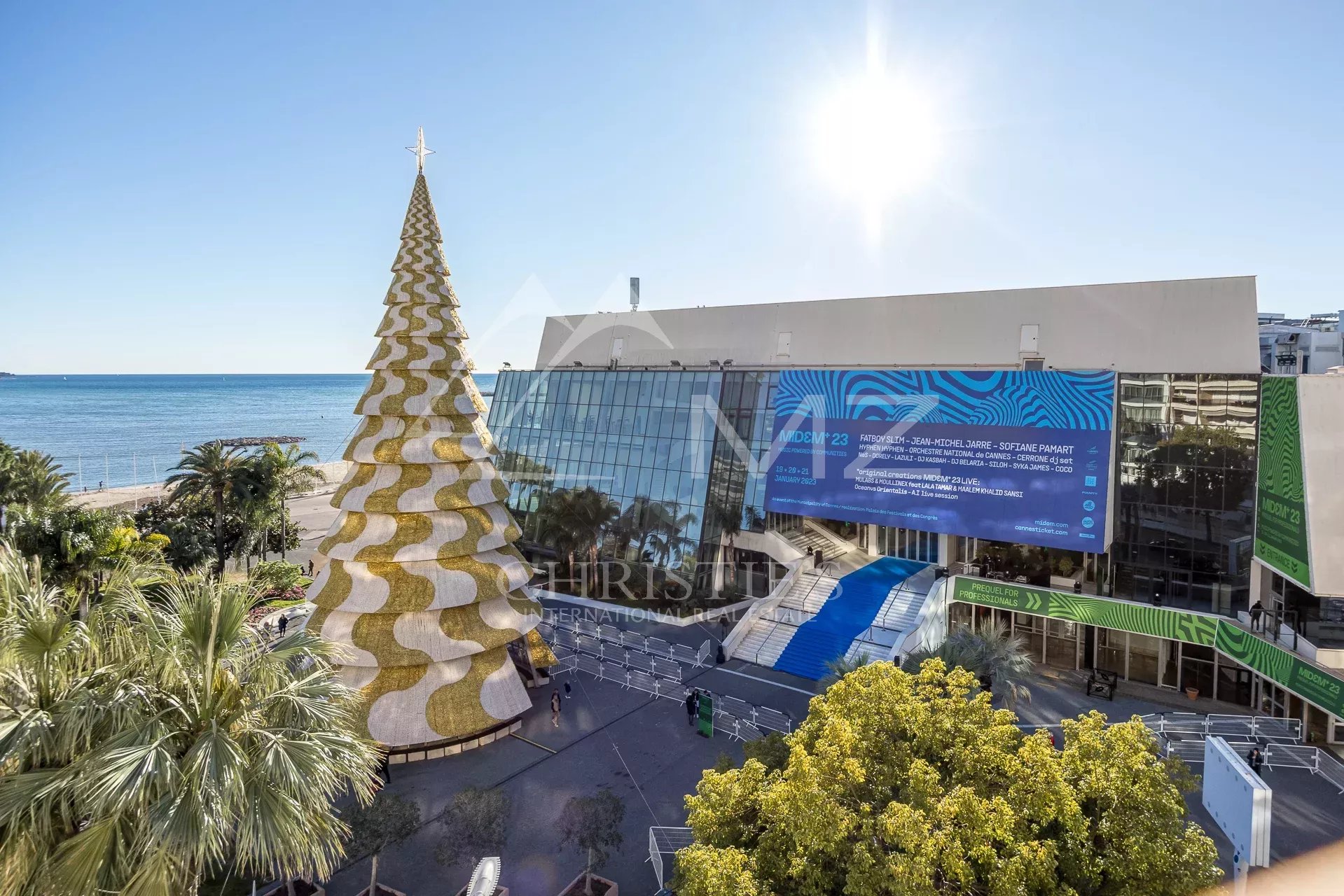 On the most beautiful street in Cannes, apartment of around 72 m2, comprising: an open fitted kitchen, a living room, lounge/, a bedroom, a shower room, a master bedroom en suite with a shower room. Laundry room. Terrace facing the Festival Palace. A box.