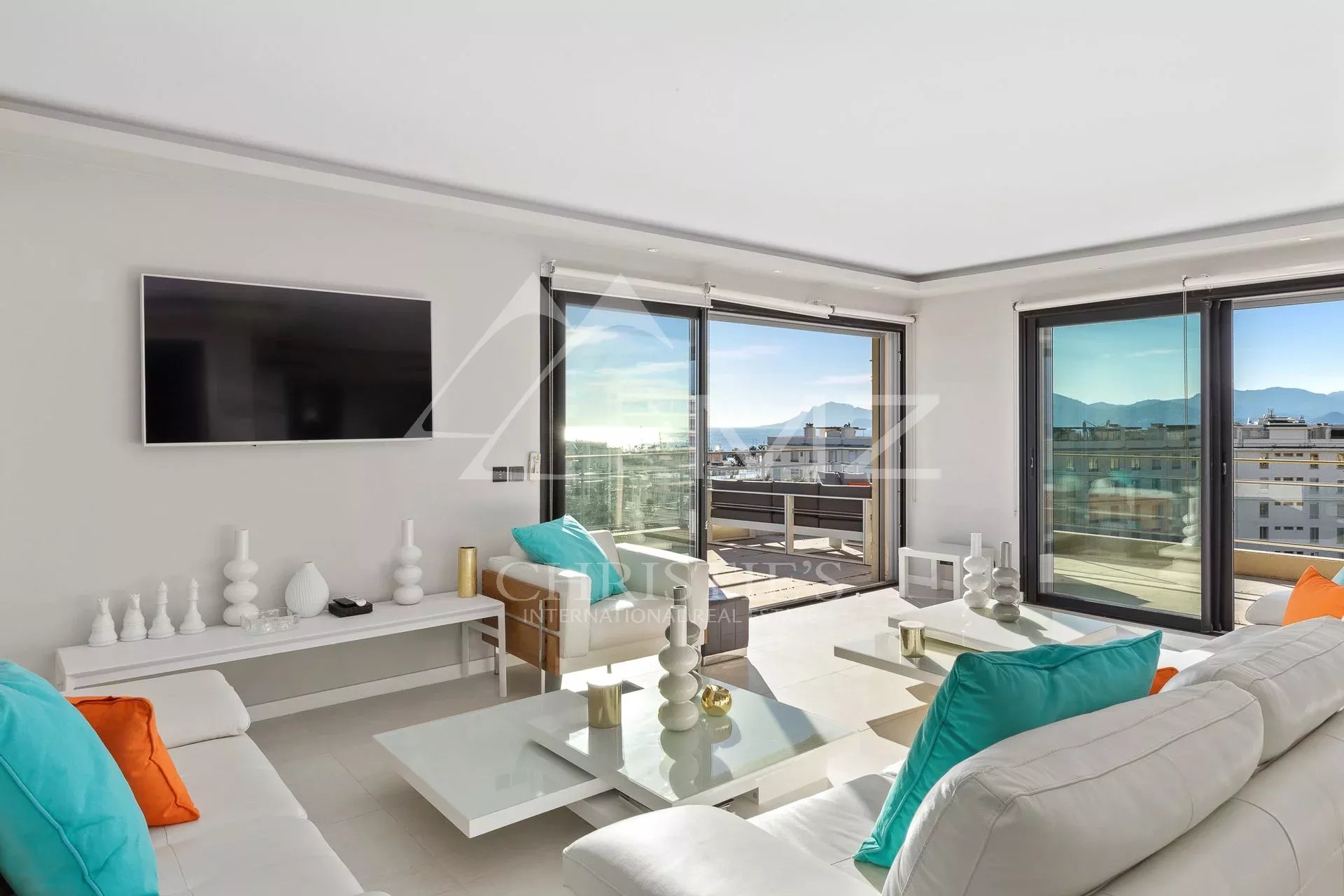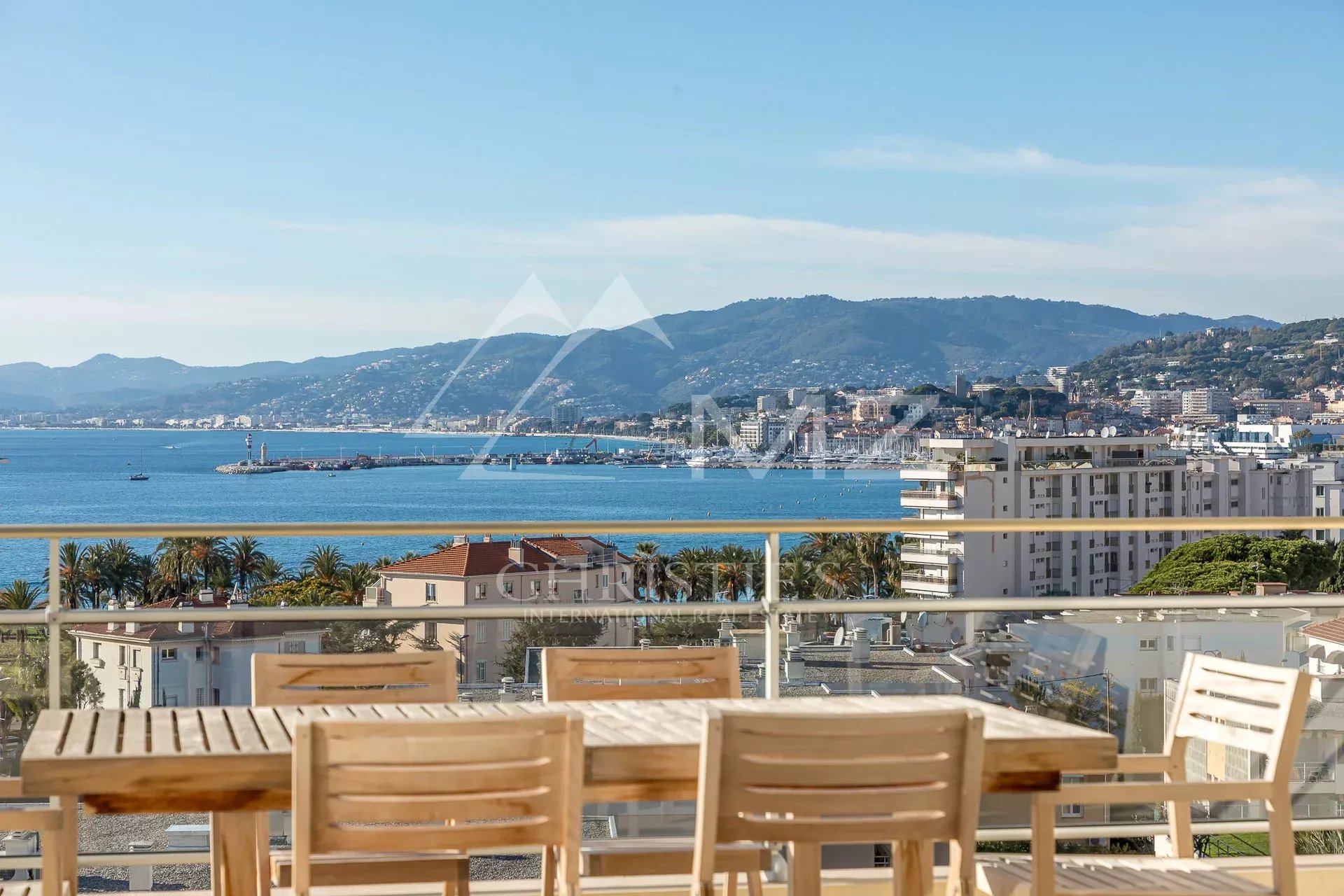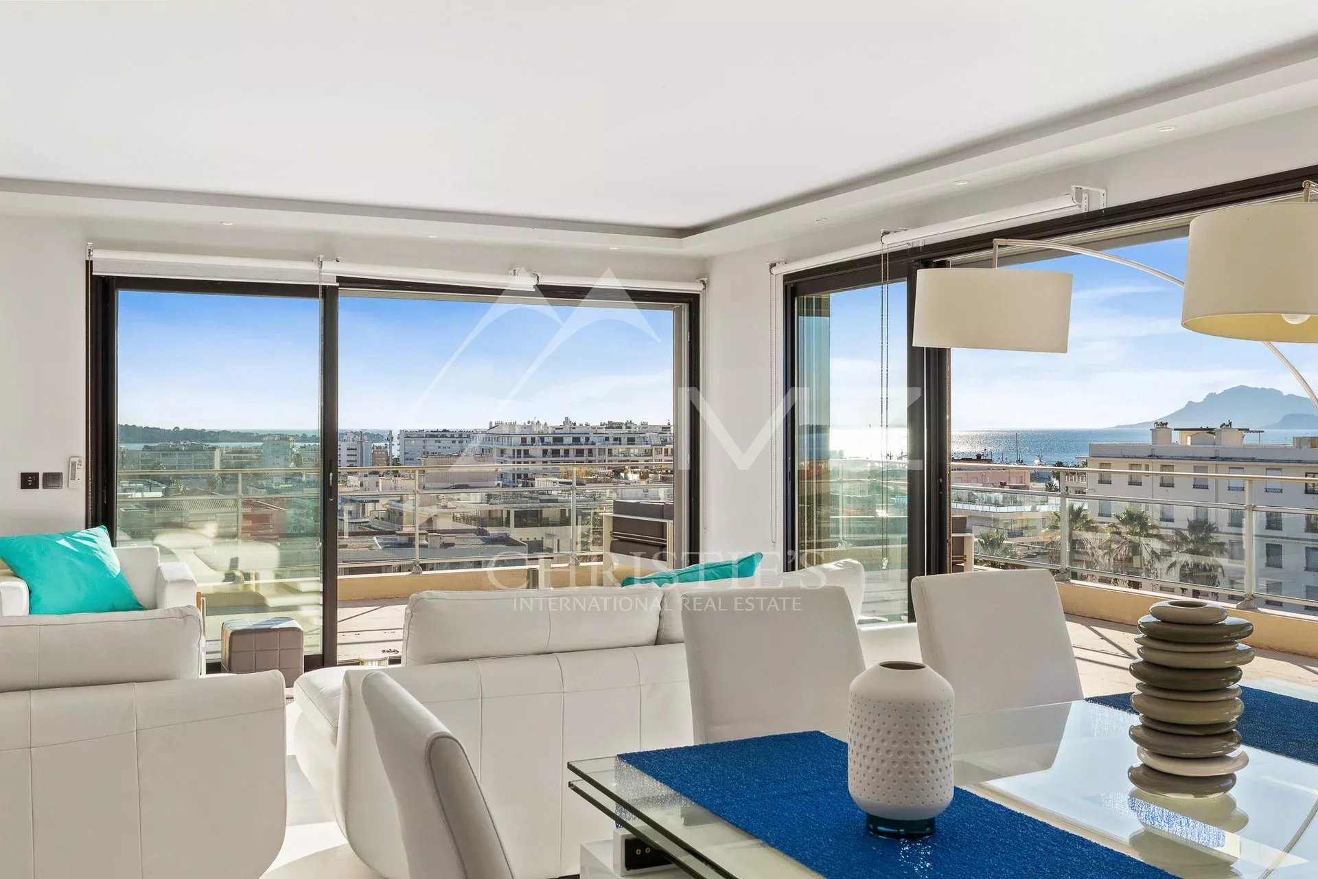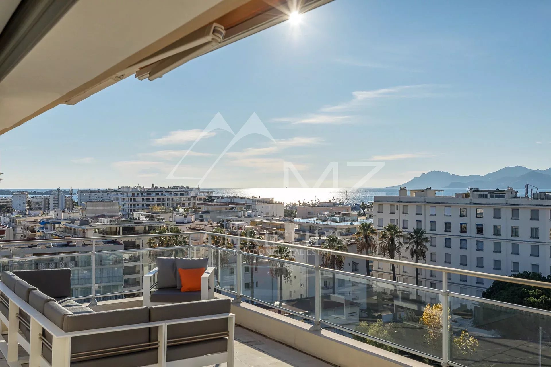 Situated on the top floor of a building close to Croisette, corner penthouse of approx. 170 sqm opening on a terrace of approx. 120 sqm with a sea view from the Cap d'Antibes to the bay of Cannes. Large corner living room with a fitted kitchen, 4 bedrooms, 2 underground parking spaces, cellar, a caretaker in the residence. Few minutes walk from the shops and Croisette beaches.