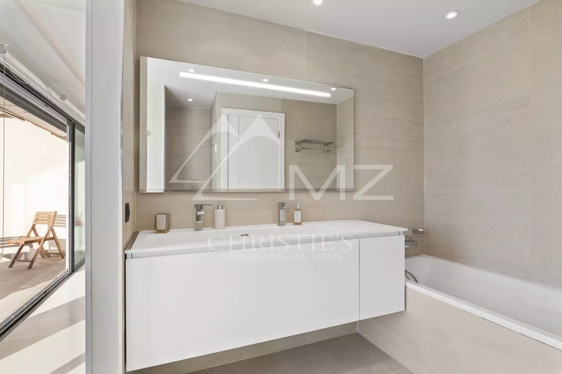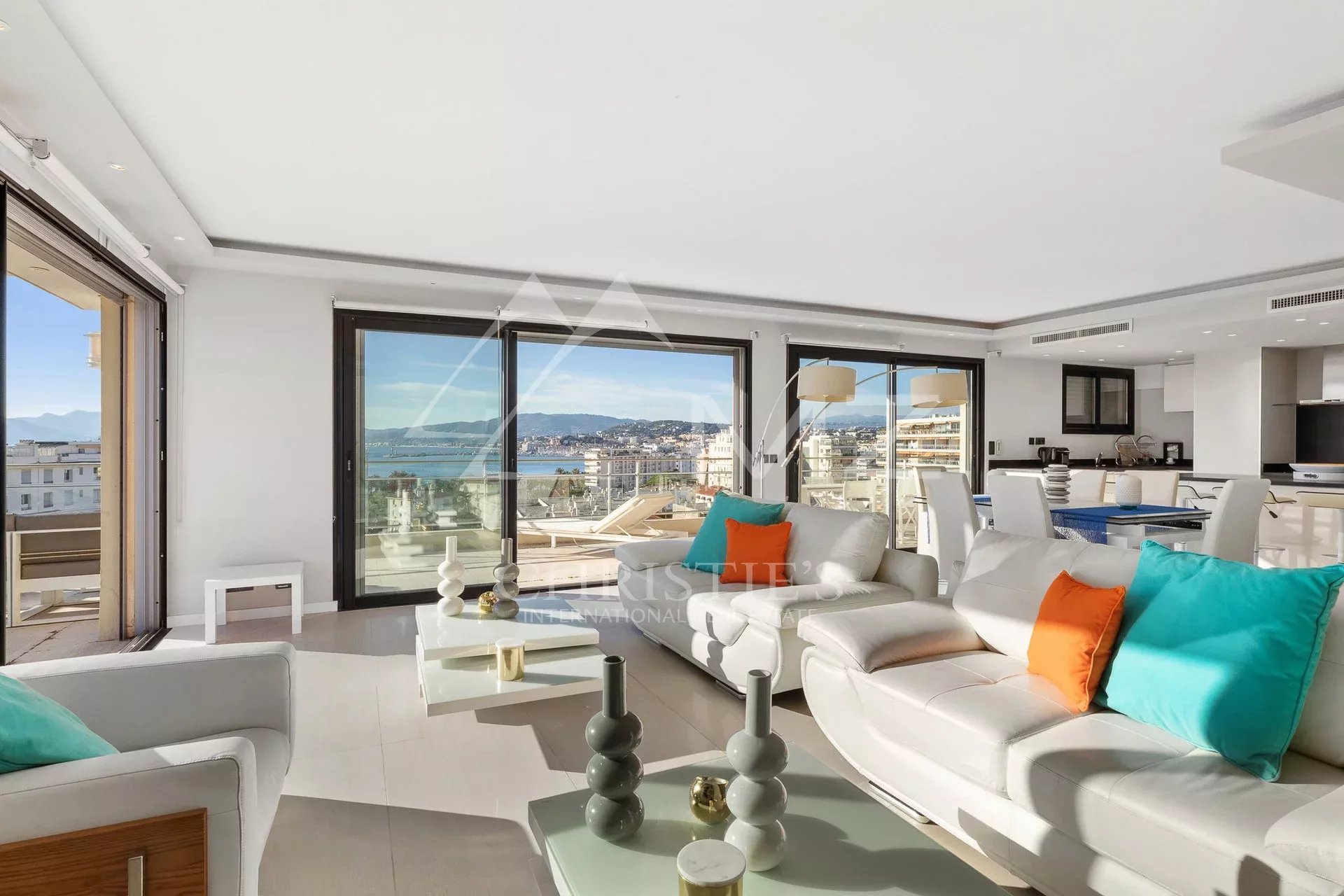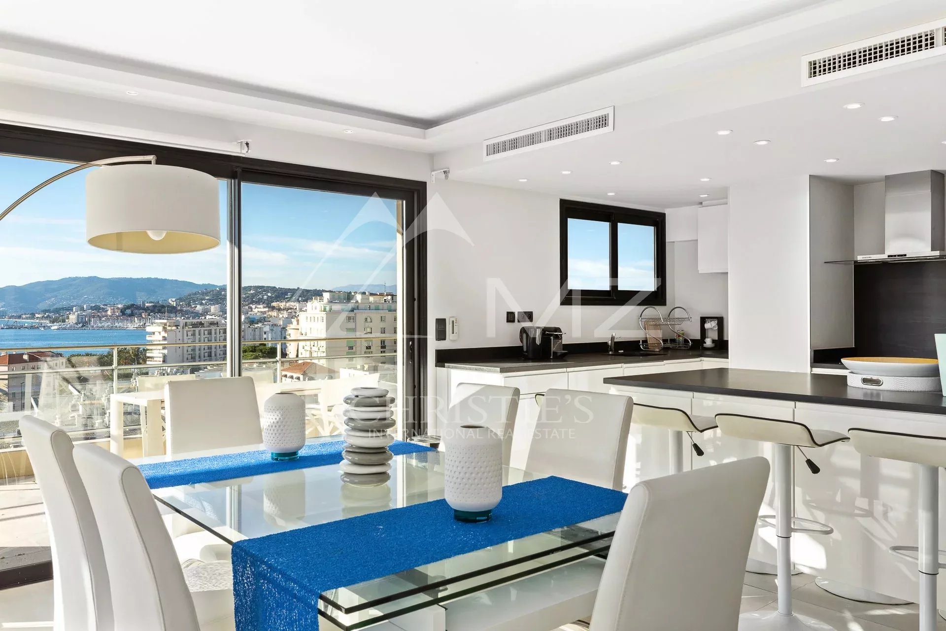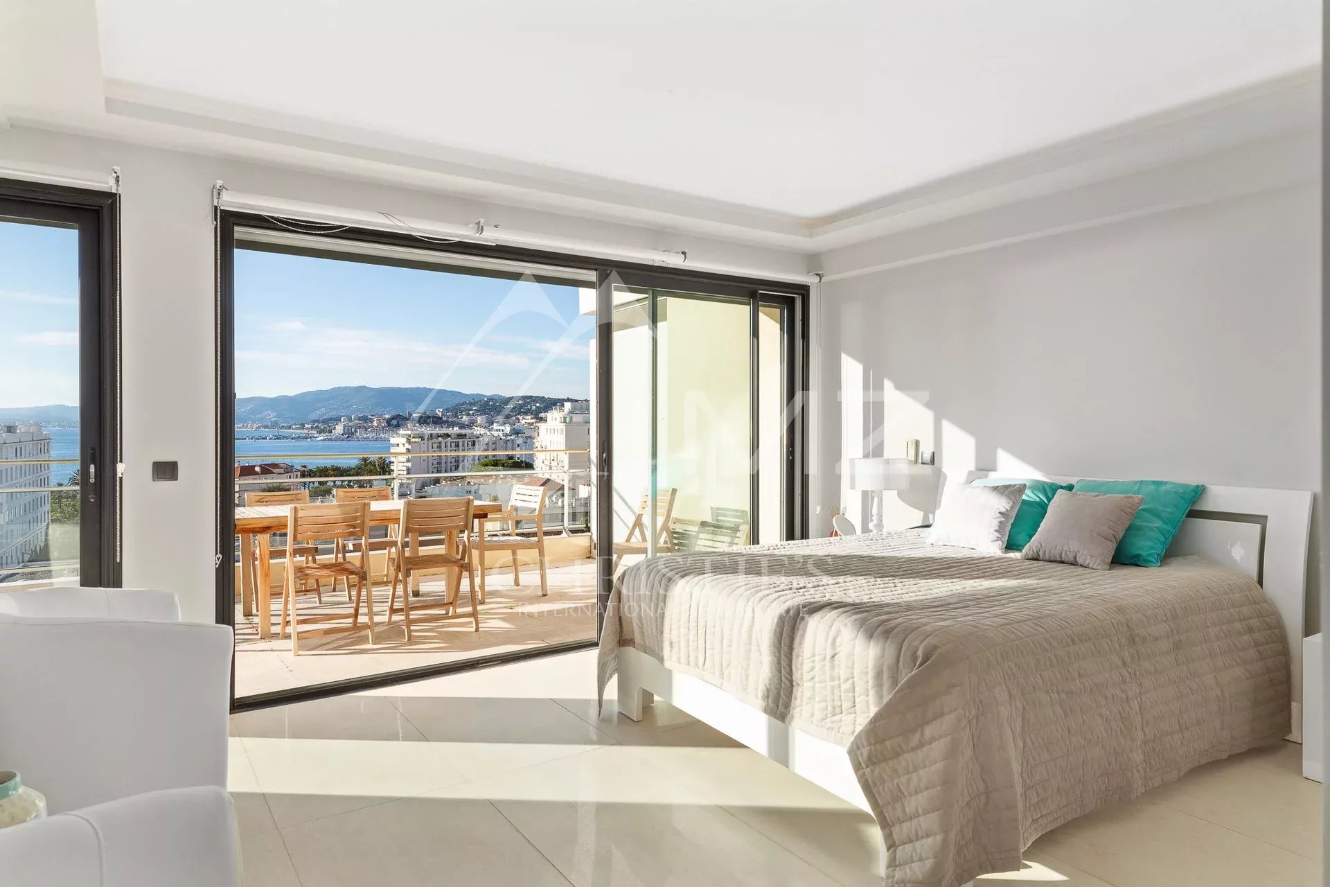 Situated on the top floor of a building close to Croisette, corner penthouse of approx. 170 sqm opening on a terrace of approx. 120 sqm with a sea view from the Cap d'Antibes to the bay of Cannes. Large corner living room with a fitted kitchen, 4 bedrooms, 2 underground parking spaces, cellar, a caretaker in the residence. Few minutes walk from the shops and Croisette beaches.