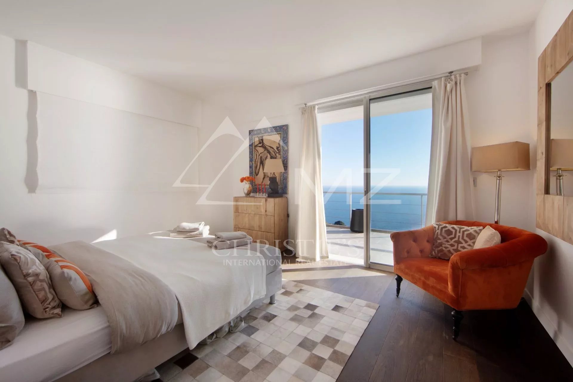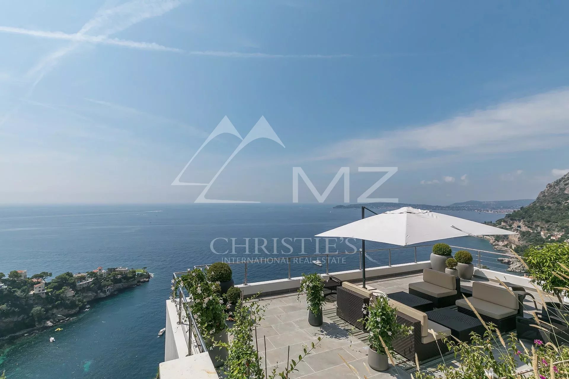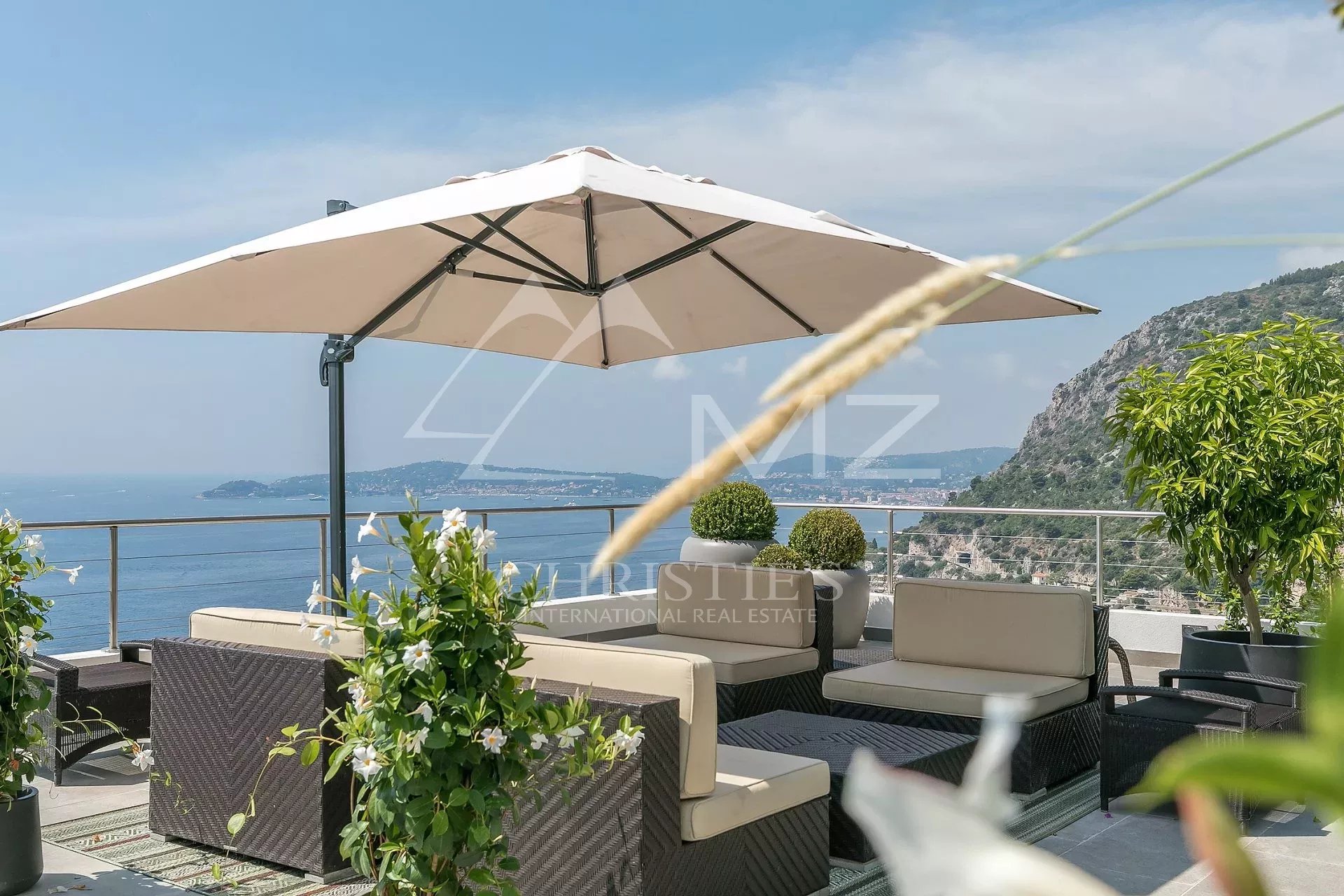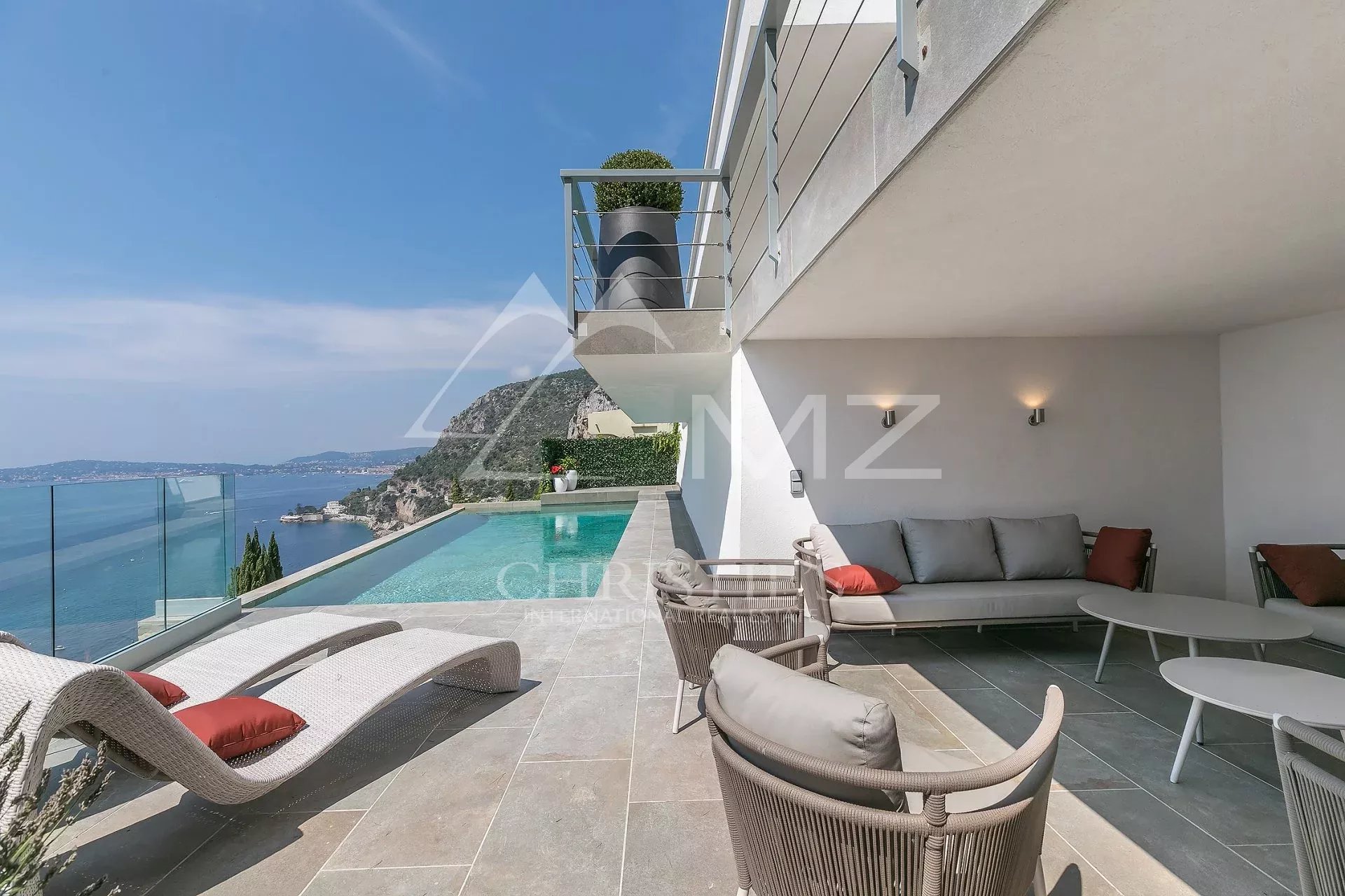 Exceptional location, a few minutes from Monaco in the heart of a small gated domain for this modern villa completely renovated. It benefits from breathtaking views of the Mala Beach and the peninsula of Saint Jean Cap Ferrat. Living / dining area with open-plan kitchen, 4 ensuite bedrooms including Master bedroom, several terraces, and relaxation areas, beautiful overflowing pool. 3 parkings and a garage.
