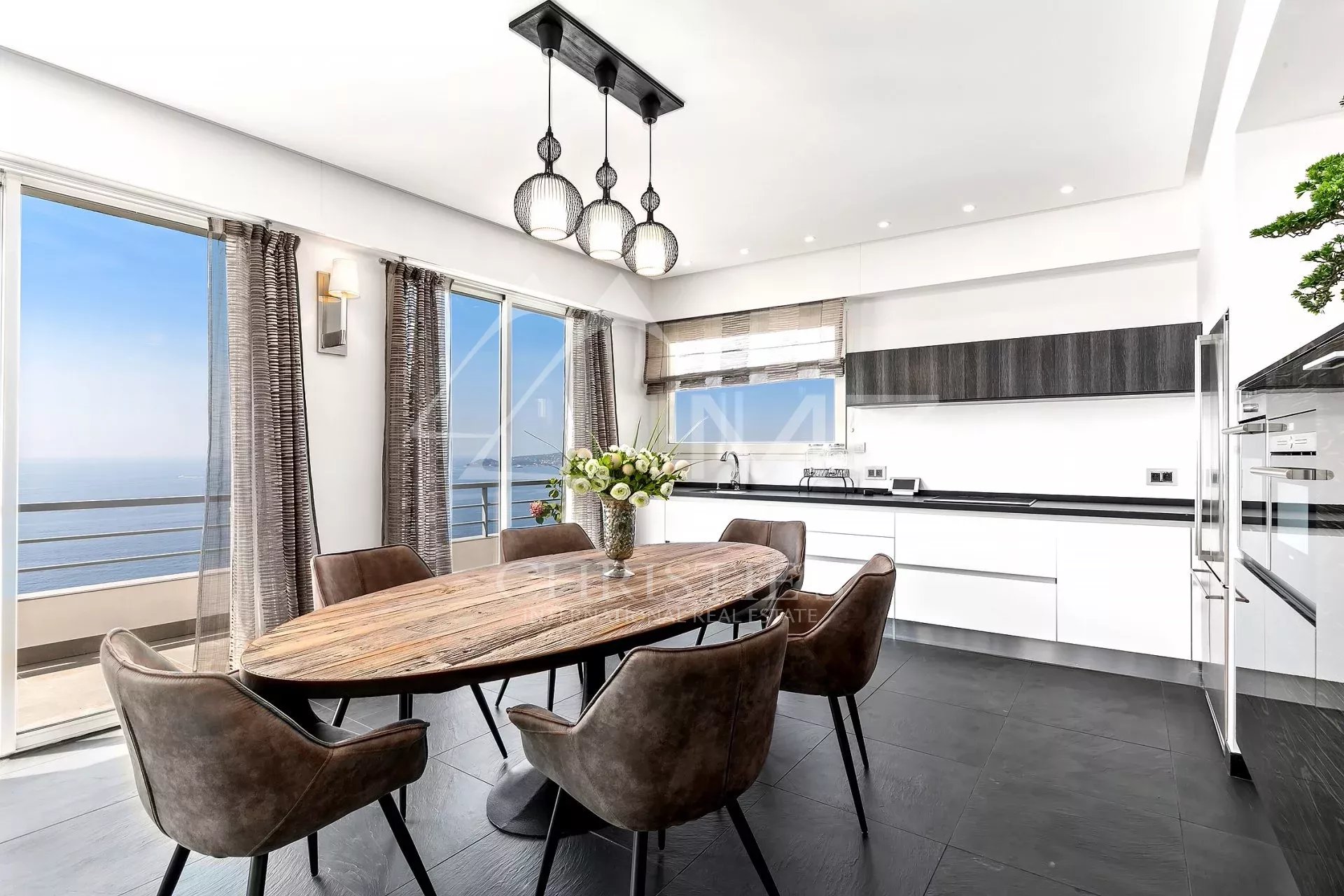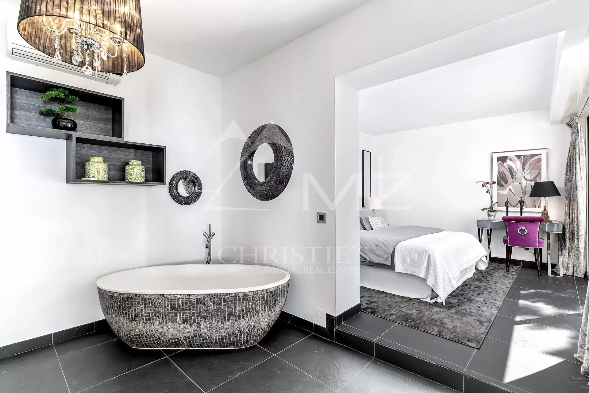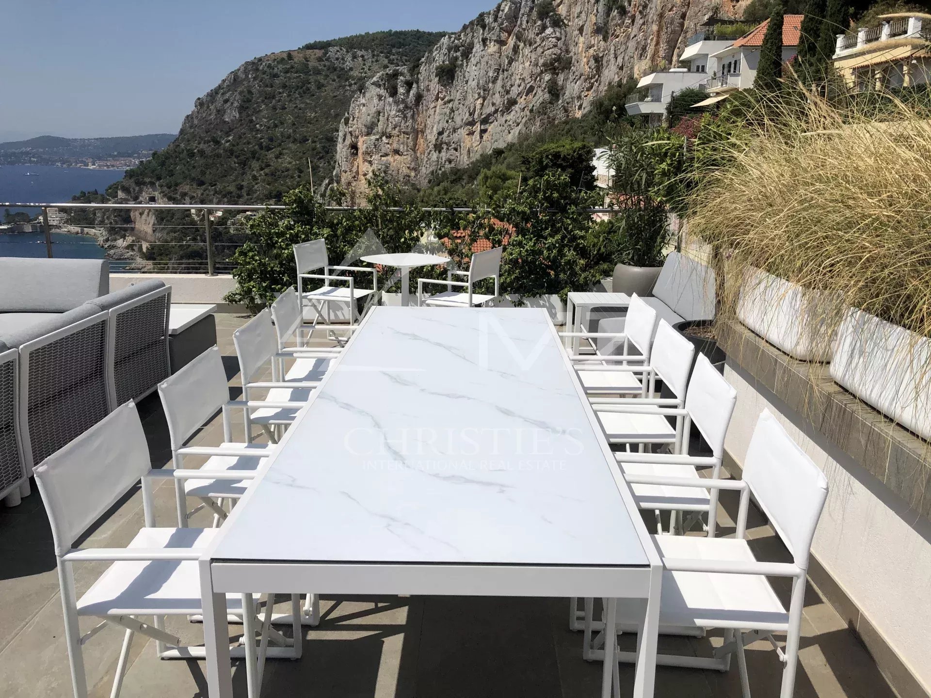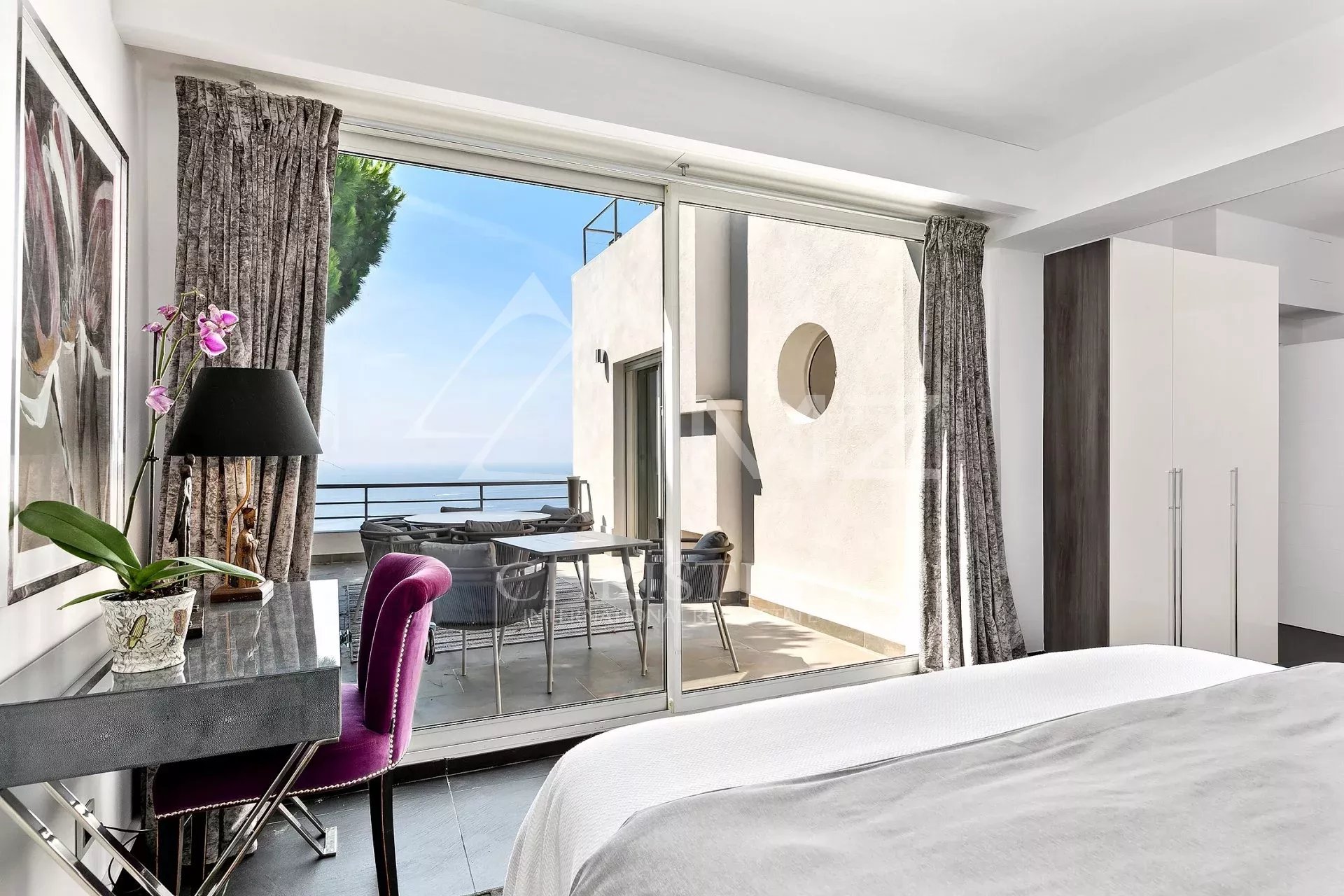 Exceptional location, a few minutes from Monaco in the heart of a small gated domain for this modern villa completely renovated. It benefits from breathtaking views of the Mala Beach and the peninsula of Saint Jean Cap Ferrat. Living / dining area with open-plan kitchen, 4 ensuite bedrooms including Master bedroom, several terraces, and relaxation areas, beautiful overflowing pool. 3 parkings and a garage.